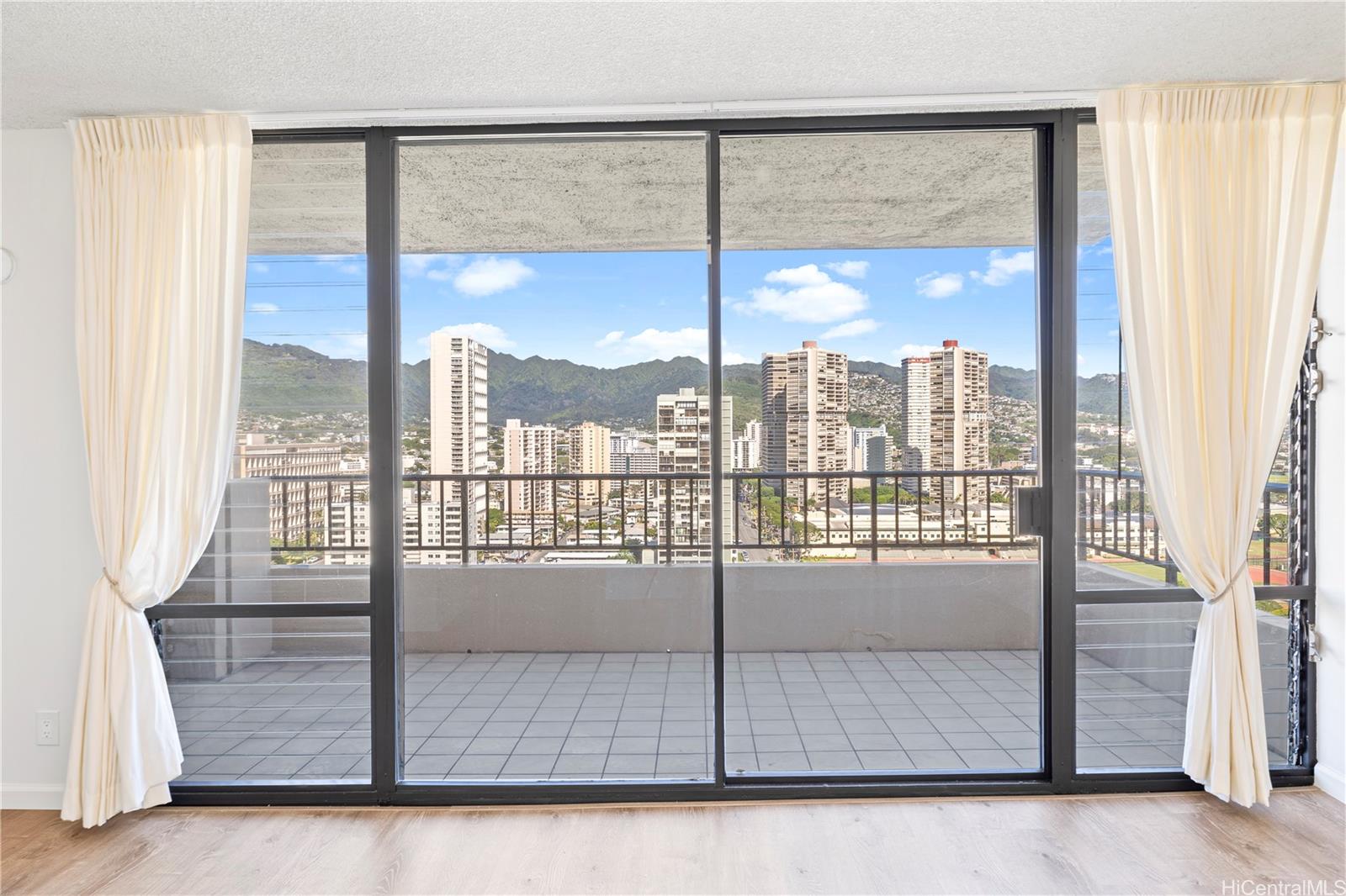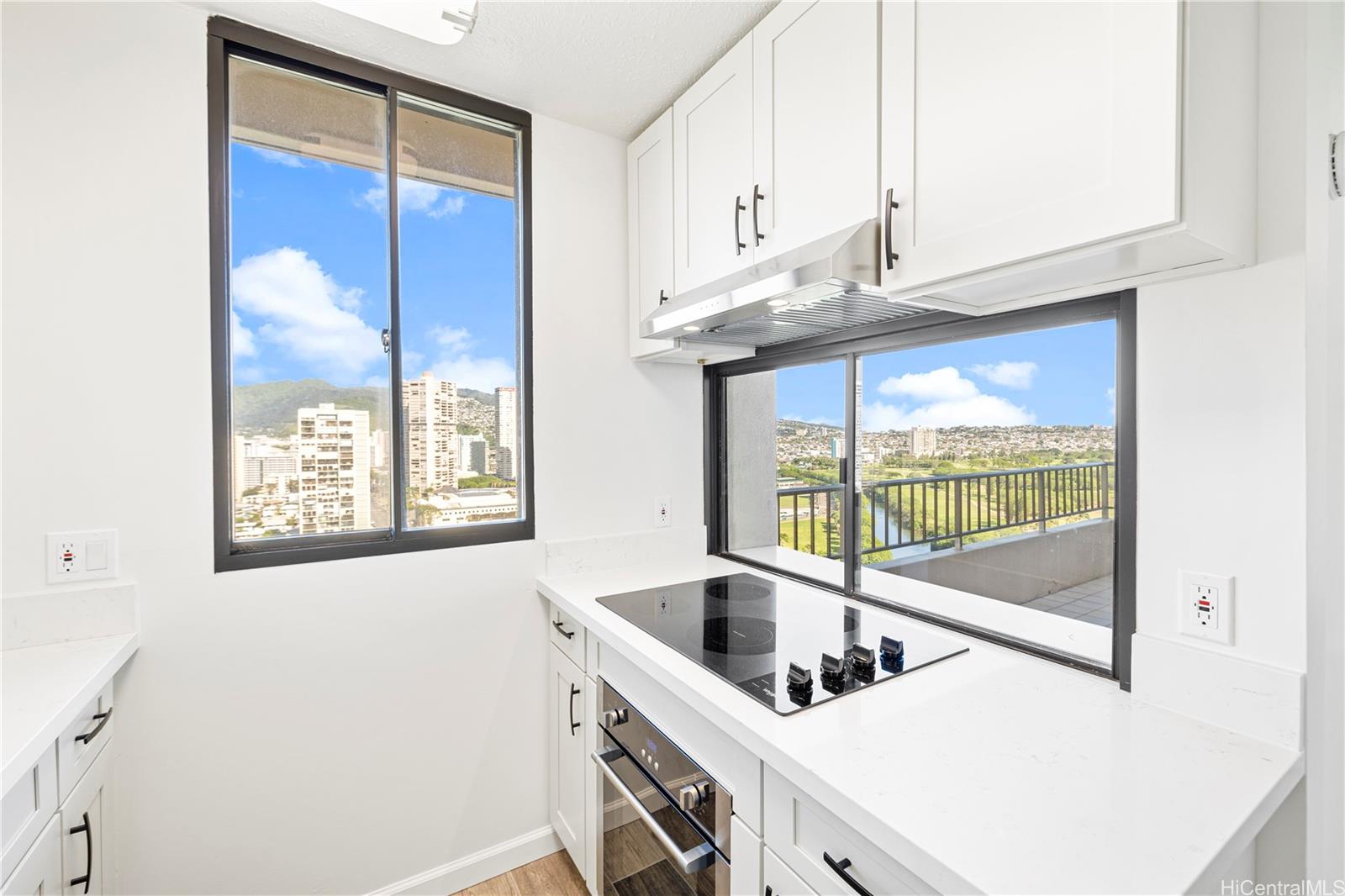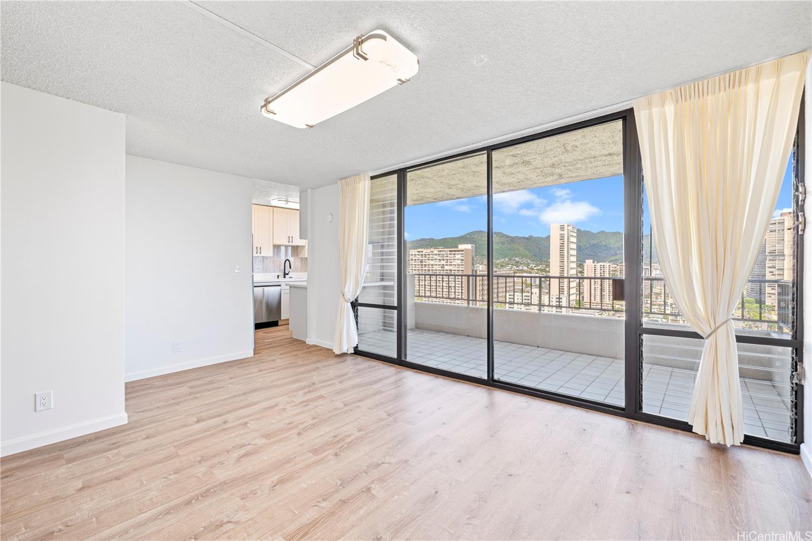 Enjoy sweeping mountain and city views from this thoughtfully renovated corner unit at 2121 Ala Wai. Positioned to benefit from cool tradewinds flowing from the valley, this 2-bedroom, 1-bath residence was fully remodeled in 2023 with quality finishes and a refreshed layout. The corner location provides added privacy and enhanced natural light. Features include an updated kitchen and bathroom, open-concept living area, and a covered parking stall. The building offers a secure entry, pool, sauna, BBQ area, and 24-hour security. Don’t miss this opportunity to experience comfortable island living in the heart of Waikiki.