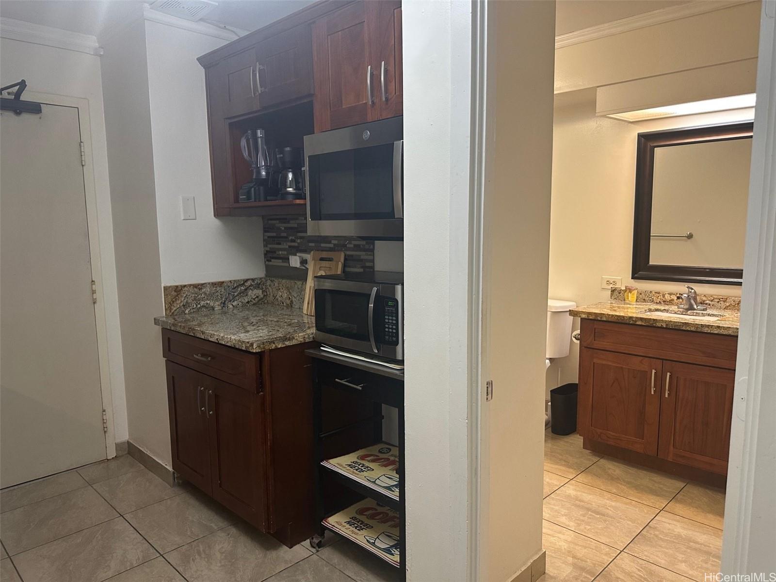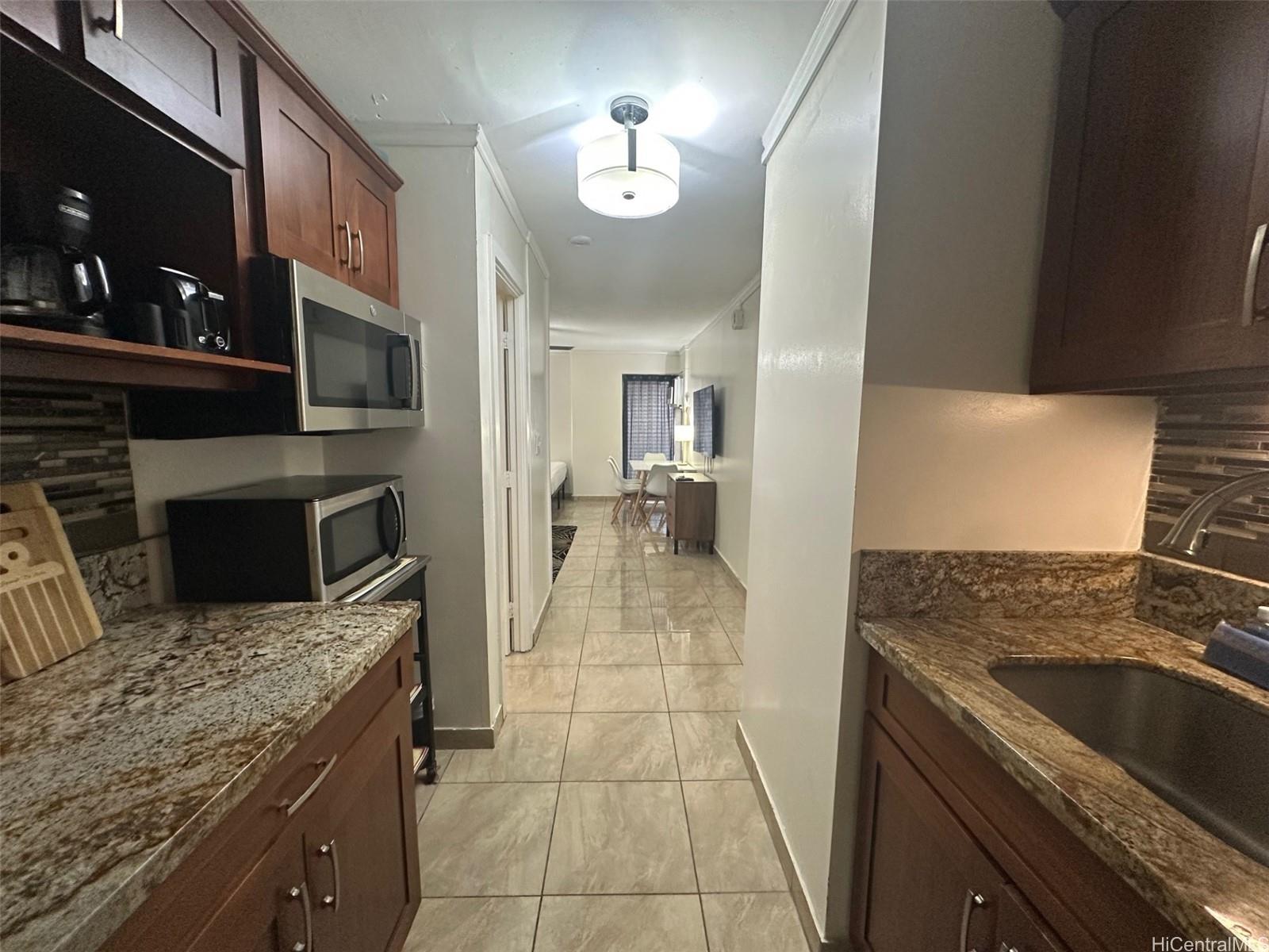 Versatile 2-bedroom, 2-bath unit thoughtfully configured as two separate living spaces: a studio, and a one-bedroom unit with a full kitchen—ideal for residential living and/or excellent income opportunities for legal vacation rentals. Flexibility is yours! Features include ceramic tile flooring, granite countertops, stainless steel appliances, tiled backsplash and includes furniture and accommodation essentials. Resident manager on site. Enjoy the best of island living with easy access to Waikiki’s many local events, dining, and entertainment, plus the world-famous Waikiki Beach just 2 blocks away.