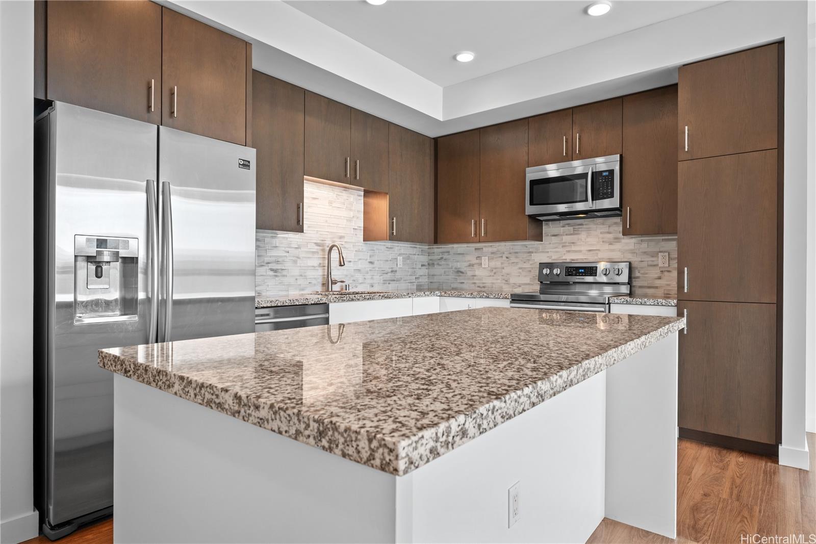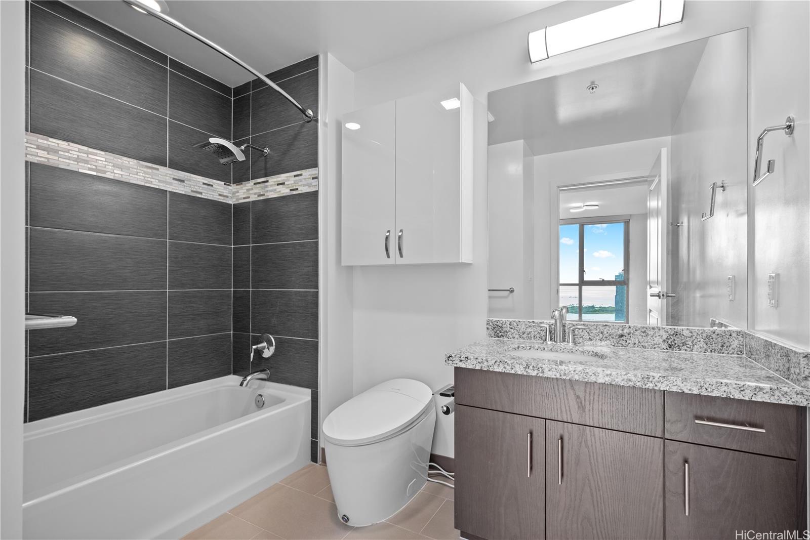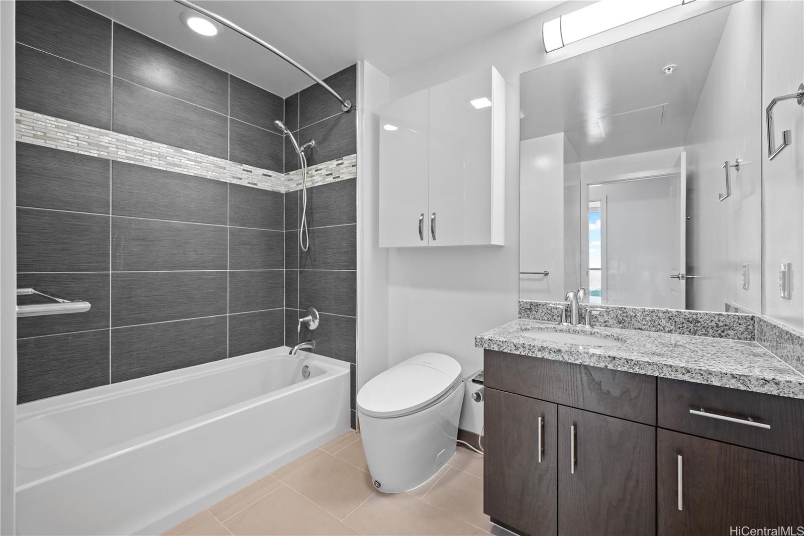 Enjoy Life on the Top Floor! Experience modern urban living in this beautifully upgraded penthouse residence, featuring 9-foot ceilings, luxury vinyl flooring throughout, motorized blinds and custom lighting. The open-concept layout includes a spacious living room, stylish kitchen island with upgraded kitchen backsplash, upgraded bathroom tile and cabinetry, smart toilets, and a custom-built desk and storage system in the primary bedroom. Stay comfortable year-round with split A/C units in every room. Located in the heart of Ward Village, you’re just minutes away from Whole Foods, movie theaters, popular restaurants, and Ala Moana Beach Park. Amenities galore, including a bbq area, recreation and karaoke rooms, conference and theater rooms, outdoor playground, children’s playroom, fitness center, yoga room, and more. Enjoy added convenience with a spacious storage room right down the hall, an additional storage locker on the 3rd floor (same level as your parking), and two full-size, side-by-side parking stalls. Move-in ready—your penthouse lifestyle awaits!