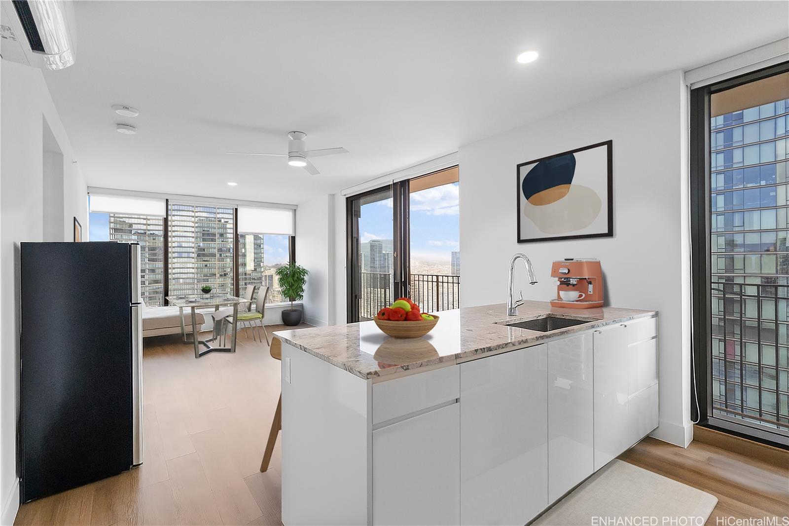 Built by award-winning firm Solomon Cordwell Buenz, with interiors by Hall of Fame designer Lauren Rottet. Experience urban island living at its finest in this stylish studio at ‘A‘ali‘i in Ward Village. Enjoy resort-style amenities including a rooftop sky deck, lap pool, fitness center, theater, guest suites, and direct access to Whole Foods Market. Conveniently located near Ala Moana Beach Park, world-class shopping, dining, and entertainment. Ideal as a primary home, vacation retreat, or investment opportunity in one of Honolulu’s most sought-after communities. Virtually staged few photos and selling AS IS.