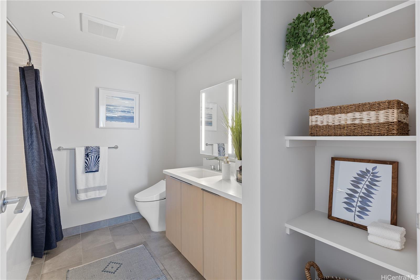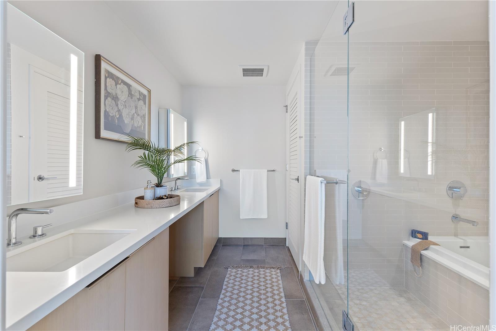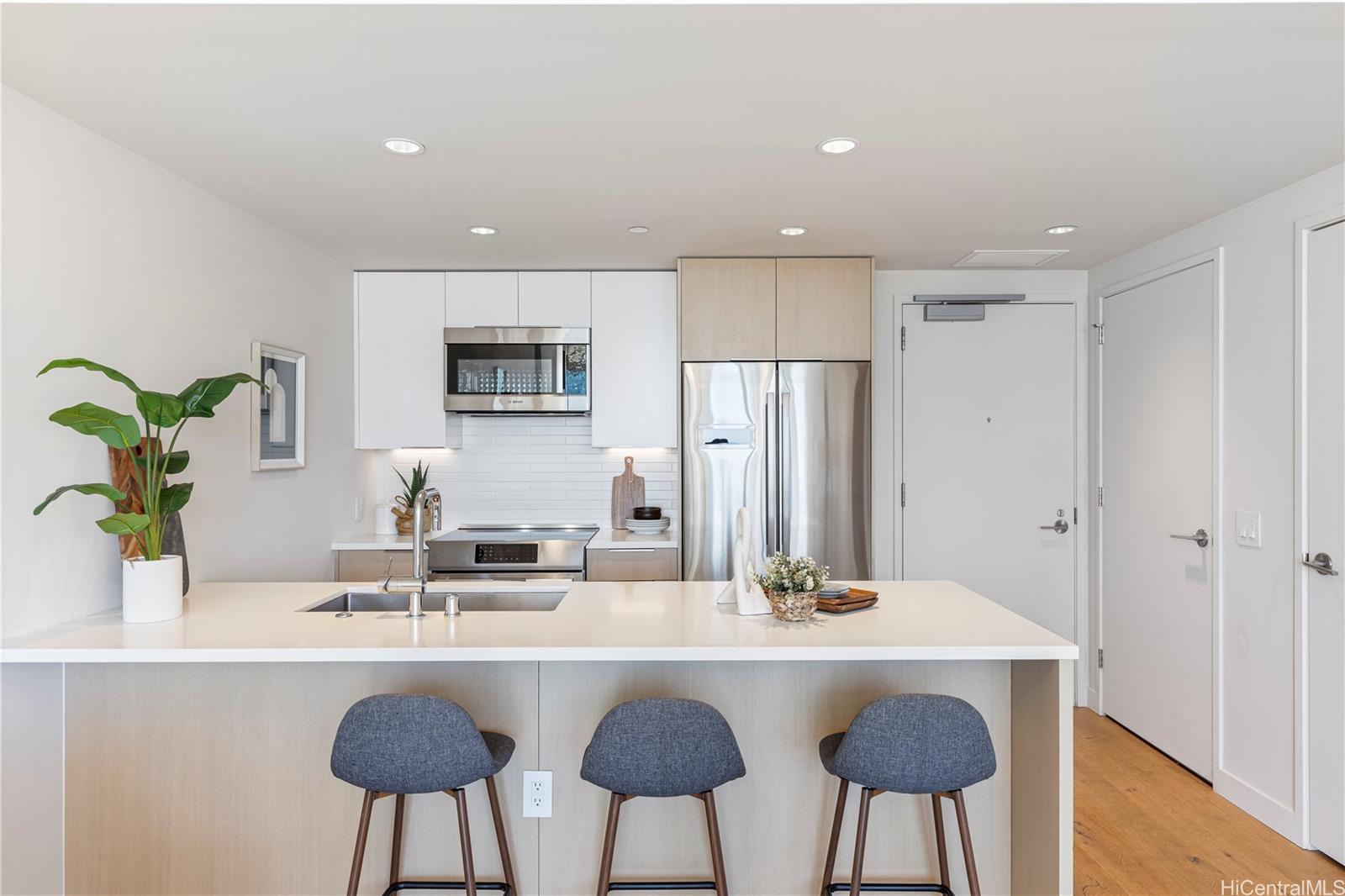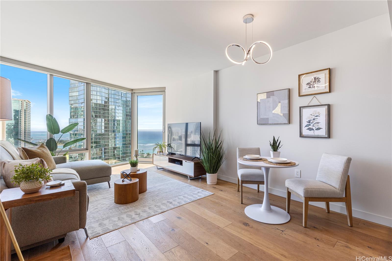 Price adjustment, motivated sellers! Best value in Kakaako-Ward Village! Elevate your lifestyle in this stunning high-floor residence at A‘eo in vibrant Kaka‘ako! Perched on the 25th floor, this spacious, pet-friendly condo is bathed in natural light and showcases sweeping ocean views. Recently painted and meticulously cared for, the unit is part of a sought-after stack featuring a smart, functional layout—including a pantry for extra storage.Enjoy the convenience of two tandem parking stalls on the same level as Whole Foods, making everyday errands effortless.A‘eo offers an impressive collection of resort-style amenities: relax on the rooftop sky deck, take a dip in one of the pools, unwind in the Jacuzzi, sauna, or steam room, and entertain in style with BBQ cabanas, private dining rooms, a theater, and karaoke lounge. Other highlights include a state-of-the-art fitness center, playground, dog park, guest suites, and more.Step outside and walk to the beach, world-class shopping, dining, cafes, fitness studios, and entertainment—all just minutes from your door in Honolulu’s thriving urban core. Contact your favorite Realtor today and experience luxury island living!