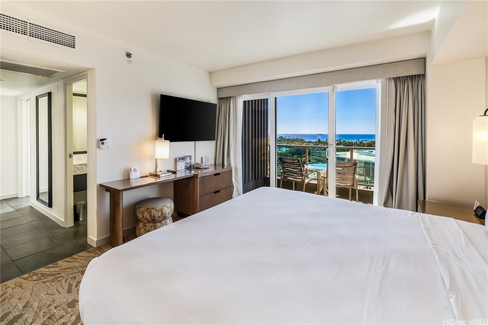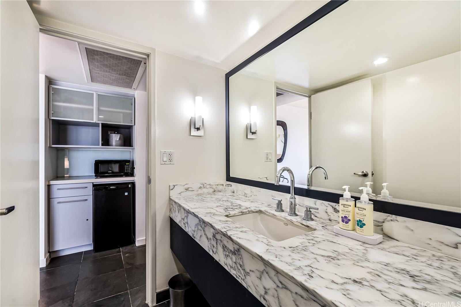 1 bedroom Ocean Suite, Must see view parallel to coastline! Full kitchen with refrigerator, dishwasher, sink, cooktop burner, and microwave. Grandfathered Short Term Rental: Self-Manage/Hire Onsite Property MGR or 3rd Party Property MGR. MUST SEE! Elegant island-style hotel condo, just steps away from Ala Moana Center and Ala Moana Beach Park. Turn key vacation rental. Maintenance Fee includes internet, cable TV, electricity, A/C, and water. Flexible floor plan with 2 entry doors and a pocket door to close the living room.