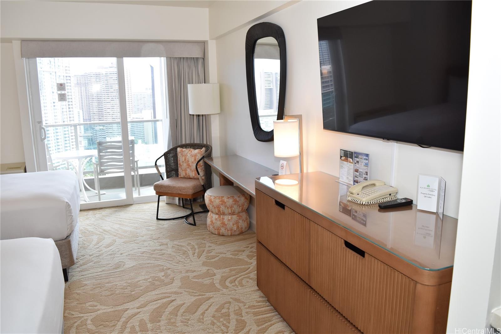 Enjoy elegant style living in this condo-hotel. 24th floor partial ocean studio unit. Adjacent to Ala Moana shopping Center with over 350 shops and restaurants. Located a block away from Ala Moana Beach Park and two blocks from the Convention Center. Use for your personal getaways or place in the vacation rental program. Guests can enjoy resort style amenities such as pool, fitness center, sauana, on-site dining, meeting rooms and complementary wo-fi. Maintenance fee includes interent, cable TV, electricity, A/C and water.