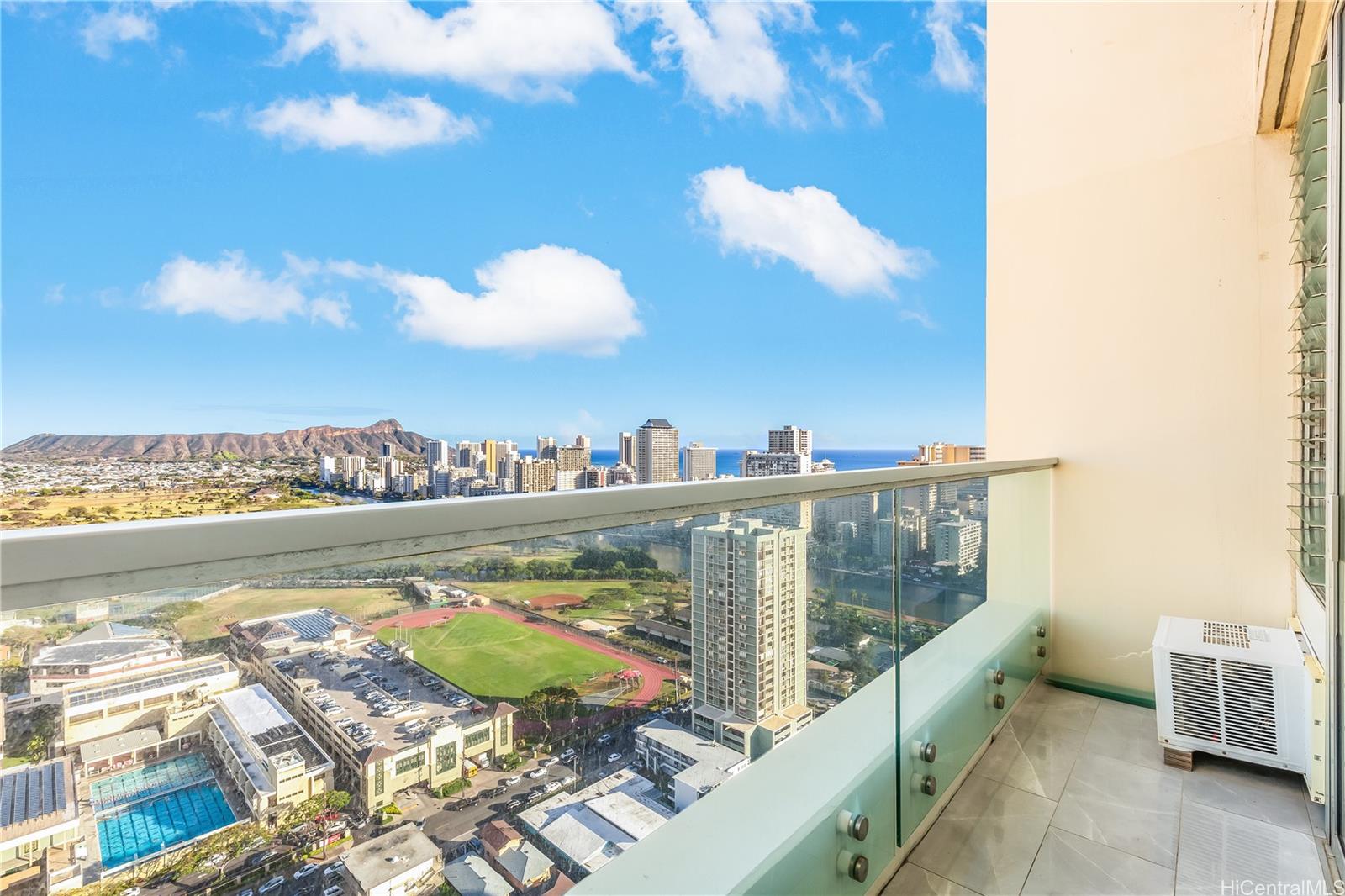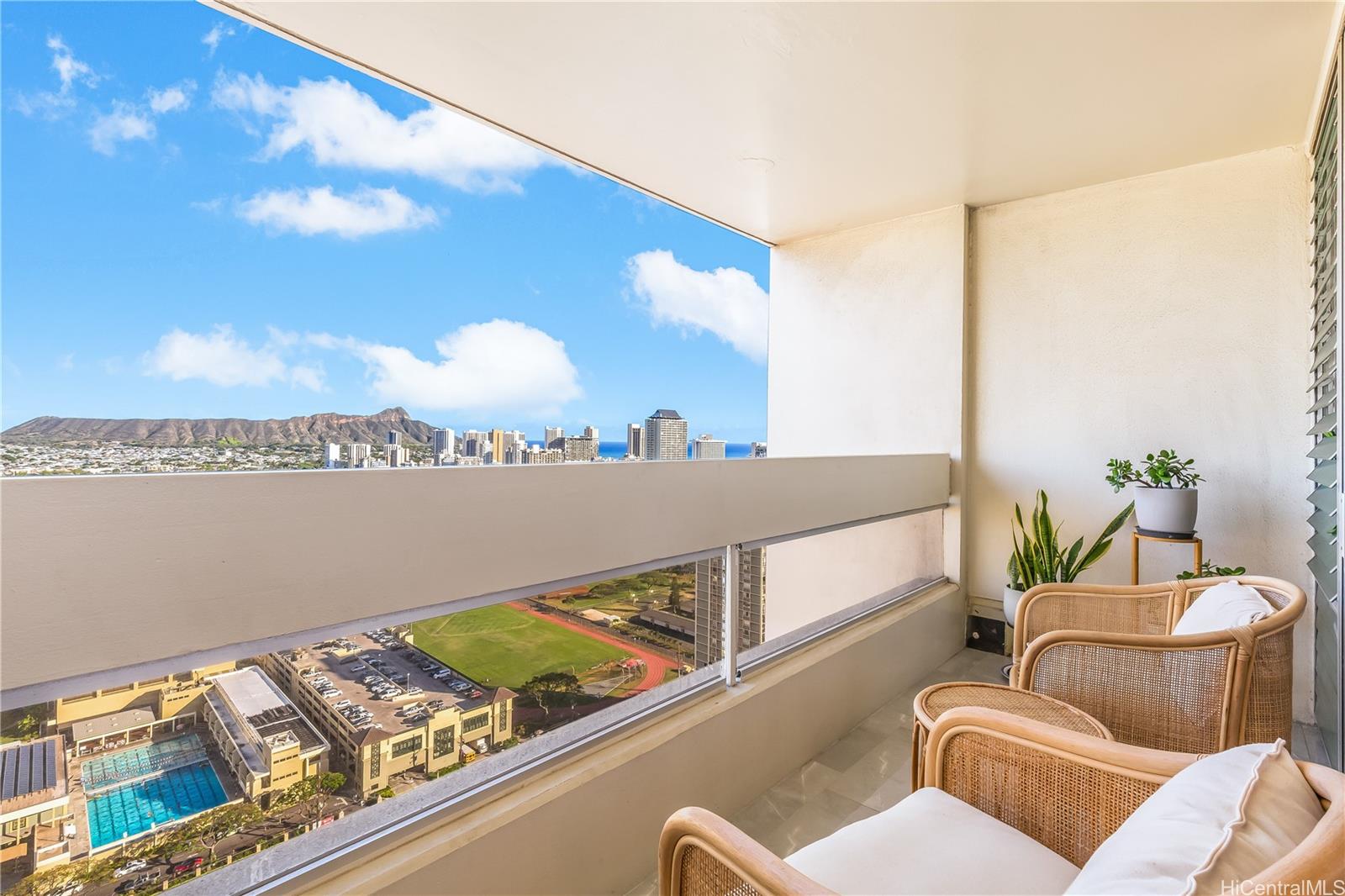 Experience luxurious multi-level living with breathtaking views of Diamond Head, Waikiki Beach, and Ala Wai Golf Course at Ala Wai Plaza Skyrise! This high floor (just below the penthouse), two story, 1-bedroom unit features a downstairs with new laminate floor inside, ceramic tile outside, a modern kitchen with granite countertops and stainless steel appliances, new washer & dryer, living room with dining space, and an extended lanai with high ceilings perfect for entertaining. Upstairs offers a renovated bathroom with glass shower panel, spacious bedroom, and a second lanai to relax and unwind while taking in the stunning panoramic views. Also comes with a dedicated covered parking stall on the 3rd floor which has a walking bridge with direct access to the building. Amenities include a pool, 24-hour security, BBQ grills, car wash, and shared storage on each floor. Conveniently located next to Iolani School and University of Hawaii with easy access to parks, shopping, dining, Waikiki, and the H1 freeway. Don’t miss this opportunity to own your piece of paradise in the sky. Come take a look before it’s too late!