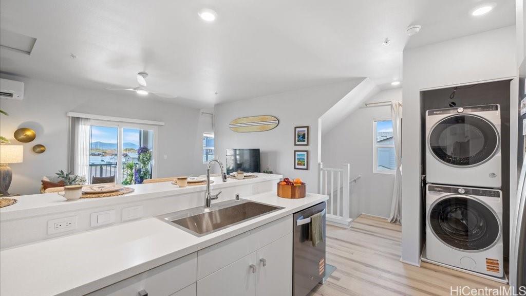 This three story 3 bedroom and 2.5 bathroom condominium consists of 1,317 square feet of net living area. When you step into this home, you will be greeted by a staircase that leads you into the living room and peninsula kitchen featuring stainless steel appliances and white soft-close cabinets. Nearby is a convenient powder room. On the second floor, you’ll find the primary bedroom with a walk-in closet and ensuite bathroom with a vanity sink and walk-in shower. Relax and take in the fresh air on the balcony off the living room. The third floor features two secondary bedrooms each with mirrored sliding door closets and a secondary bathroom with a combination bathtub and shower adjacent to an open concept family room. Split air conditioning and modern appliances including a range/oven, micro-hood, dishwasher, refrigerator, and washer/dryer allow for ease of living.