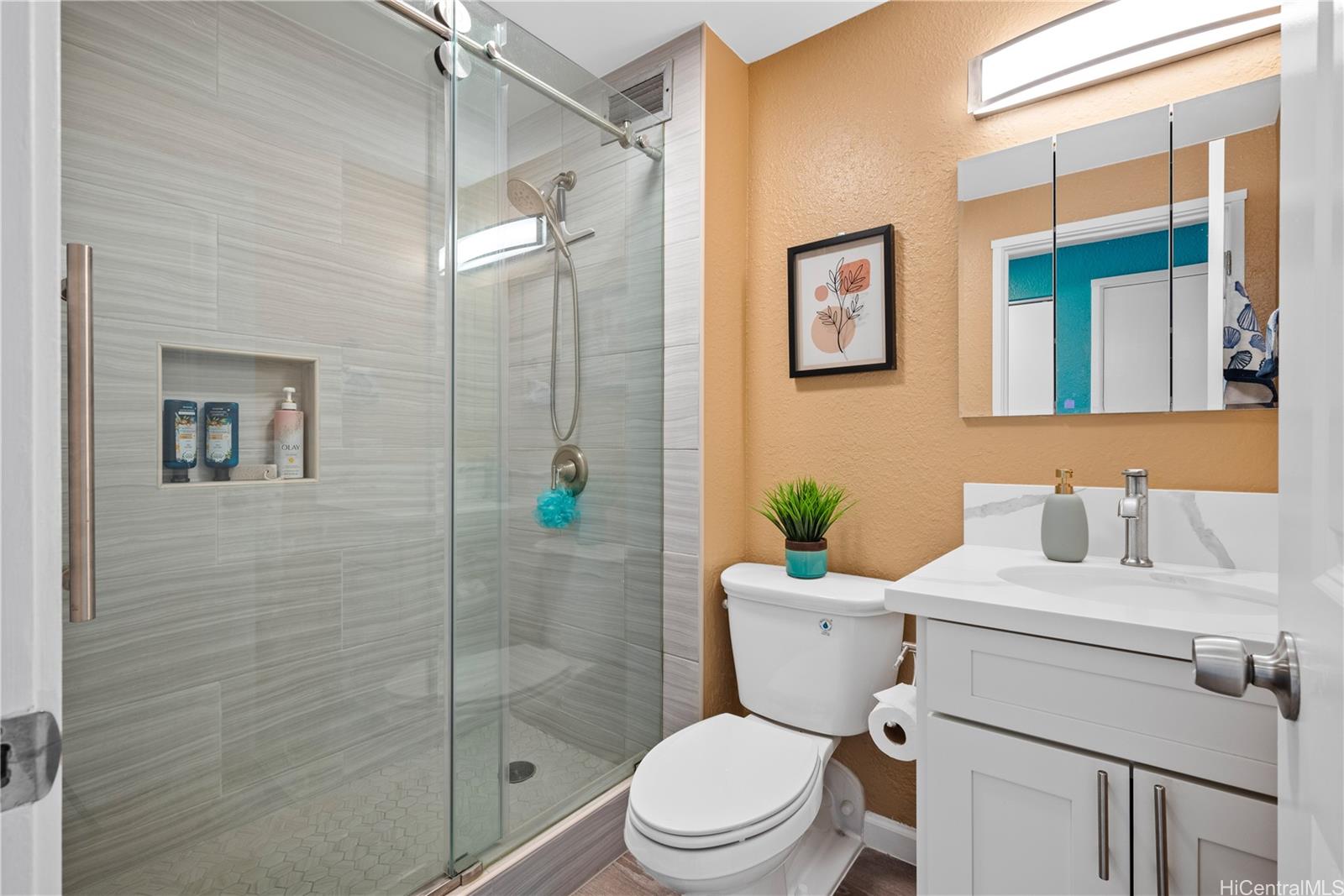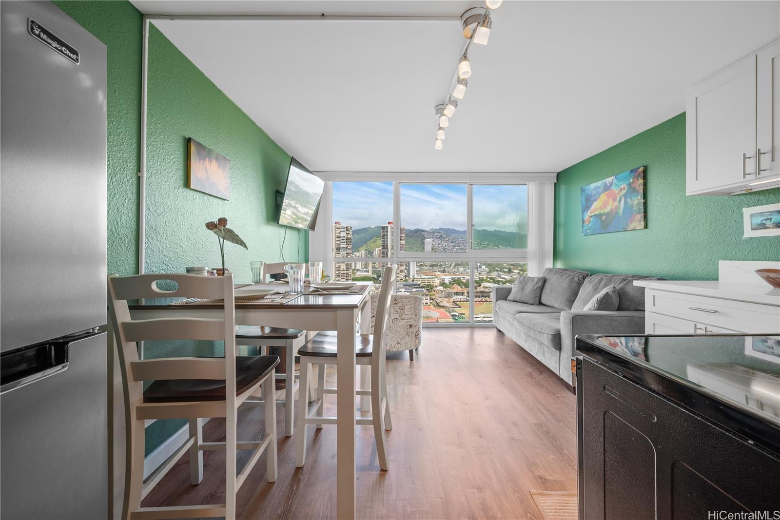 Nearly $100,000 in upgrades to this move-in ready unit! There are upgraded picturesque living room windows at a cost of $17,942.89 done in January 2021. This window system replaced the 49-year-old, single-paned window that most units still have. The new window system utilizes modern, dual-pane, low e, 1″ insulated glass which is substantially quieter and reflects much more of the sun’s heat (infrared radiation) and damaging rays (ultra violet radiation). The Class I clear anodized aluminum extrusions are also much thicker for increased wind load capacity meeting modern requirements. The bedroom window was also recently replaced with a double paned slider. Also in 2021, a full unit renovation was done, including removal of the popcorn ceiling, luxury vinyl plank flooring added, and interior painting. Kitchen design is unique, with the sink in the rounded corner, soft close cabinets and quartz counter tops. Shower has a cute sliding barn door. All furniture is included (purchased from Ashley Honolulu), including a sofa that can be converted into a queen size bed. For the past 5 yrs, this unit has been used as a second vacation home so it’s hardly been used and in excellent condition.