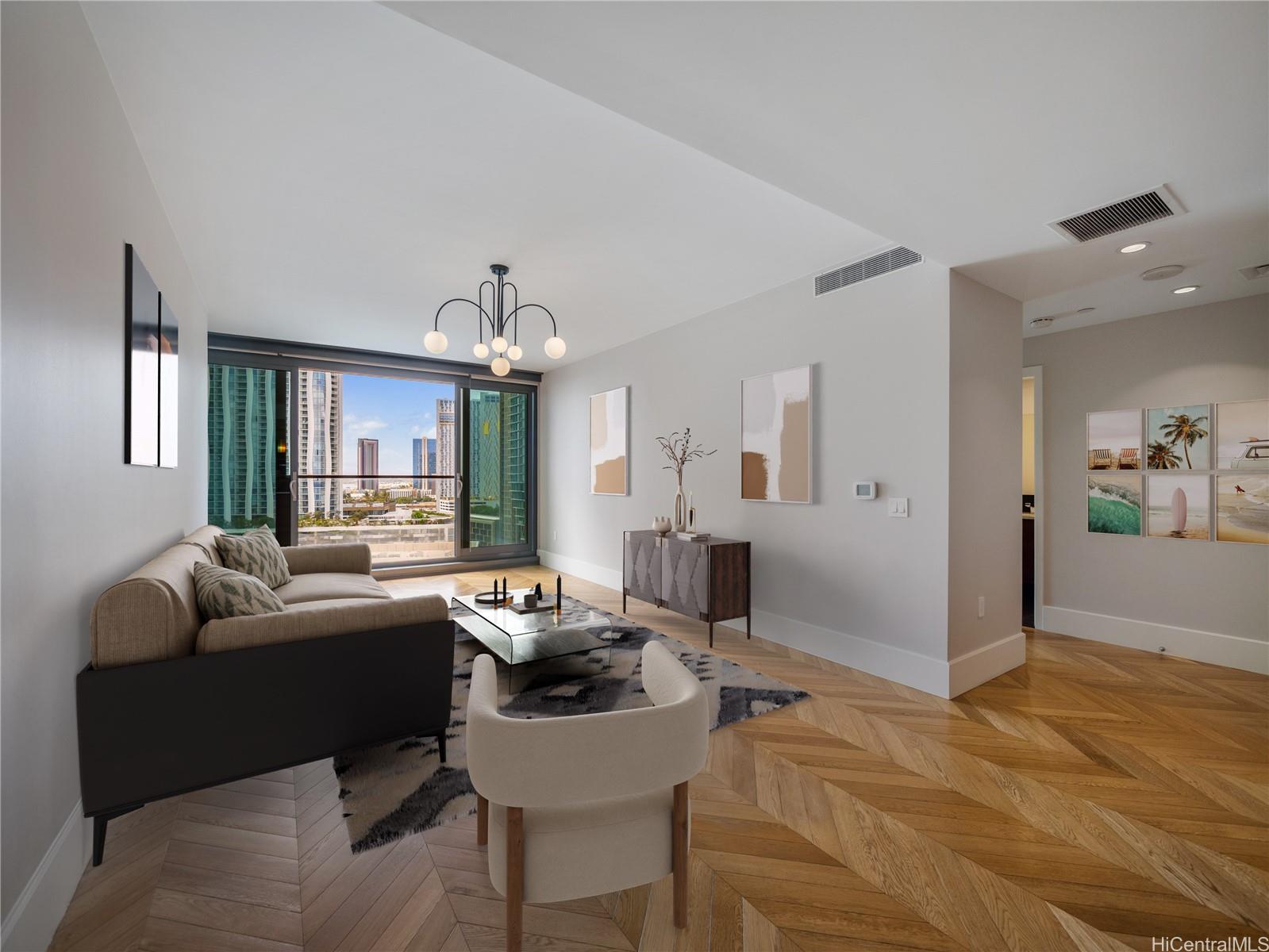 ウォード・ビレッジの中心地、アナハで洗練された島暮らしを体験してください。 アウアヒ通り1108番地 #1305に位置するこの美しくデザインされた1ベッドルーム・1バスルームの住居は、約726平方フィート(約67.5平方メートル)の室内居住空間を有し、床から天井までの窓からは息をのむような市街地、海岸線、そして海の景色が広がっています。 オープンコンセプトのレイアウトは、9フィートの天井高、セントラルエアコン、そしてモダンな仕上げが随所に施されています。 洗練されたグルメキッチンには、高級家電、特注キャビネット、エレガントなカウンタートップが備わり、日常の生活やおもてなしに最適です。 広々とした寝室には十分な収納スペースが設けられており、スパを思わせるバスルームはくつろぎの空間を提供します。 居住者は、1エーカーの広大なレクリエーションデッキに広がるリゾートスタイルの設備を満喫できます。特徴的なガラス底プール、ジャグジー、テニスコート、バレーボールコート、フィットネスセンター、ゴルフシミュレーター、サウナとスチームルーム、プライベートダイニングエリア、バーベキューキャバナ、シアタールーム、ドッグパーク、ゲストスイート、24時間コンシェルジュサービスなどが揃っています。 屋根付き指定駐車スペース1台分が含まれます。 ホールフーズマーケットやアラモアナビーチパークのビーチからほんのすぐ近く。 都会のラグジュアリーと島のライフスタイルが融合する。 .