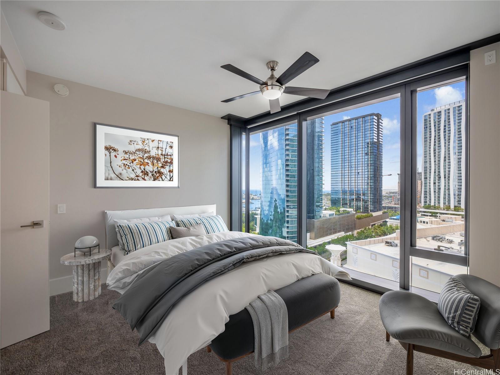 Experience elevated island living at Anaha in the heart of Ward Village. This beautifully designed 1-bedroom, 1-bath residence at 1108 Auahi St #1305 offers approximately 726 sq ft of interior living space with floor-to-ceiling windows showcasing stunning city, coastline, and ocean views. The open-concept layout features 9-foot ceilings, central AC, and modern finishes throughout. The sleek gourmet kitchen includes premium appliances, custom cabinetry, and elegant countertops, perfect for everyday living and entertaining. The spacious bedroom offers generous closet space, while the spa-inspired bathroom provides a relaxing retreat.Residents enjoy resort-style amenities set across a spectacular 1-acre recreation deck, including a signature glass-bottom pool, hot tubs, tennis court, volleyball court, fitness center, golf simulator, sauna and steam rooms, private dining areas, BBQ cabanas, theater room, dog park, guest suites, and 24-hour concierge service. One covered assigned parking stall included. Just moments from Whole Foods Market and the beaches of Ala Moana Beach Park. Urban luxury meets island lifestyle.