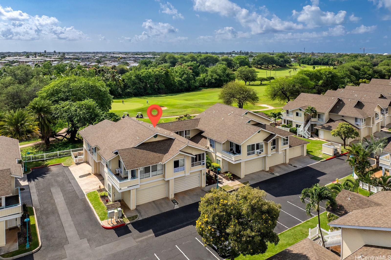 Golf Course Views at The Arbors!Enjoy tranquil fairway views from this spacious 3-bedroom, 3-full-bath townhouse that lives like a single-family home. The open-concept living, dining, and kitchen area is ideal for everyday living and entertaining. A convenient first-floor bedroom and full bath offer flexibility for guests, a home office, or multigenerational living. Enjoy your morning coffee or evening beverage on the private lanai overlooking the 5th green of the Coral Creek Golf Course. The expansive primary suite features two large closets and a relaxing retreat-like feel. The second bedroom upstairs features a Murphy Bed, perfect for guests! Separate downstairs laundry room with full size Washer & Dryer, sink and plenty of storage. Additional highlights include a 2-car attached garage, secure gated community access, community pool and clubhouse, and plenty of guest parking conveniently located in front of the property. Ideally situated close to shopping, dining, golf courses, beaches, and the H-1 Freeway, this home offers comfort, convenience, and low-maintenance living. VA Assumable Loan at 2.875% rate with monthly payment of $2600; balance of loan is approximately $463,000.