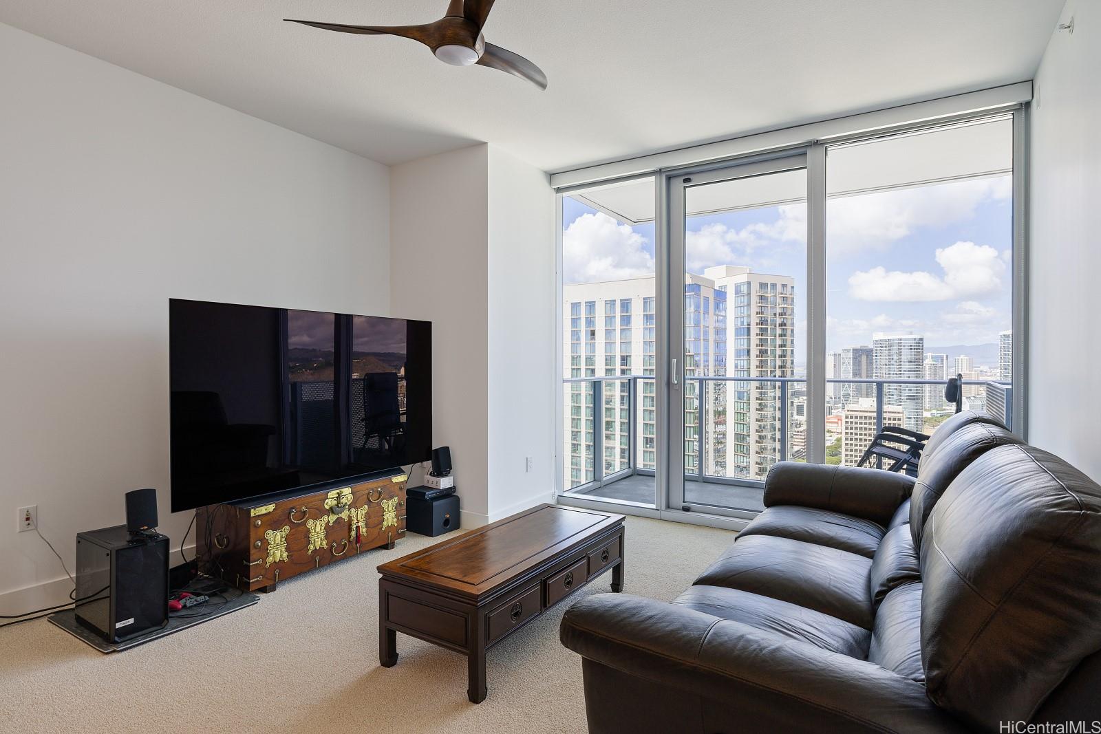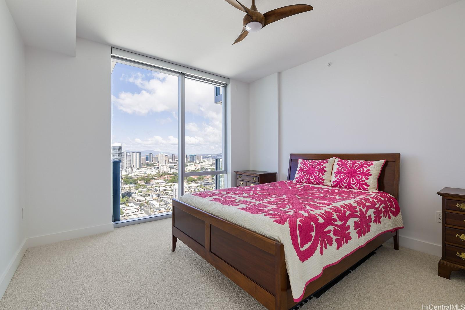 Enjoy luxury convenient living on the 35th floor in Mid town Honolulu.  Built in 2021,the unit is in Excellent Condition with 9 foot high ceilings with ceiling fans in the bedrooms and living room.  Enjoy the ocean and mountain views from the living room, lanai and both bedrooms.   Azure offers an exercise room, recreation room,  movie theater, 4 grills and 2 cabanas, puppy park, 4 guest rooms for out of town visitors, and concierge services. The unit has two parking stalls and storage.  Across the street from Ala Moana Center, Walmart, Sam’s Club, great restaurants and much more.  Very close to Magic Island and Ala Moana beach. Azure is fully covered with 100% hurricane nsurance.