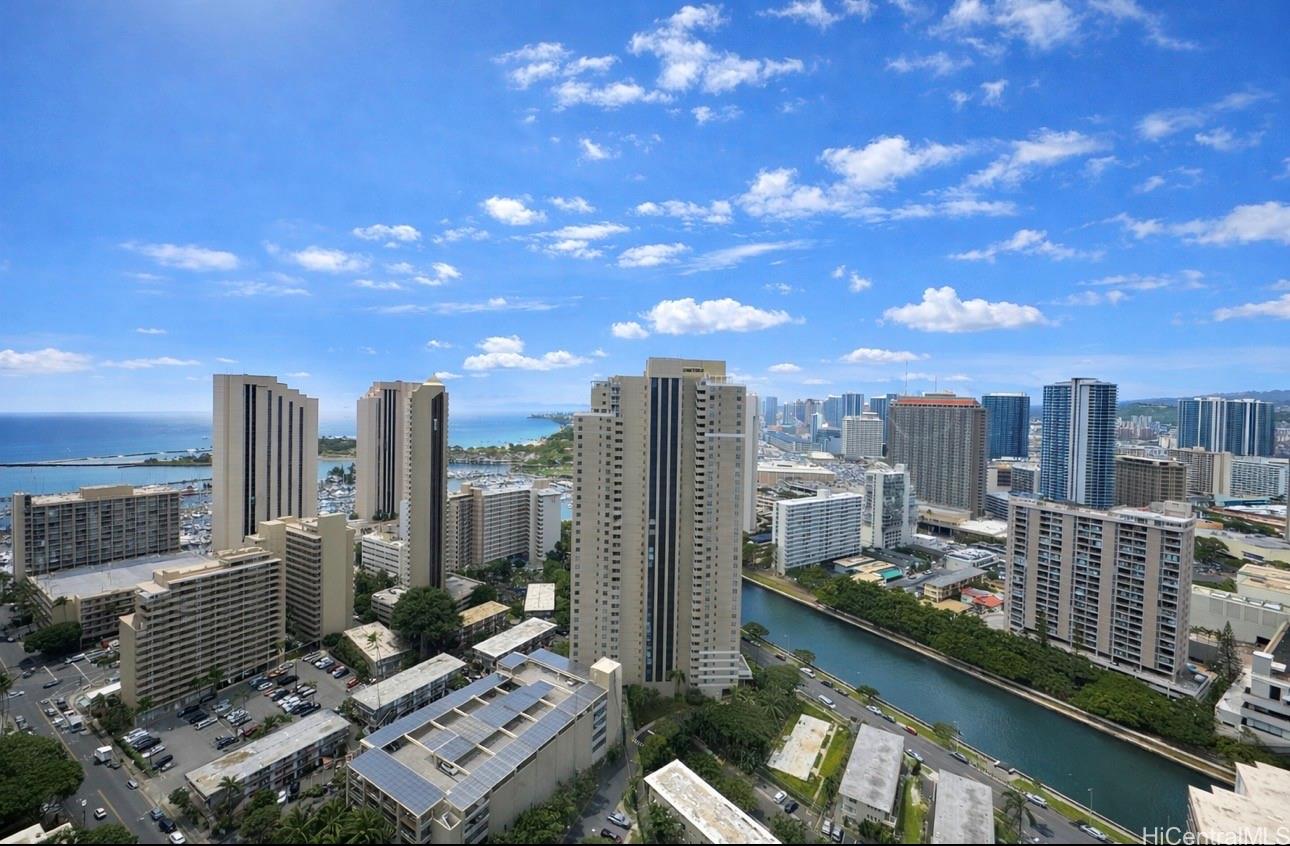 Rarely available, beautifully renovated penthouse at Chateau Waikiki offering soaring 9.5-foot ceilings and breathtaking panoramic views of the ocean, and vibrant island city views. This spacious, fully furnished, move-in-ready residence features newer flooring, updated kitchen cabinetry, and a bright, open-concept layout designed for effortless island living.Enjoy elevated views of paradise from your high-floor vantage point, perfectly positioned near the entrance to Waikiki for exceptional convenience. You’re just minutes from world-famous Waikiki Beach, Ala Moana Center, and Ala Moana Beach Park—ideal for premier shopping, dining, and outdoor recreation.Chateau Waikiki offers an impressive suite of resort-style amenities, including a swimming pool, BBQ area, fully equipped gym, sauna, recreation rooms, car wash area, and 24-hour security. Maintenance fees include electricity, central AC, cable, water, sewer, providing exceptional value and peace of mind.The unit includes TWO parking stalls (tandem) and additional storage! Don’t miss your chance to own this exceptional penthouse in one of Waikiki’s most desirable locations.