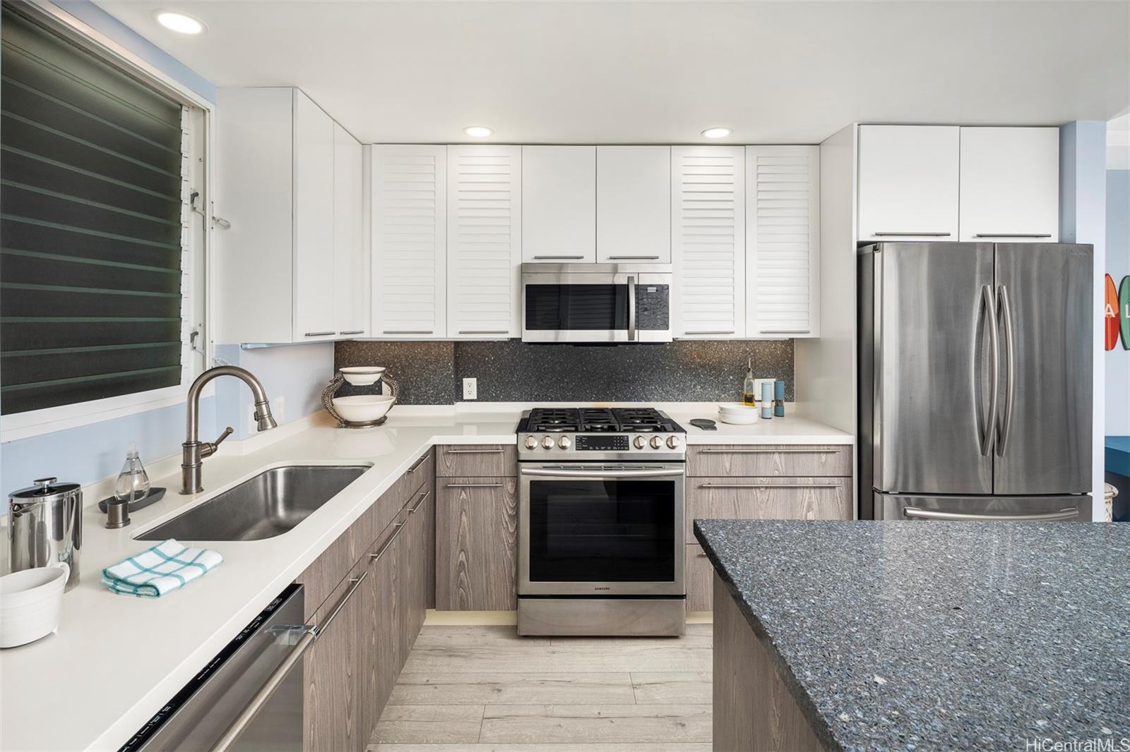 REFINED ISLAND LIVING WITH FRONT ROW OCEAN VIEWS. Perched on a high floor within the iconic Colony Surf, this beautifully renovated one bedroom residence offers a rare opportunity along one of Oahu’s most coveted sandy beachfronts. Positioned in a premier center front orientation, the residence captures sweeping views of the Pacific Ocean, coastline, and Waikiki skyline. The open floor plan is filled with natural light and framed by mesmerizing ocean vistas. Light coastal wood flooring, custom ceiling details, and a clean modern aesthetic create a relaxed elegance throughout. The kitchen features stainless appliances, ample storage, and a generous island with dine in seating. The bedroom enjoys ocean views and privacy plantation shutters for flexible separation. The bath includes a custom dual sink vanity with coastal white shutter cabinetry, walk in shower, and integrated washer and dryer. Custom built in seating along the oceanfront window is ideal for taking in breathtaking sunsets. Moments from Kapiolani Park, Waikiki shopping and dining, and nearby favorites including Michel’s, Hau Tree, and Arden restaurants, this is an exceptional oceanfront residence.