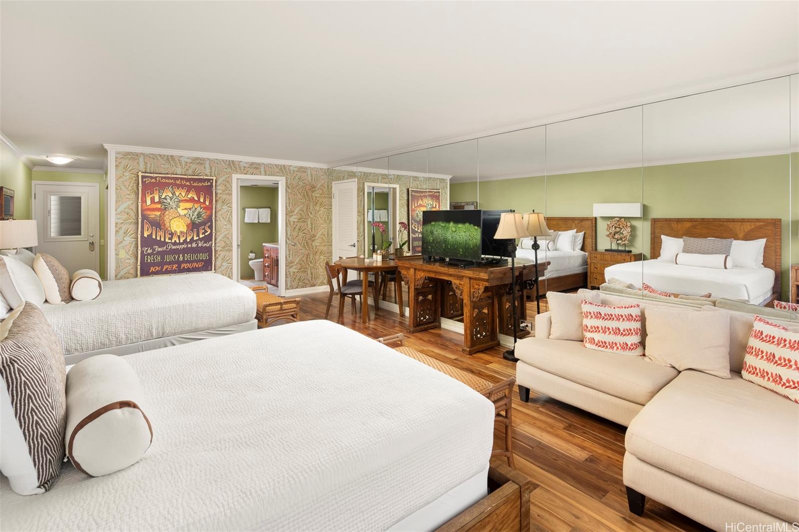 TIMELESS BEACHFRONT LIVING WITH FRONT ROW VIEWS. Perched in a prime front row setting within the iconic Colony Surf, this beautifully renovated studio residence offers an exceptional opportunity to enjoy oceanfront living along one of Oahu’s most coveted sandy beachfronts. The residence captures stunning views of the Pacific Ocean and is filled with natural light, creating a warm and inviting island-inspired interior. Rich acacia wood flooring brings warmth and a relaxed island style. The thoughtfully designed kitchen features custom mahogany cabinetry, granite countertops, open display shelving for china, and a built in cooktop, blending style and functionality. The full bath is beautifully appointed with custom mahogany cabinetry, granite counters, and a walk in shower. A built in washer and dryer adds everyday convenience. Designed for effortless island living, the residence is complemented by the soothing sound of the surf and gentle trade winds. Enjoy immediate beach access and close proximity to Kapiolani Park and Waikiki’s vibrant lifestyle, with acclaimed dining just moments away including Michel’s, Hau Tree, and Arden, making this front row oceanfront residence a true gem.