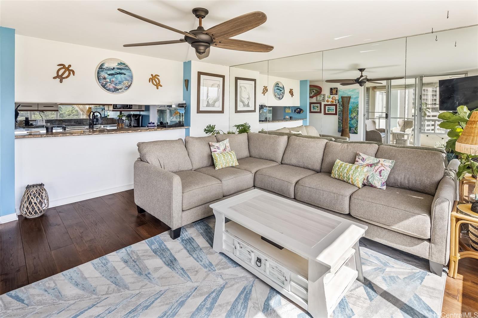 RARE GEM! Meticulously maintained corner-end 2-bedroom, 2-bath residence with two assigned parking stalls in the highly desirable Diamond Head Vista — a true rarity in Waikiki. Enjoy breathtaking, unobstructed views of iconic Diamond Head, while the all-inclusive maintenance fee covers electricity, hot water, cable, WiFi, sewer, and other common expenses, creating outstanding overall value.Pride of ownership is evident throughout this beautifully cared-for home, featuring fresh paint, new hardwood flooring in the bedrooms and living room, and an open lanai perfectly positioned to capture that stunning view of the iconic Diamond Head.Enjoy refreshing cross breezes and effortless indoor-outdoor living from your spacious lanai, plus the convenience of an in-unit washer and dryer.Ideally situated on the quieter residential side of Waikiki, you are just moments from world-famous beaches, the Honolulu Zoo, dining, shopping, and public transportation.Diamond Head Vista is a secure, well-managed building offering a swimming pool, guest parking, an on-site resident manager, and 24-hour security.One of Waikiki’s most sought-after buildings!