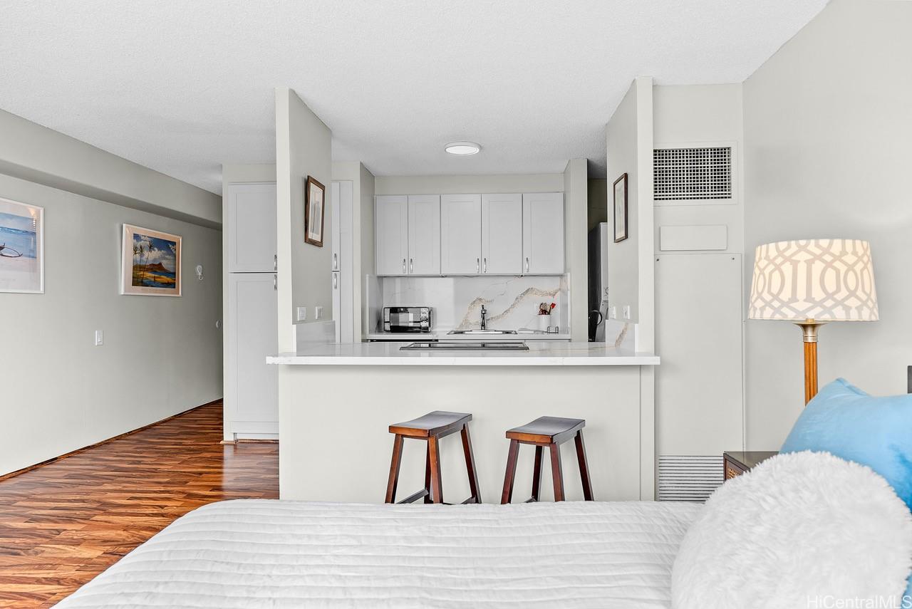 Check the Surf! Desirable Ocean View in Diamond Head (Resolution) Tower.Convenient, Comfortable Discovery Bay enhances the Island Lifestyle.Near Beach, Shops, Ala Moana Center, On Busline.Fully Furnished Large Studio with Spacious, Full Kitchen, Renovated Bathroom (2022)The unit is 96.893% Fee Simple with the AOAO holding both the right and obligation to acquire the remaining 3.107% Leasehold interest by December 31, 2039. Lease Rent is $22.82/quarterly or $7.61/month. Refer to DiscoveryBayHawaii.com for more information.