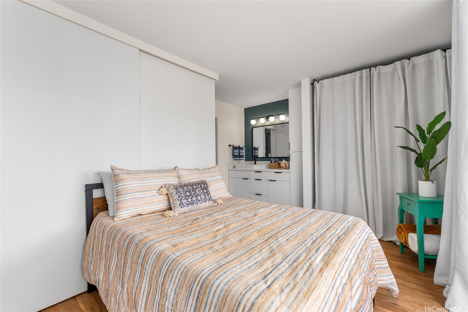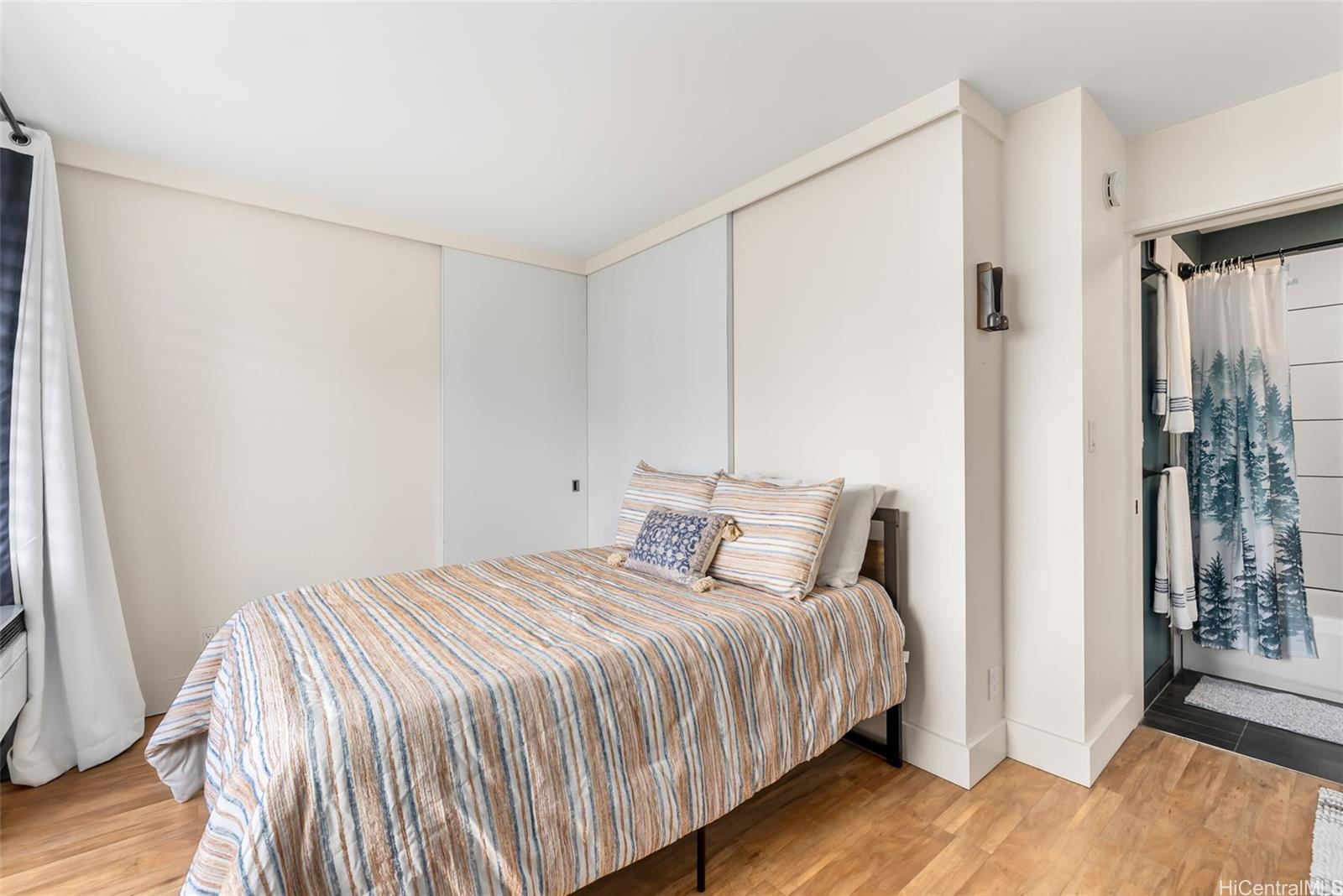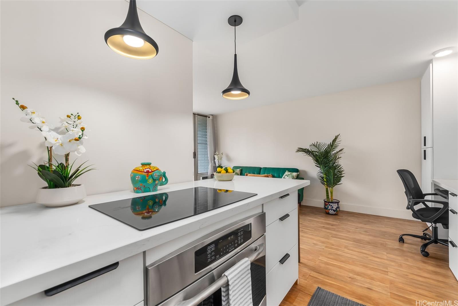First Open House Sunday April 19th from 2 to 5pm! Welcome home to this beautifully reimagined 1 bedroom | 1 bathroom condo in a superb central Honolulu location – unit 702 has been completely transformed w/ a true custom renovation emphasizing craftmanship, quality materials and intelligent design rarely seen at this price point. Rich mango LVP flooring w/ a noise reducing polymer core sets the tone for the refined interior. The gorgeous bespoke kitchen w/ quartz counters, custom soft-close cabinetry, stylish lighting & striking Basalt Chevron tile backsplash is a stand out. High-end appliances include a GE induction cooktop/convection oven, Bosch dishwasher, Samsung fridge & sleek LG washer/dryer. The fully remodeled bathroom features more custom tilework, Kohler fixtures & a ton of storage. Next, step outside to an expansive 167 sf lanai where unobstructed city views stretch across the Kakaako skyline – beautifully framed by a 100 yr old historic building – the perfect place for a morning coffee or Pau Hana w/ your drink of choice. Other value adds; assigned parking, extra storage unit, 2 window unit ACs + the HOA fee includes Cable/Internet. E Komo Mai!