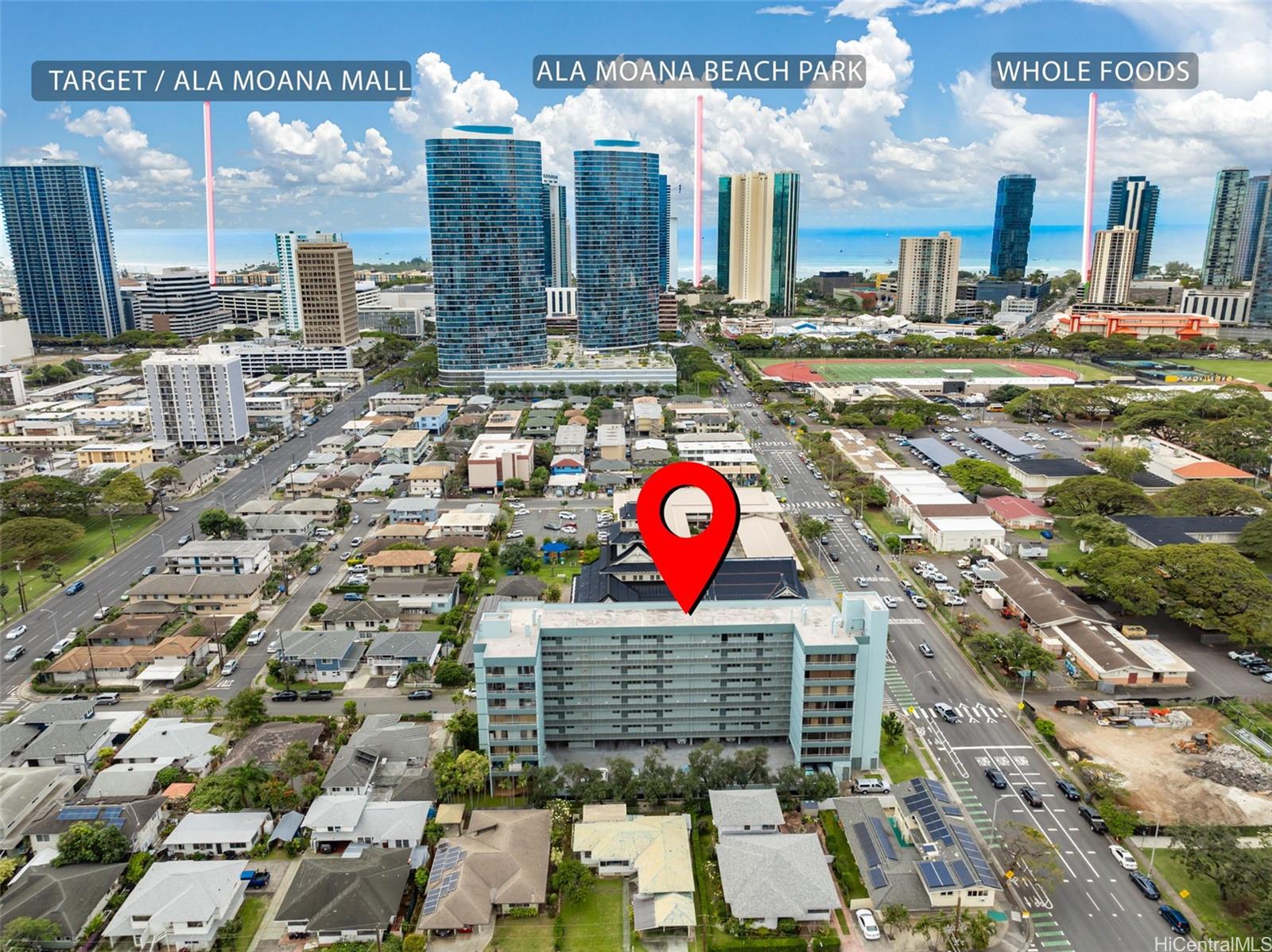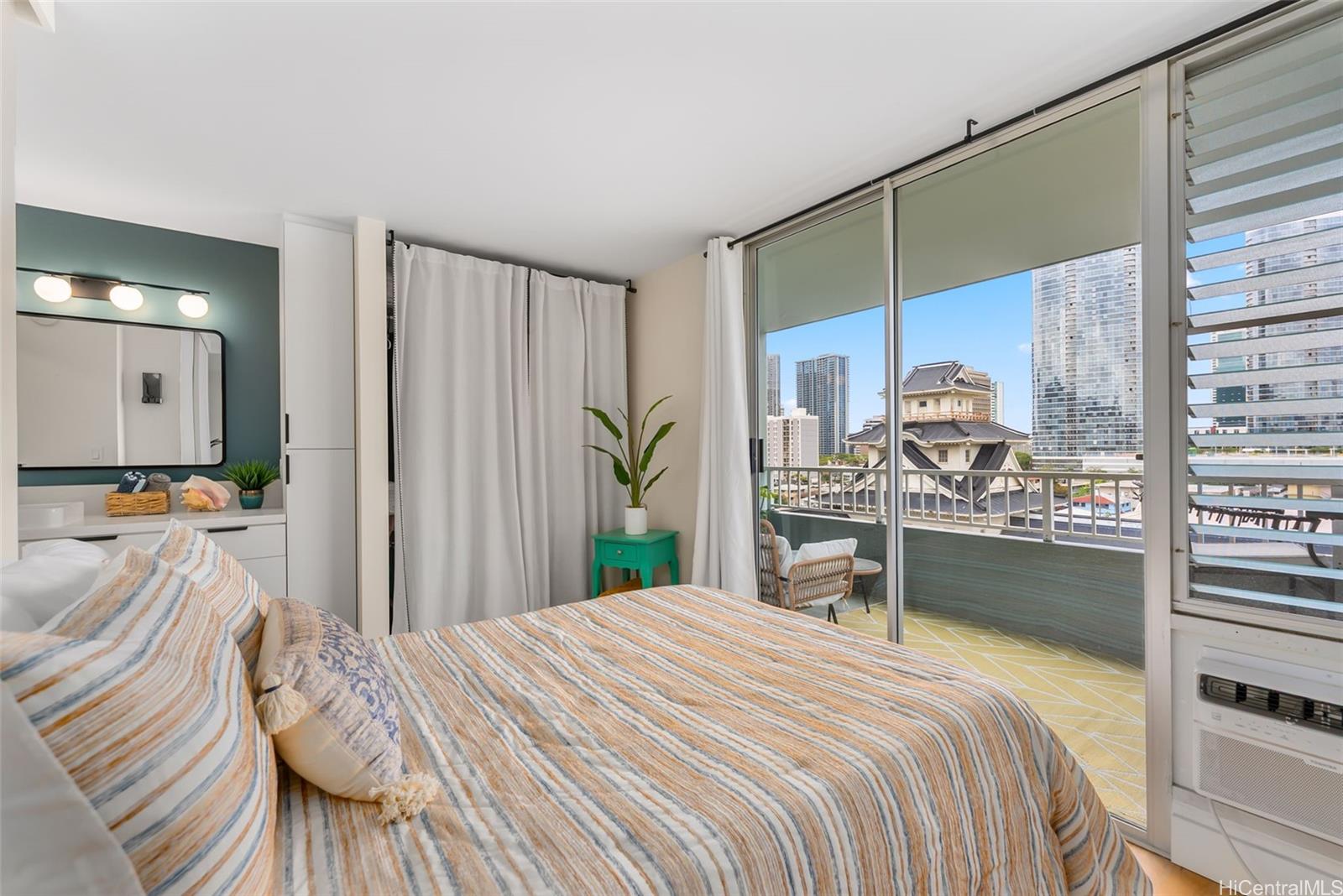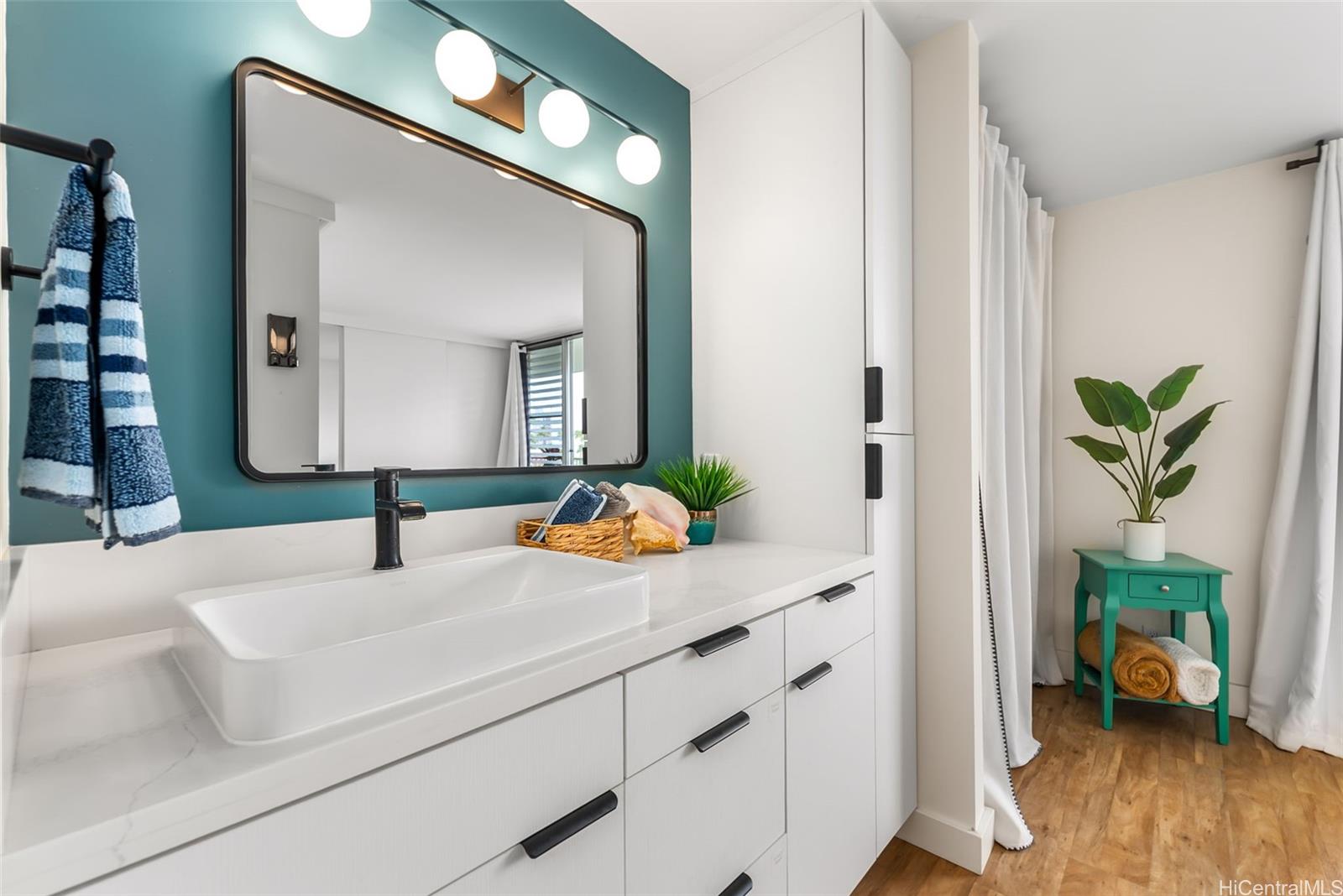 First Open House Sunday April 19th from 2 to 5pm! Welcome home to this beautifully reimagined 1 bedroom | 1 bathroom condo in a superb central Honolulu location – unit 702 has been completely transformed w/ a true custom renovation emphasizing craftmanship, quality materials and intelligent design rarely seen at this price point. Rich mango LVP flooring w/ a noise reducing polymer core sets the tone for the refined interior. The gorgeous bespoke kitchen w/ quartz counters, custom soft-close cabinetry, stylish lighting & striking Basalt Chevron tile backsplash is a stand out. High-end appliances include a GE induction cooktop/convection oven, Bosch dishwasher, Samsung fridge & sleek LG washer/dryer. The fully remodeled bathroom features more custom tilework, Kohler fixtures & a ton of storage. Next, step outside to an expansive 167 sf lanai where unobstructed city views stretch across the Kakaako skyline – beautifully framed by a 100 yr old historic building – the perfect place for a morning coffee or Pau Hana w/ your drink of choice. Other value adds; assigned parking, extra storage unit, 2 window unit ACs + the HOA fee includes Cable/Internet. E Komo Mai!