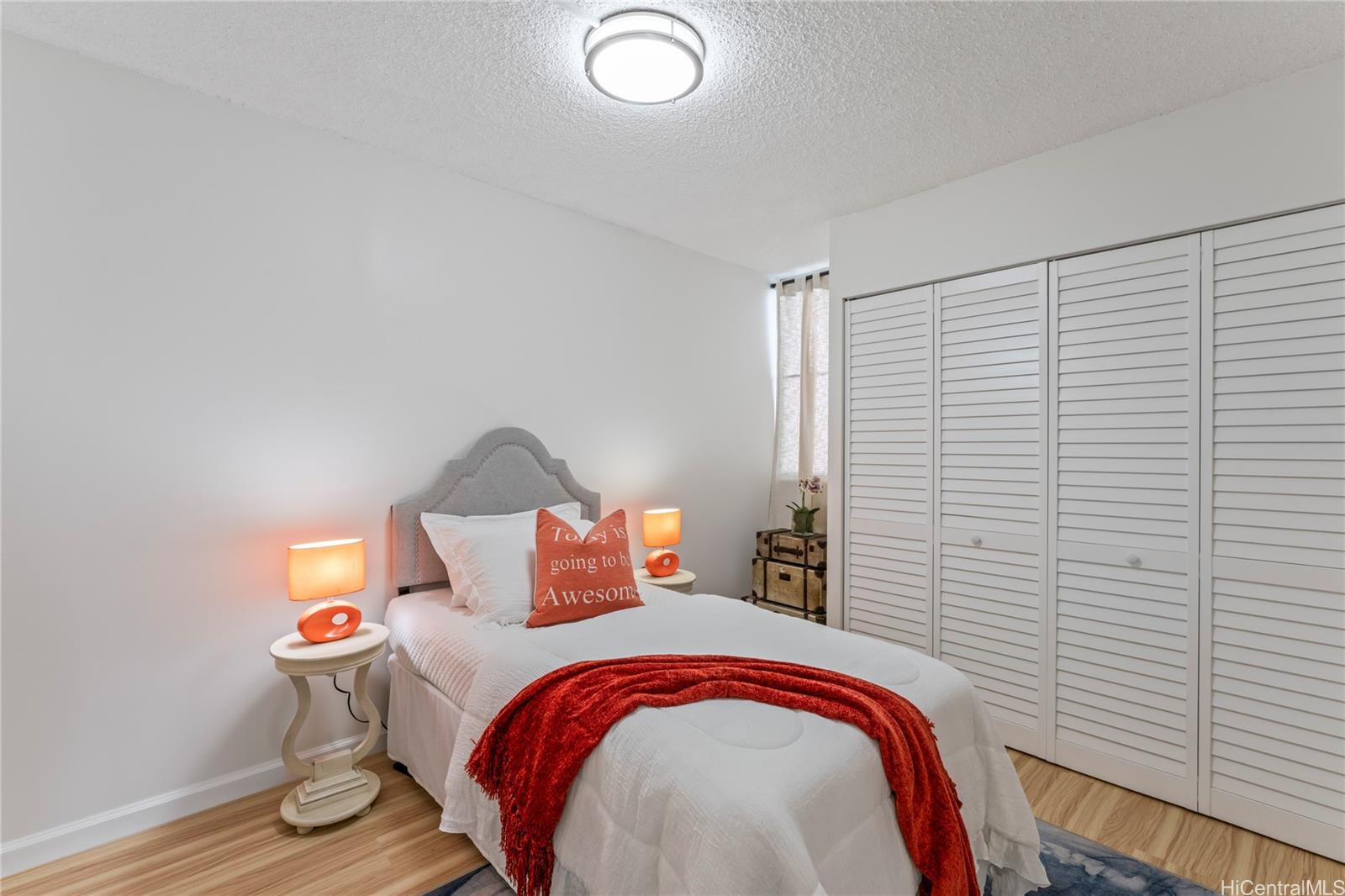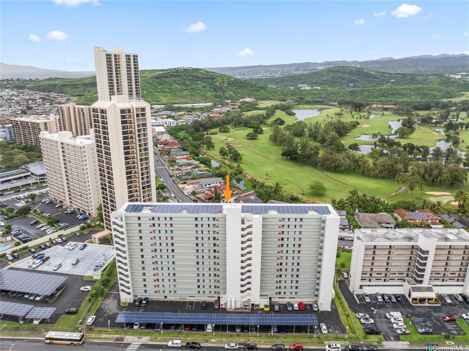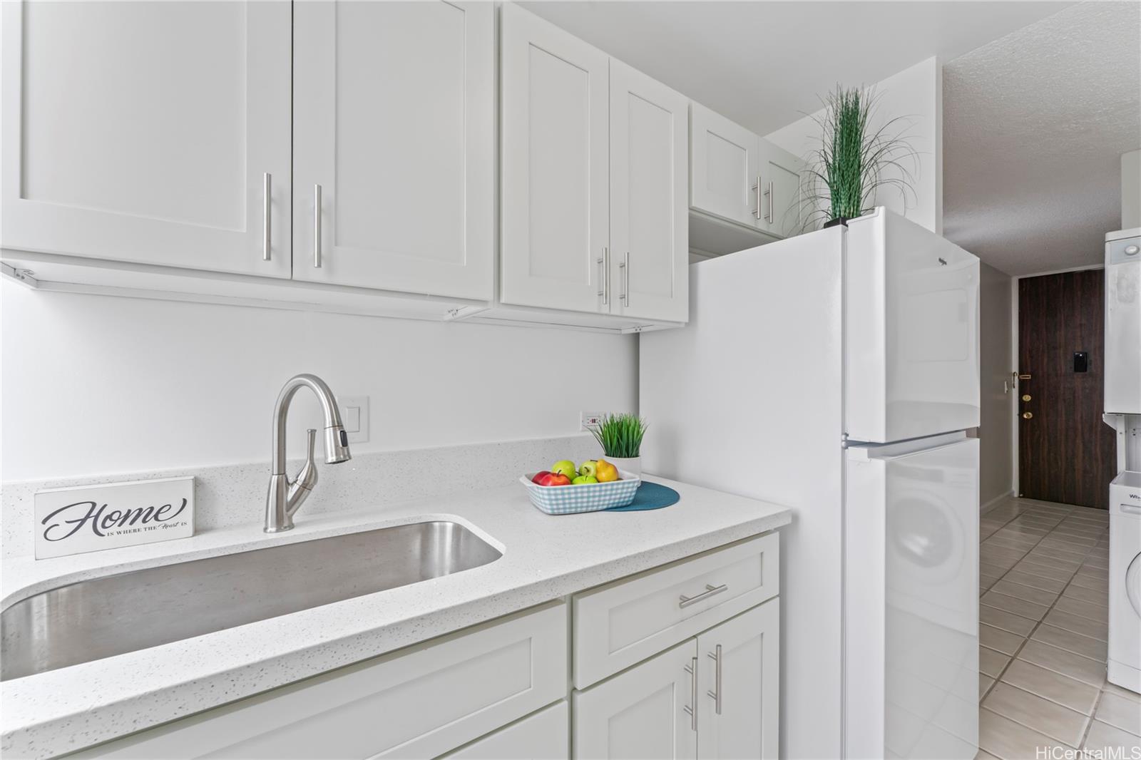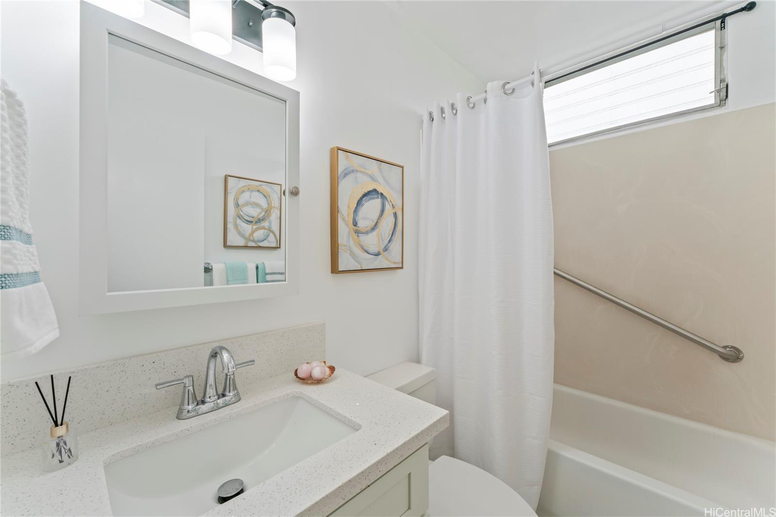 Rare 3-bedroom opportunity at Fairway Gardens in Salt Lake! This recently renovated unit features a brand-new kitchen with modern cabinetry, quartz countertops, and updated appliances, complemented by fresh finishes throughout. Enjoy beautiful golf course and mountain views overlooking Honolulu Country Club. Spacious layout includes 3 bedrooms, 1 full bath, and 1 half bath, plus the convenience of an in-unit washer and dryer. Comes with 2 parking stalls—a valuable bonus as most units have only one. Fairway Gardens offers amenities including a pool, BBQ area, gym, car wash area, community laundry, and on-site management. Convenient to the airport, Tripler Army Medical Center, Kaiser Permanente Moanalua Medical Center, Target, shopping, dining, and freeway access. Building is fully insured for hurricane. A must-see!