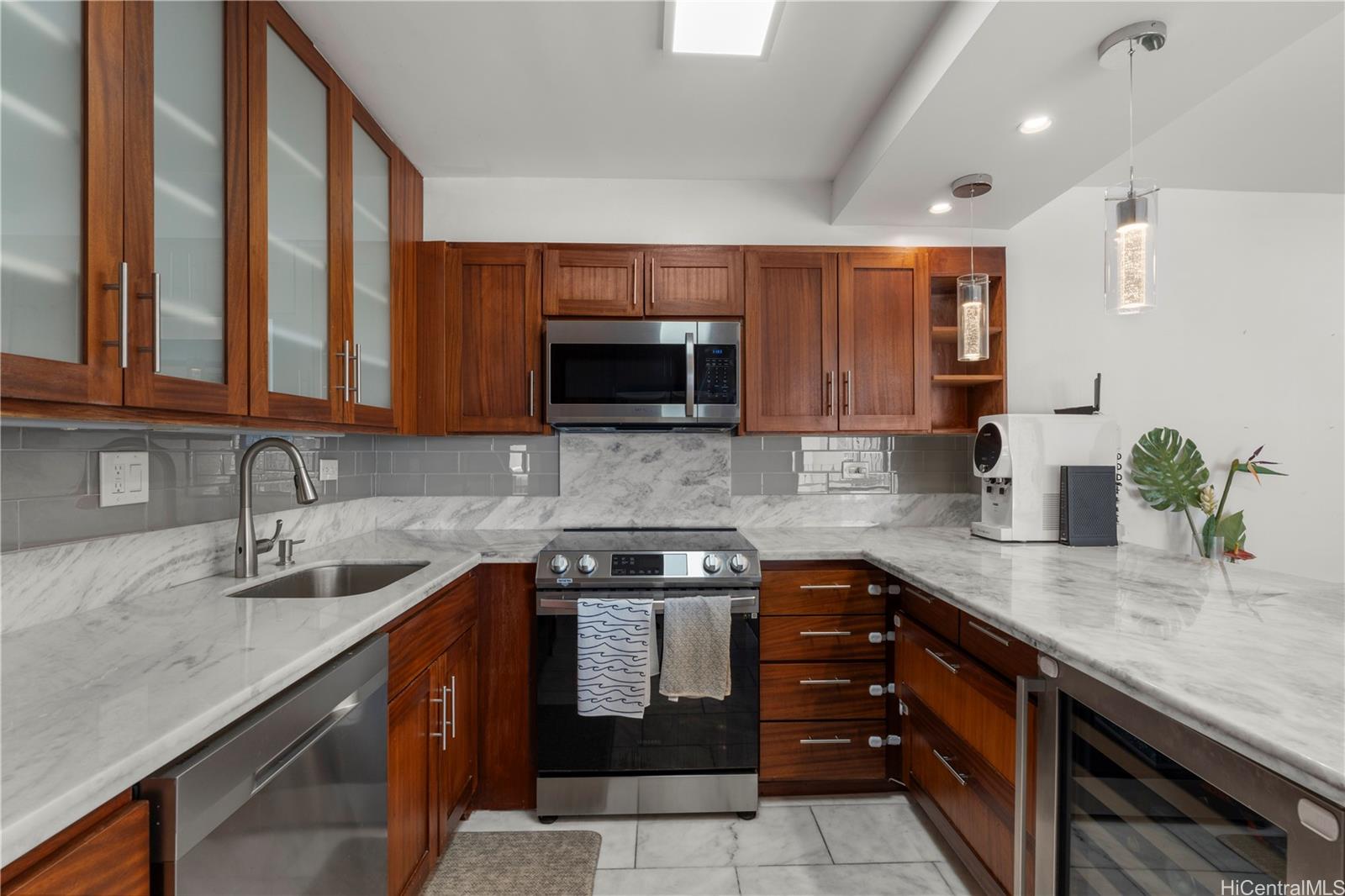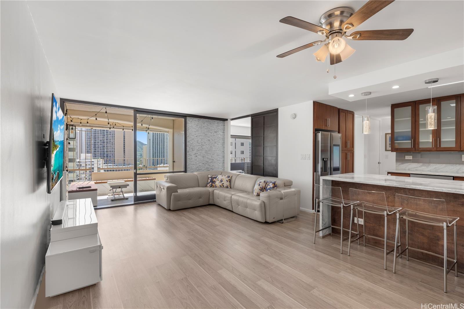 ワイキキの中心部に位置する、この素晴らしい2ベッドルームのペントハウス・リトリートから、ビーチがあなたを呼んでいます!入念に改装された、830平方フィートの フィート ガバナー・クレグホーンの邸宅からは、ターコイズブルーの太平洋やクーラウ山脈の息をのむような景色が広がり、時折、象徴的なダイヤモンドヘッドの姿も垣間見えます。 室内には、特注のキャビネット、ステンレス製の家電製品、ワイン冷蔵庫を備えたグルメキッチンが設けられています。 ウォークインクローゼットとスパのようなバスルームを備えた広々としたマスタースイートで、ゆったりとおくつろぎください。 広々としたプライベートラナイには特注のベンチが設置されており、夕日を眺めながらカクテルを楽しんだり、涼しい貿易風を感じたりするのに最適です。屋内と屋外がシームレスにつながった快適な暮らしをお楽しみください。 現代的な設備として、室内洗濯機・乾燥機、エアコン、ラナイ内の収納スペースに加え、セキュリティ完備の鍵付きエレベーターからわずか数歩の場所に位置する、非常に便利な1階の駐車スペースが備わっています。 この建物には管理人が常駐しており、友人や家族を招いて楽しめる清涼感あふれるプールも備わっています。 世界的に有名なワイキキのビーチからわずか2ブロック、インターナショナル・マーケット・プレイスからも徒歩圏内という絶好のロケーション。毎日がバカンスのような気分を味わえる、この絶好のチャンスをお見逃しなく!