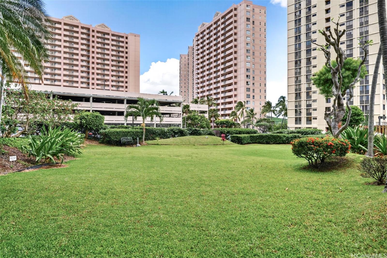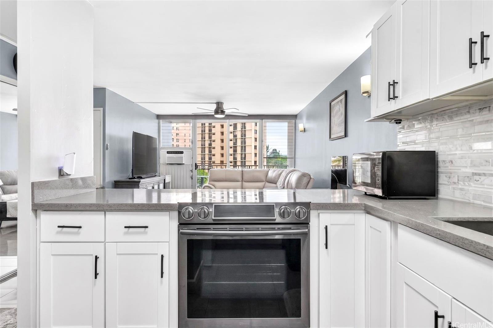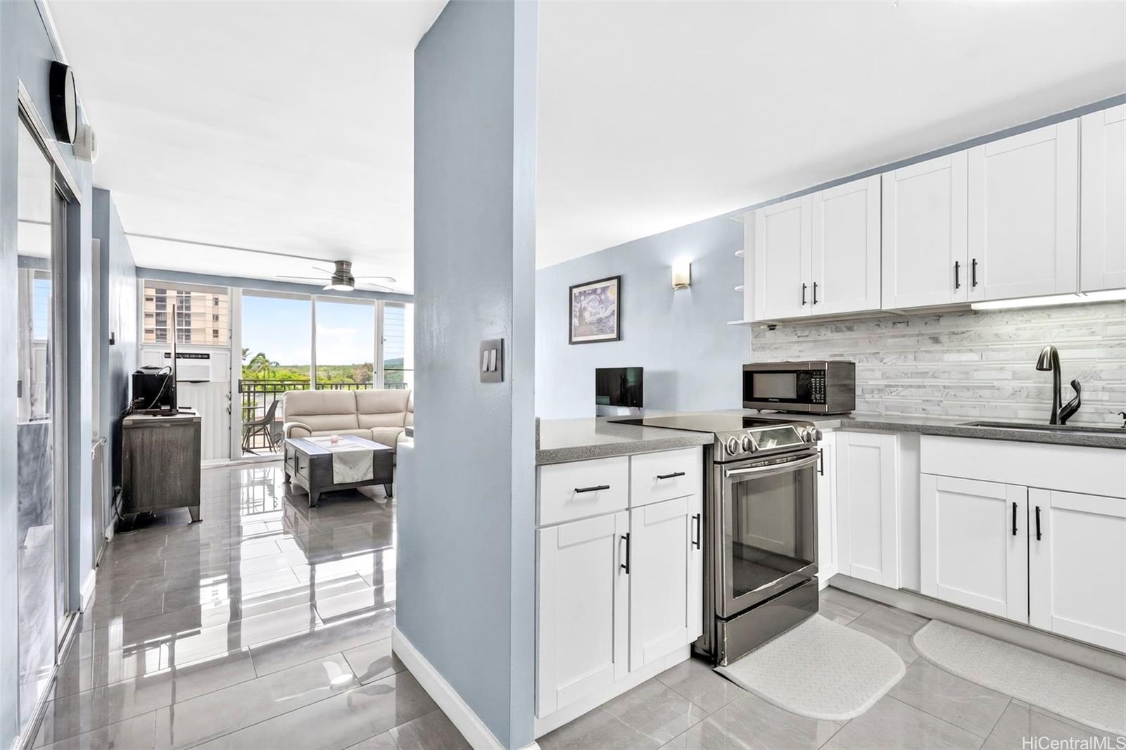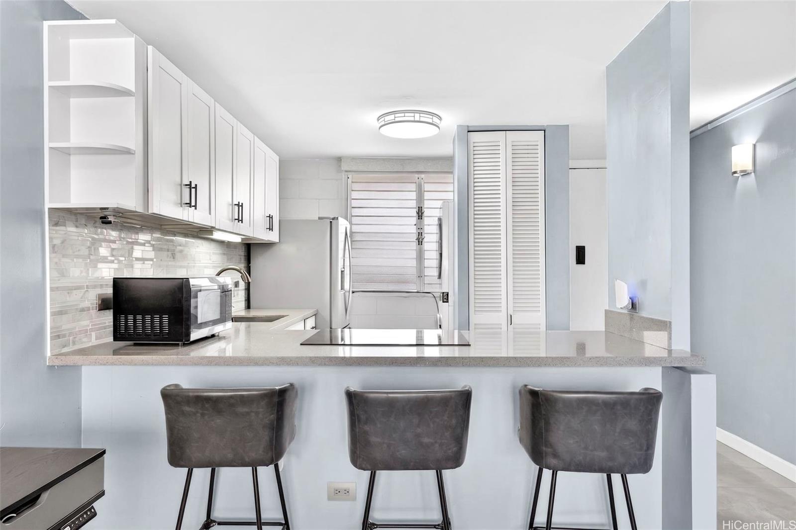 Beautifully renovated 1-bedroom condo in Salt Lake with 1 assigned parking stall and the convenience of an in-unit washer and dryer while you enjoy relaxing golf course views from both your living room and private lanai. The home showcases upgrades throughout including modern shaker cabinets, sleek quartz countertops, durable tile flooring, and a smooth, popcorn-free ceiling. The fully remodeled bathroom features contemporary finishes and a washlet for added comfort. You’ll also appreciate the abundant storage, rare for a 1-bedroom unit with ample cabinetry and well-designed spaces to keep everything organized. The Greenwood is a well-maintained building with all utilities included in the HOA dues and conveniently located just minutes from shopping, dining, freeway access, and Daniel K. Inouye International Airport.