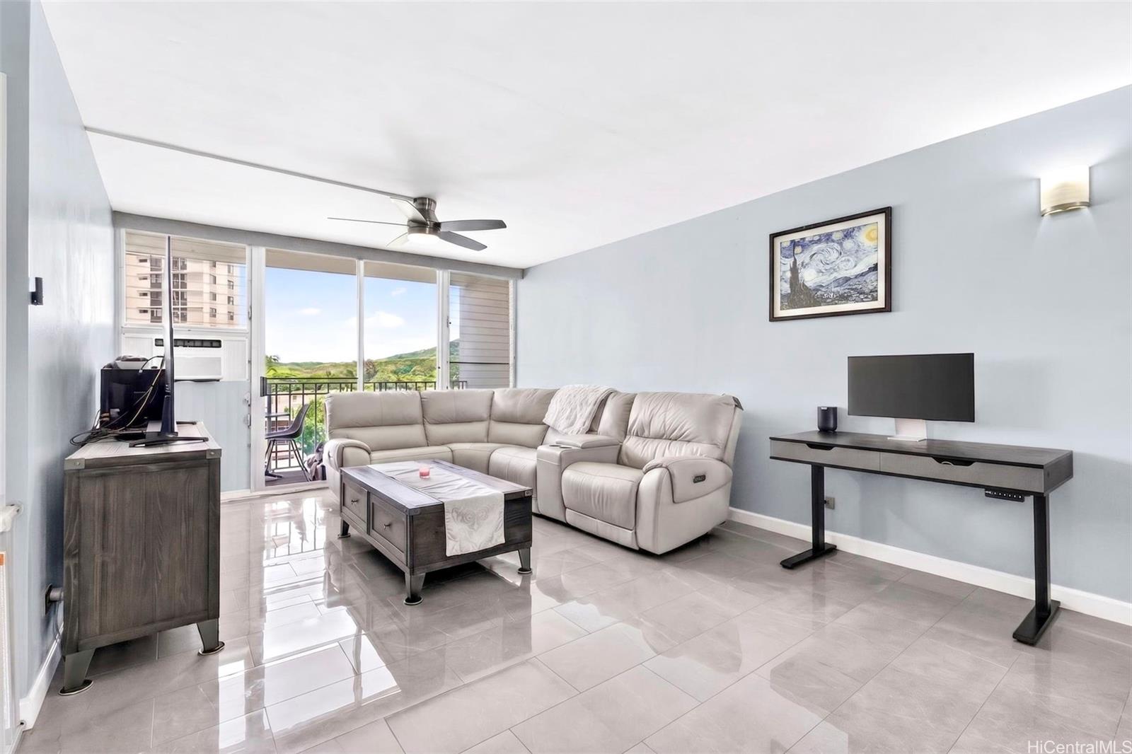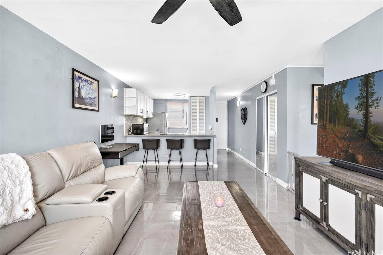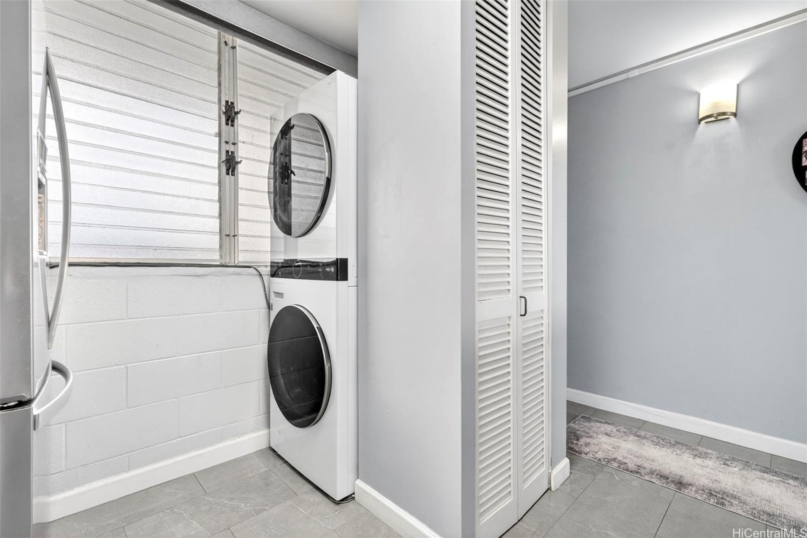 Beautifully renovated 1-bedroom condo in Salt Lake with 1 assigned parking stall and the convenience of an in-unit washer and dryer while you enjoy relaxing golf course views from both your living room and private lanai. The home showcases upgrades throughout including modern shaker cabinets, sleek quartz countertops, durable tile flooring, and a smooth, popcorn-free ceiling. The fully remodeled bathroom features contemporary finishes and a washlet for added comfort. You’ll also appreciate the abundant storage, rare for a 1-bedroom unit with ample cabinetry and well-designed spaces to keep everything organized. The Greenwood is a well-maintained building with all utilities included in the HOA dues and conveniently located just minutes from shopping, dining, freeway access, and Daniel K. Inouye International Airport.