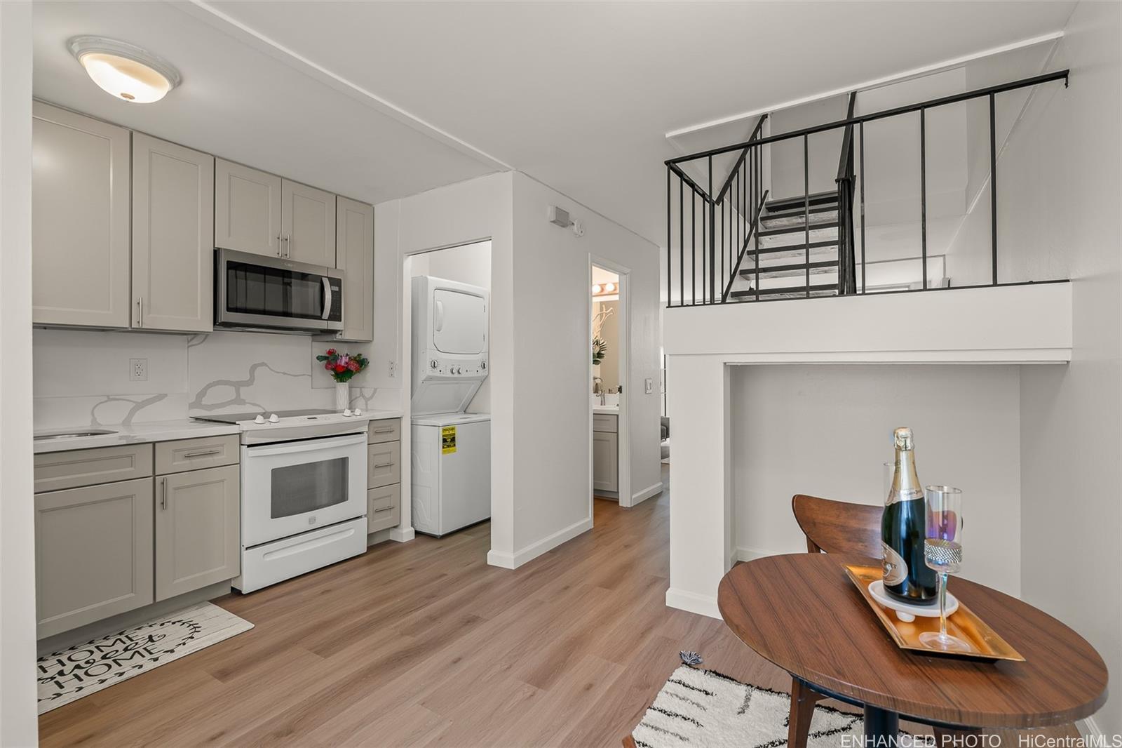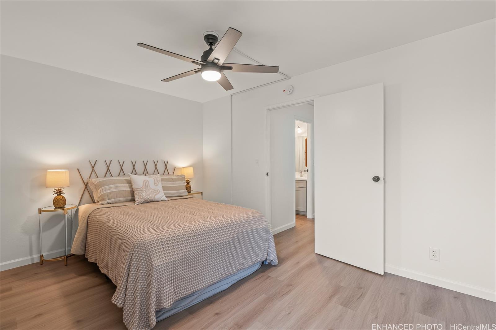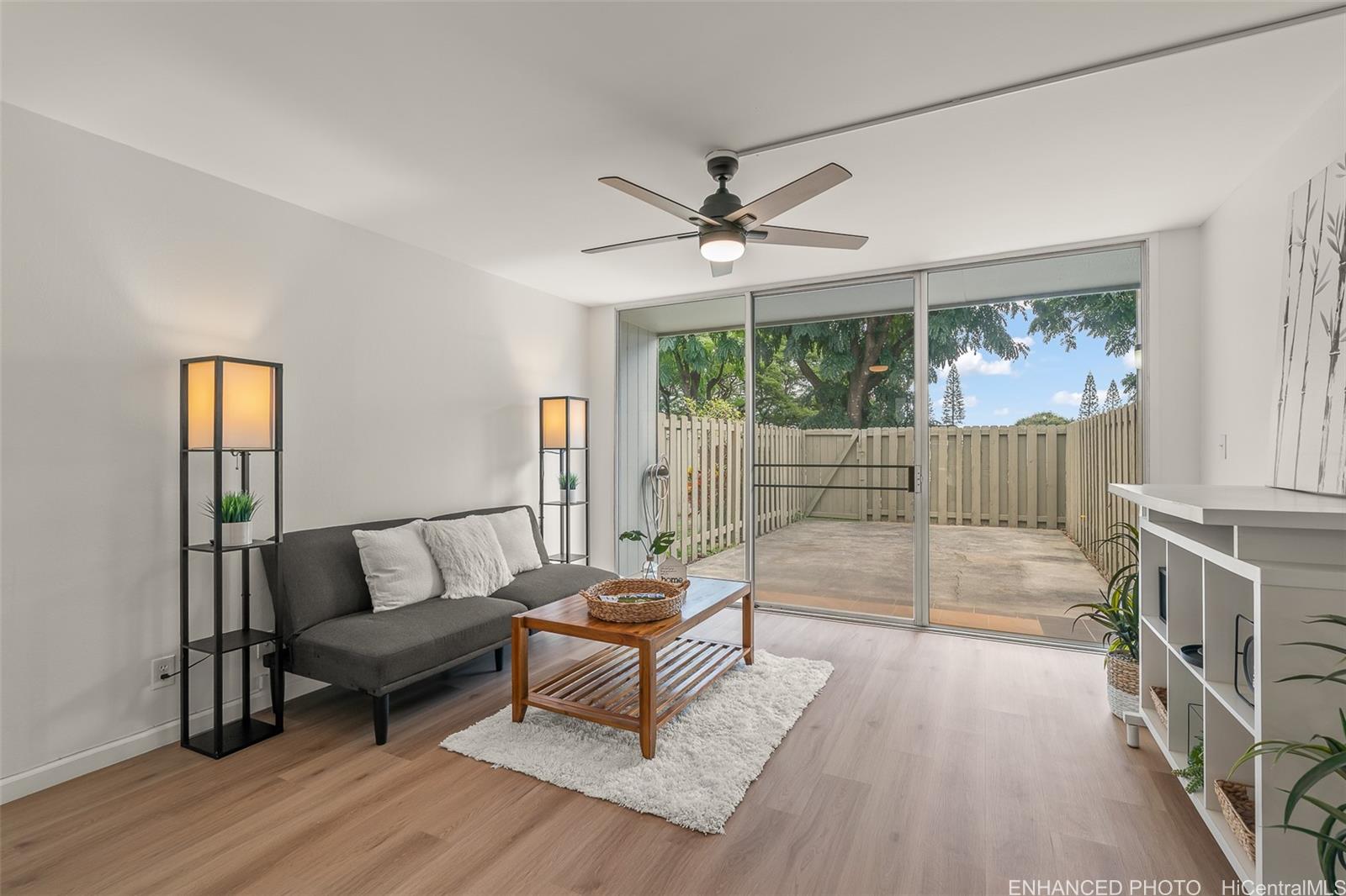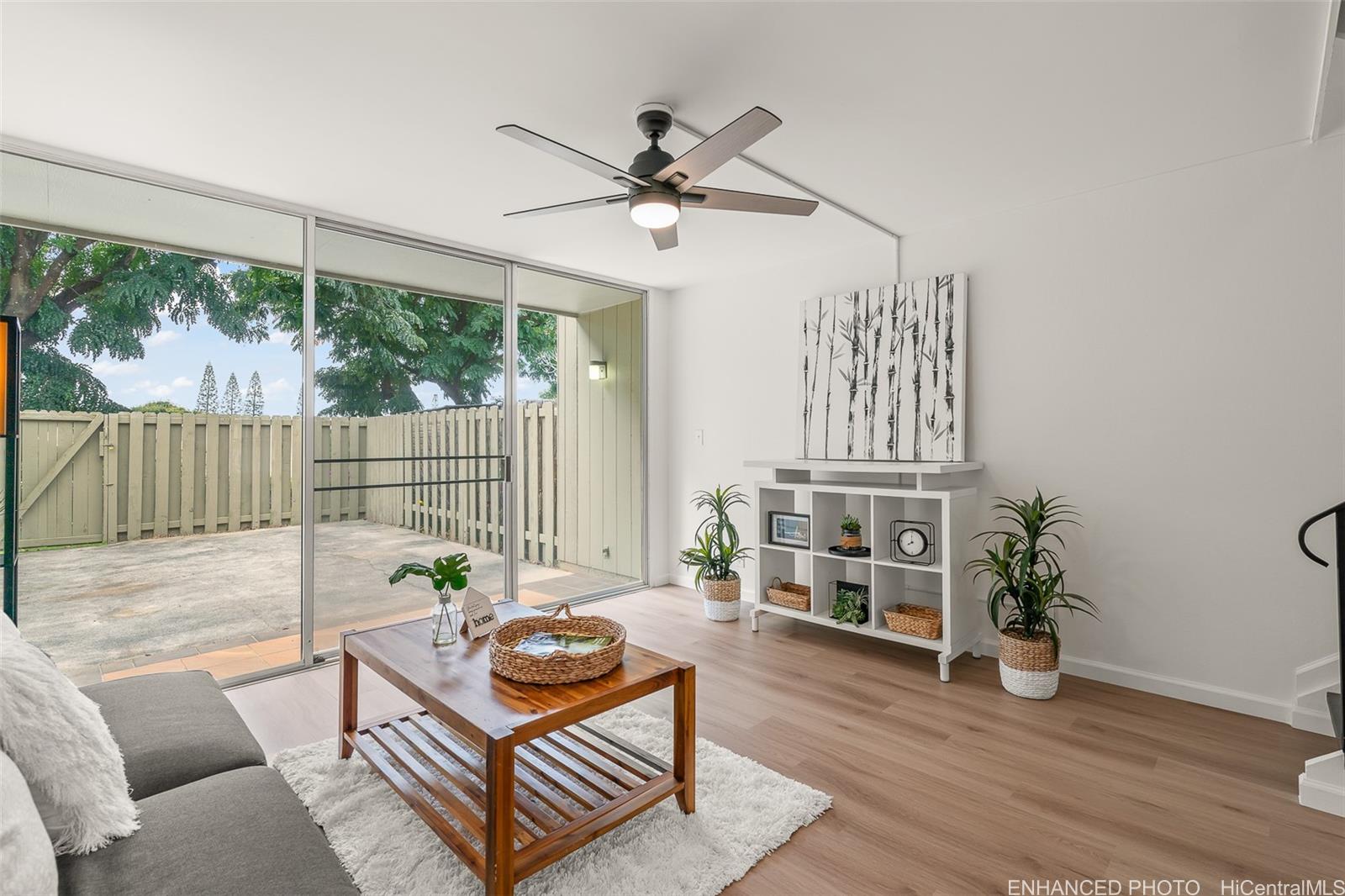 Welcome home to Hale Kaloapau, a bright and beautifully renovated 2-bedroom, 1.5-bath townhome with 2 assigned parking stalls. This true turnkey gem features brand-new upgrades including fresh interior paint, modern flat-finish ceilings, vinyl flooring, new cabinets and countertops, new ceiling fans, brand new stacked Washer/Dryer, and more! The split-level layout offers both privacy and functional flow for comfortable living. Your fully fenced and cemented private patio offers a seamless extension of the living space, perfect for pets (please verify), storage, or entertaining. Centrally located with easy access for work and play. Experience the full range of amenities of the Mililani Town Association (MTA) with 7 recreation centers, community pools, party halls, meeting rooms, picnic and BBQ areas, and more. MTA’s Rec 3 is conveniently located just across the street. Don’t miss this exceptional opportunity-the seller is offering a $5,000 buyer credit with a full price offer, adding even more value to this stylish untouched treasure, a blank slate ready for you to add your personal touch.