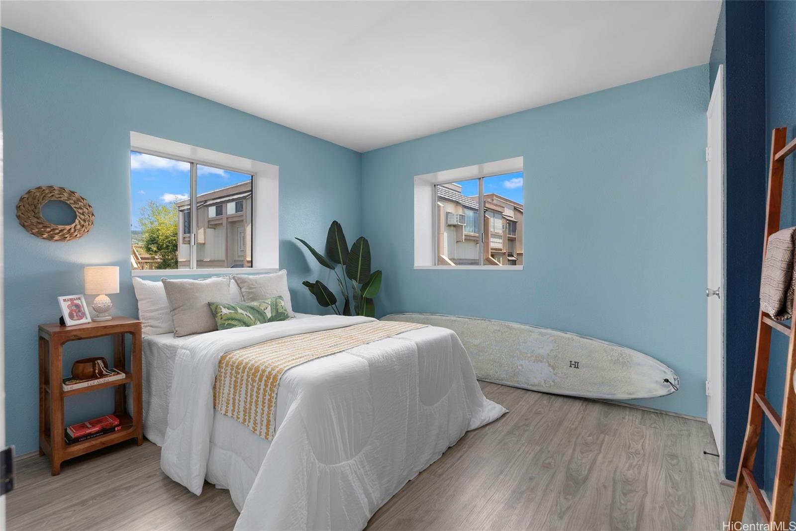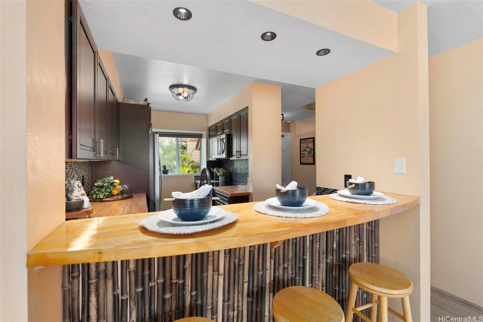 Welcome to this beautifully maintained 2-bedroom, 2-bath corner townhouse in Aiea, offering 1,035 sqft of interior space and a 99 sqft open lanai. This two-level home features a beautifully renovated kitchen on the main floor and both bedrooms and bathrooms upstairs for added privacy. As a desirable corner unit, enjoy extra natural light and refreshing cross breezes thanks to the additional living room window. Located in the heart of Aiea, you’re just minutes from Pearlridge Center, grocery stores, dining, parks, schools, and quick freeway access. Ideal for military families with close proximity to Joint Base Pearl Harbor-Hickam, Tripler, and Camp Smith. A rare opportunity to own a move-in-ready townhome. Seller offering VA assumption to eligible buyers. Maintenance Fee is $796.14, reserve contribution $206.16, and cable TV $54.41. VA Assumable estimated mortgage remaining balance $460,840 (small gap), interest rate 3.25%, principal and interest $2,159.30, servicer Freedom Mortgage. Seller’s will consider non VA buyers!