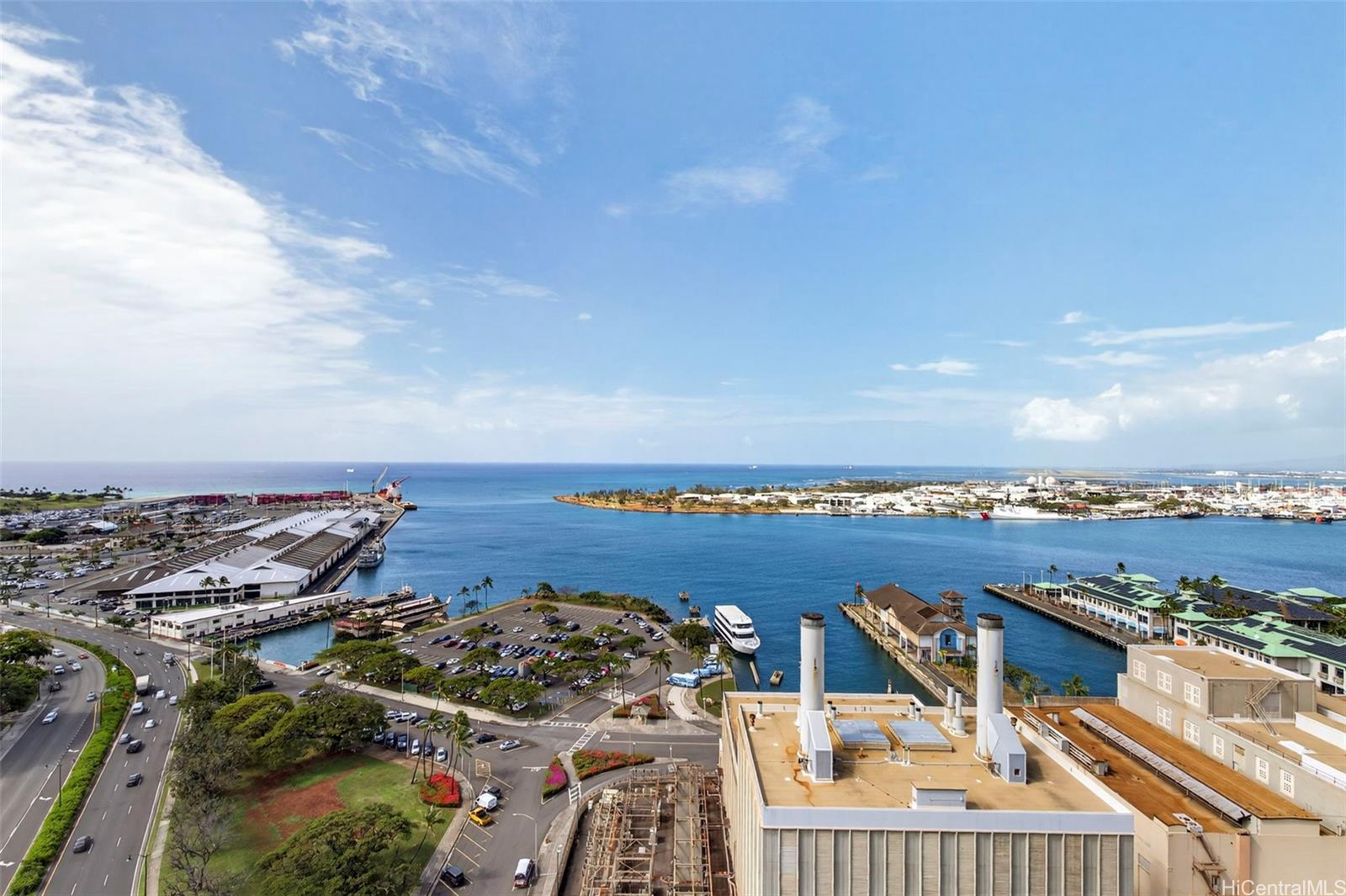 Breathtaking, unobstructed wide-angled views of the harbor and sparkling ocean from the spacious living room and two bedrooms!Wake up and wind down to panoramic ocean vistas that truly define island living. This well-maintained residence features vinyl flooring throughout and travertine tile in the bathroom for a clean and timeless finish. The living room is enhanced by showcase wall lighting and a recessed ceiling, creating a warm and elegant ambiance. The kitchen includes granite countertops, stainless steel appliances, and a wine chiller. Central air conditioning provides year-round comfort. The maintenance fee includes electricity, cable, internet, water, sewer, and refuse, offering exceptional value and convenience. One covered parking stall included. Harbor Square offers a sixth-floor recreation deck with pool and BBQ area. Located near restaurants, shops, businesses, and Downtown Honolulu.
