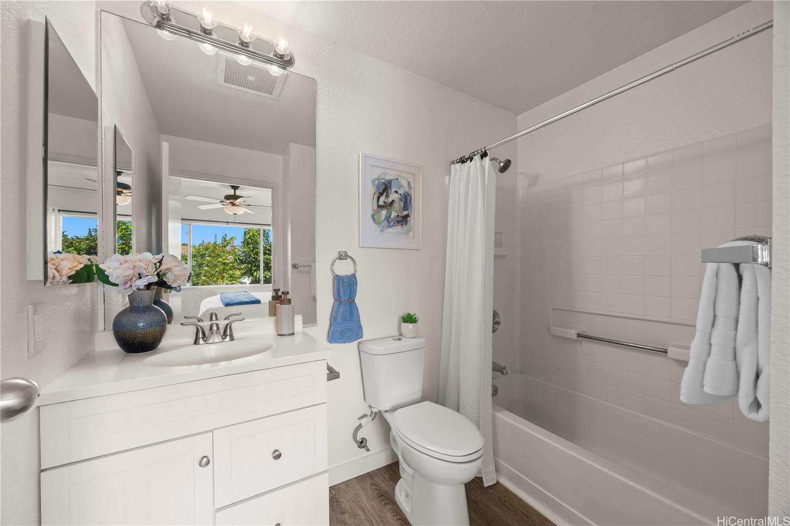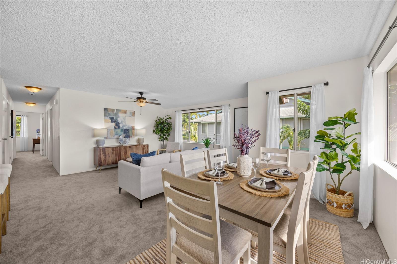 Spacious end-unit residence featuring tranquil green views and excellent natural airflow. Recently updated with new flooring throughout (carpet and vinyl), and new ceiling fans, creating a fresh and move-in-ready feel. The kitchen is equipped with a new range hood. This upstairs unit offers a functional layout and two convenient parking stalls located directly in front of the stairway.The pet-friendly complex is well located near the entrance, offering easy access in and out. Enjoy the convenience of being within walking distance to an elementary school, and close proximity to parks, shopping, military bases, and H-2 Freeway.