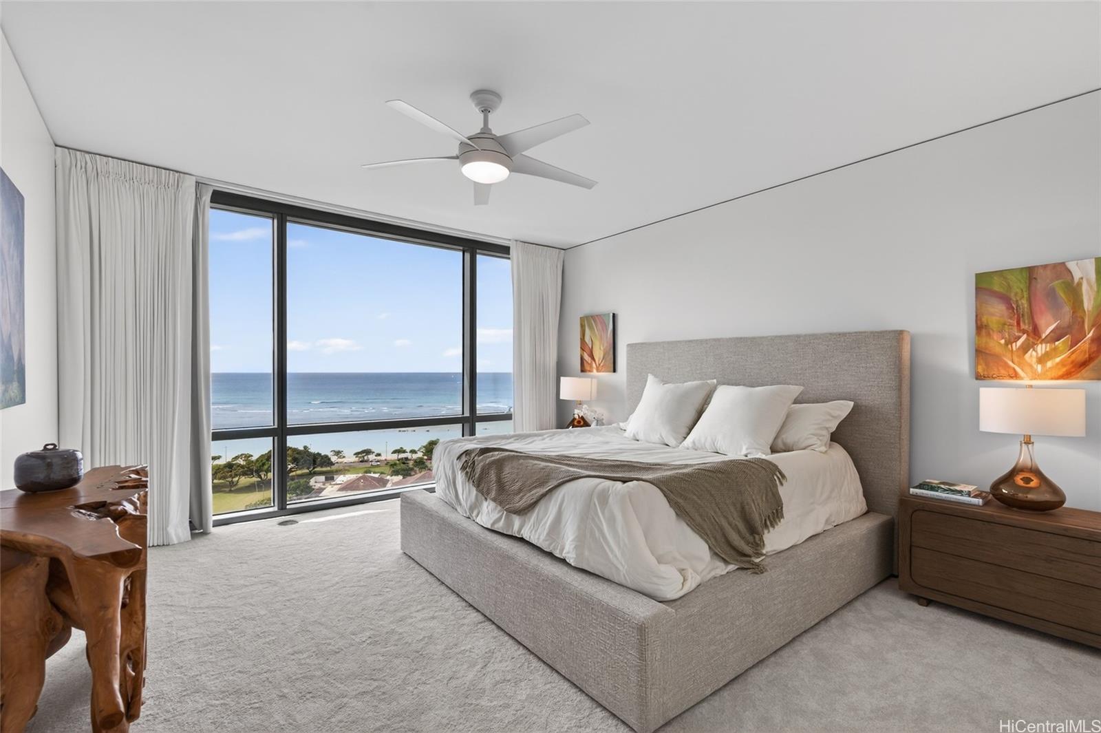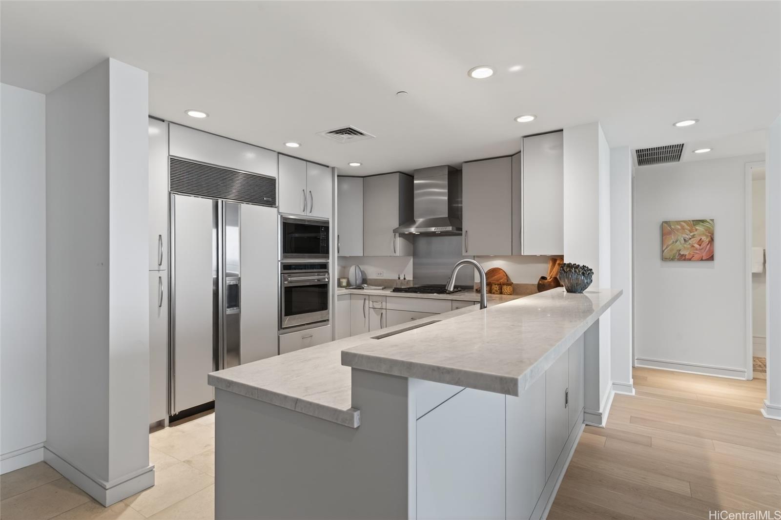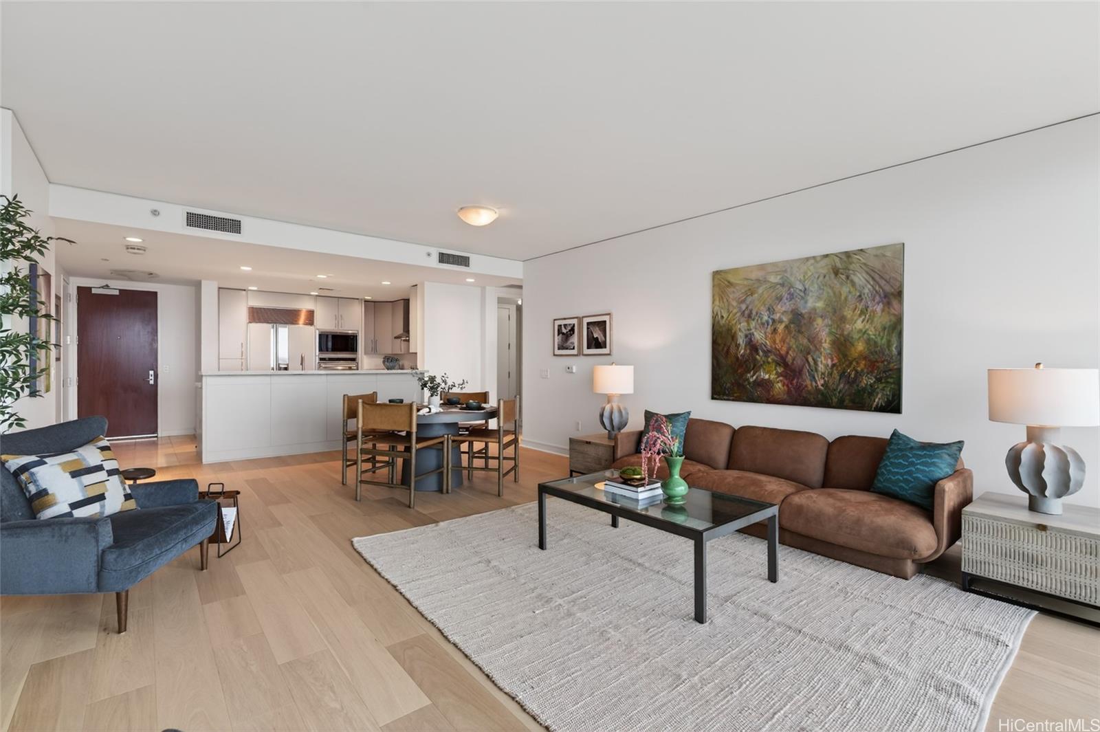 Welcome to the beautifully remodeled Residence 15E at Hokua, Honolulu’s perennial luxury condominium. This highly desirable and rarely available 2-bedroom 2-bath “E” floor plan features bedrooms positioned on opposite sides of the living room with brand new engineered hardwood flooring. Floor-to-ceiling windows fill the space with natural light while capturing breathtaking unobstructed ocean, coastline and Diamond Head views. An updated gourmet kitchen with quartz countertops and refinished custom cabinetry compliment the premium Wolf and Sub Zero appliances making this spacious 1,531 sf unit ideal for entertaining. The primary suite offers a relaxing retreat with a spa-like bath and walk-in shower, while the second bedroom is generously sized. Enjoy Hokua’s renowned first-class service and resort-style amenities living in one of Kakaako’s premier luxury condominium. Perfectly located near Ala Moana Center, Ala Moana Beach Park, Ward Village, and all the shopping and dining opportunities that the neighborhood offers.