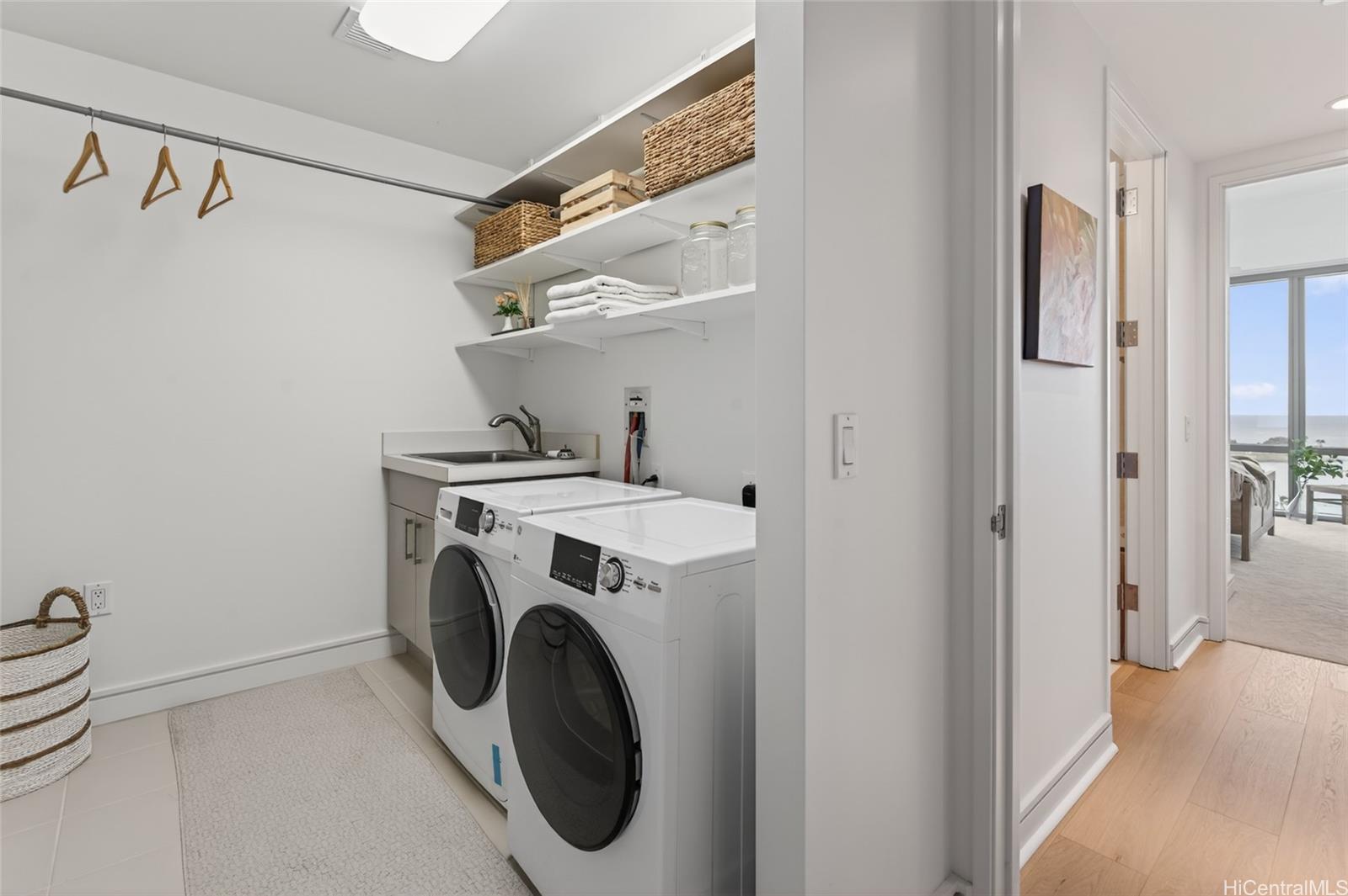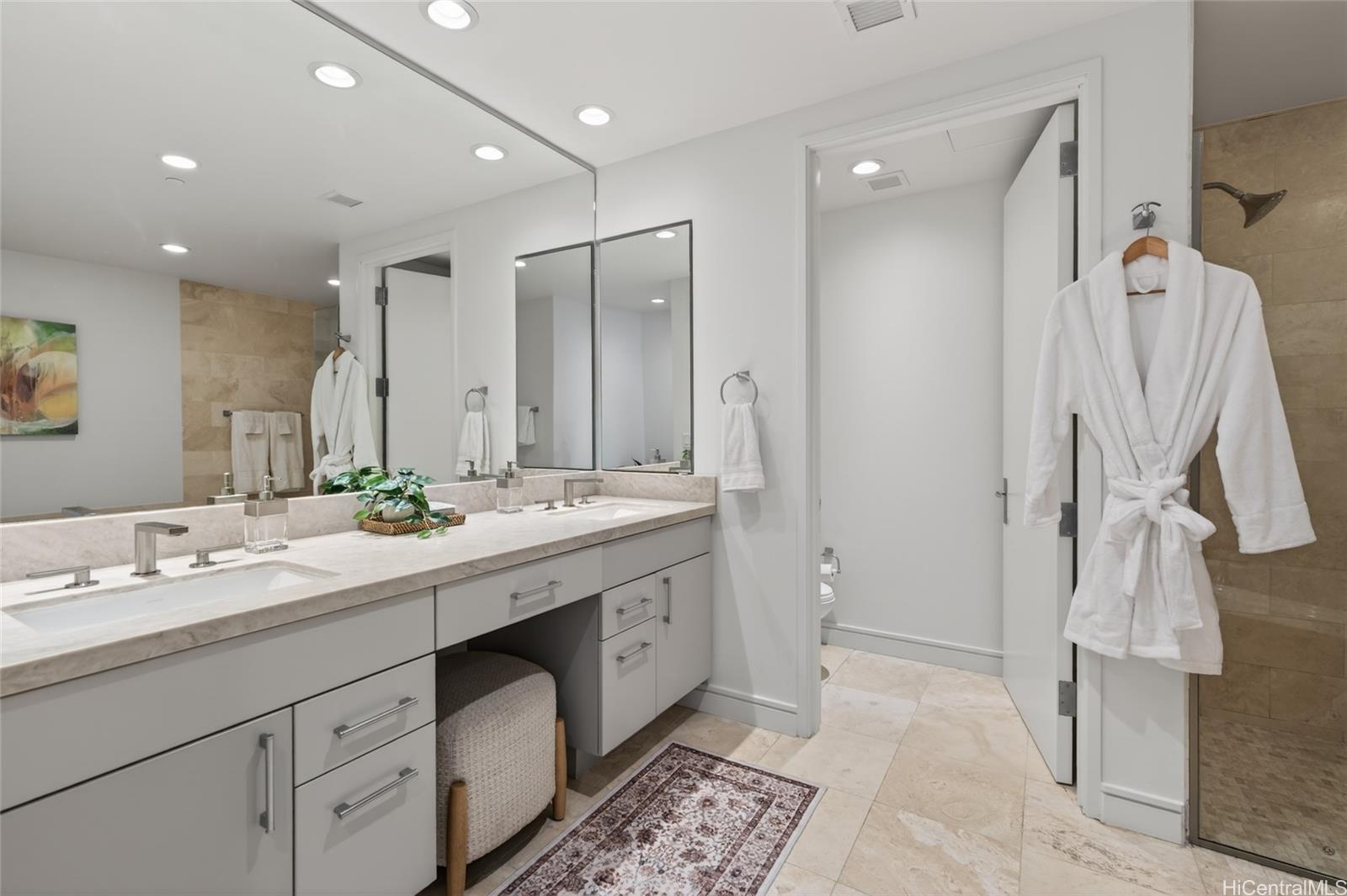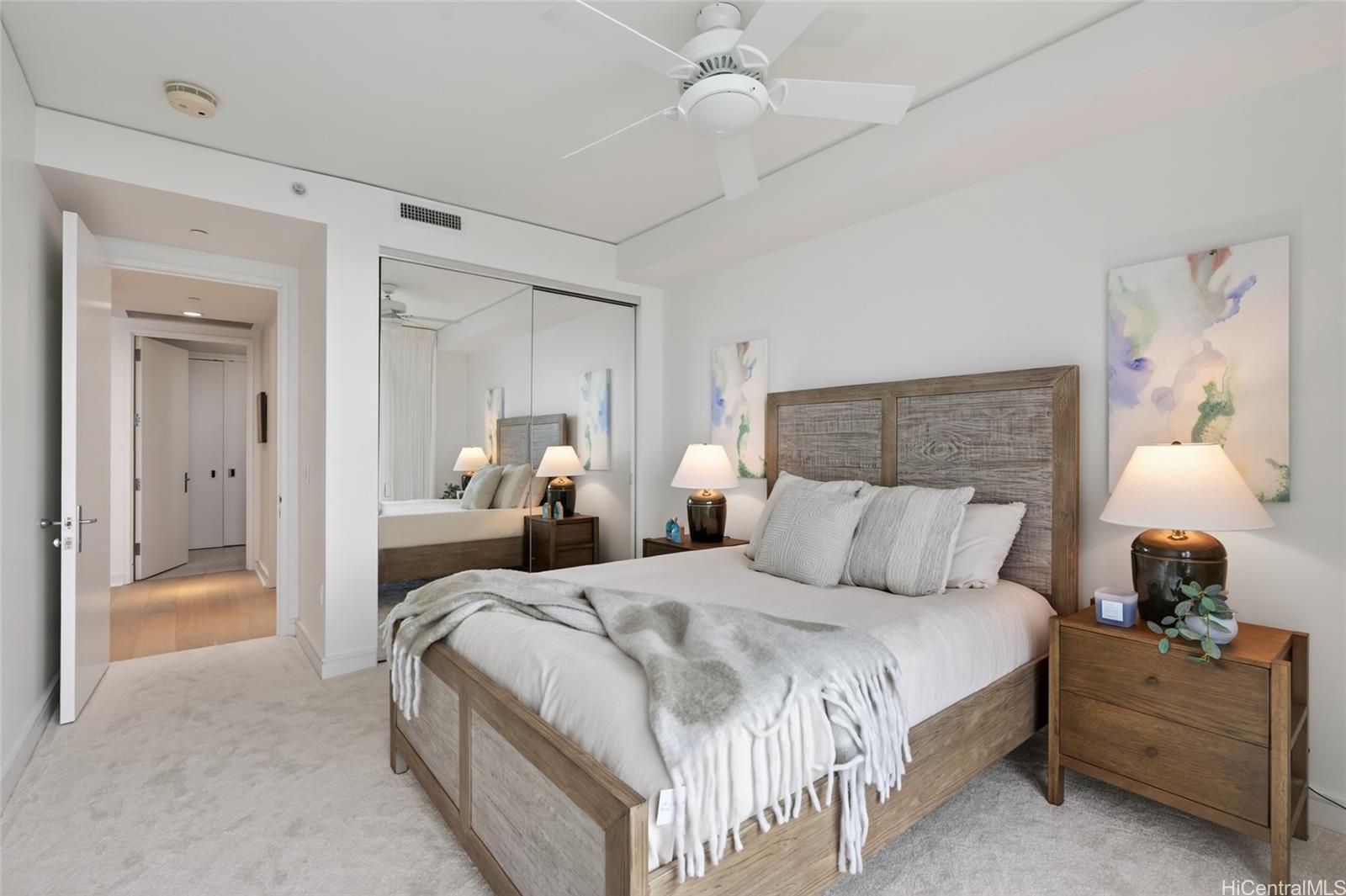 Welcome to the beautifully remodeled Residence 15E at Hokua, Honolulu’s perennial luxury condominium. This highly desirable and rarely available 2-bedroom 2-bath “E” floor plan features bedrooms positioned on opposite sides of the living room with brand new engineered hardwood flooring. Floor-to-ceiling windows fill the space with natural light while capturing breathtaking unobstructed ocean, coastline and Diamond Head views. An updated gourmet kitchen with quartz countertops and refinished custom cabinetry compliment the premium Wolf and Sub Zero appliances making this spacious 1,531 sf unit ideal for entertaining. The primary suite offers a relaxing retreat with a spa-like bath and walk-in shower, while the second bedroom is generously sized. Enjoy Hokua’s renowned first-class service and resort-style amenities living in one of Kakaako’s premier luxury condominium. Perfectly located near Ala Moana Center, Ala Moana Beach Park, Ward Village, and all the shopping and dining opportunities that the neighborhood offers.