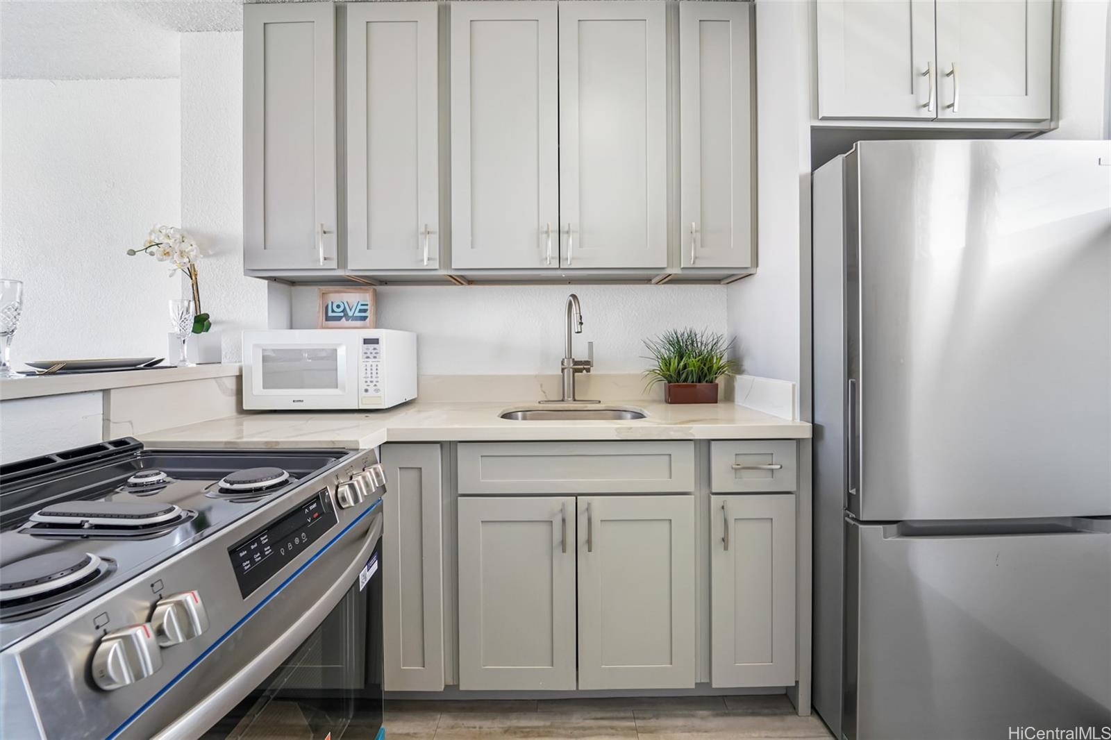 Experience convenient living in the heart of Kalihi close to the shopping center, schools, businesses, restaurants and bus routes. Recent upgrades to this well maintained 2/1 unit include new ceiling light fans in all rooms to help keep you cool and a new security door. Enjoy your kitchen with a brand new gas stove and refrigerator. Unit includes one assigned parking. Building complex is fully gated. Maintenance fee includes electricity, gas, water, and sewer. Schedule your showing today!