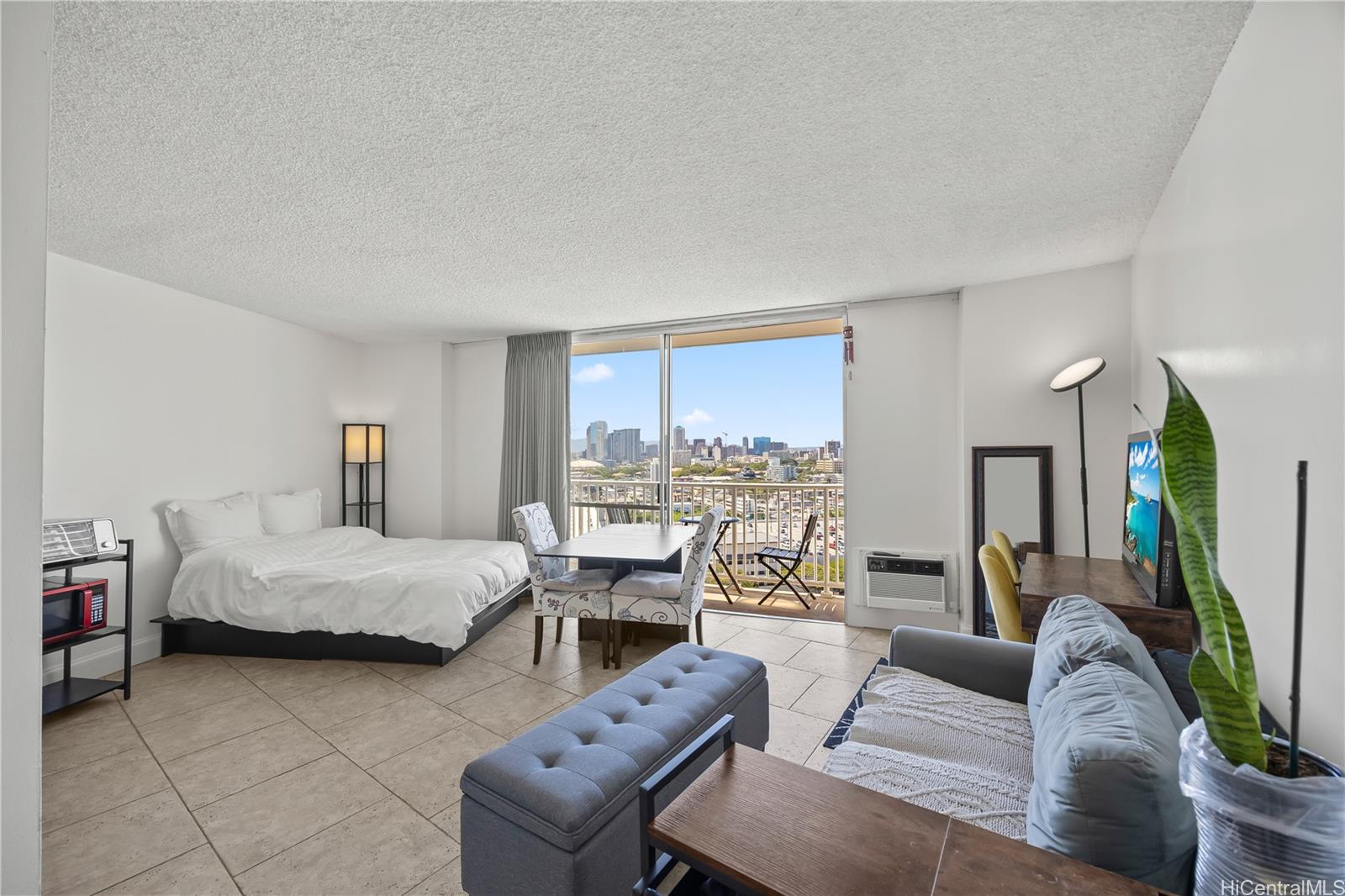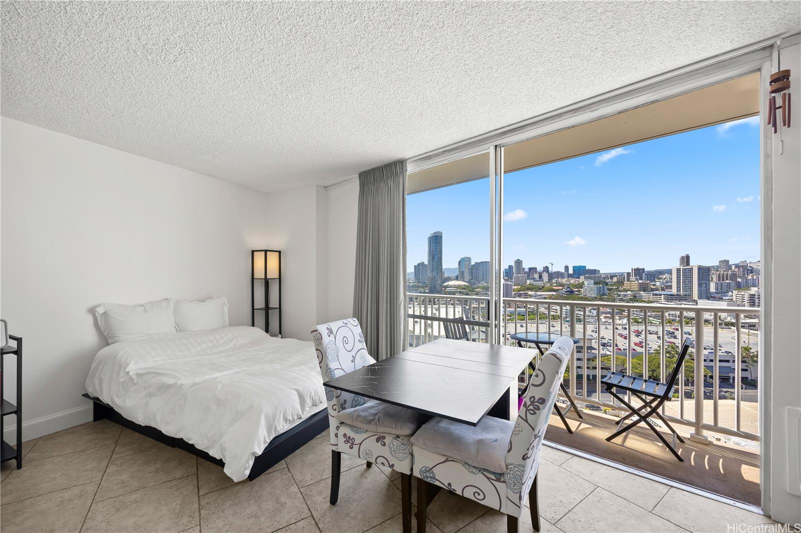 Amazing views! Centrally located in the heart of Honolulu, this well-maintained studio in Holiday Village offers an excellent opportunity for both owner-occupants and investors. Just minutes from Ala Moana, Ward Village, and Waikiki, the location provides easy access to shopping, dining, beaches, and major transit routes. The unit features tile flooring throughout and a functional open layout with a full kitchen, cabinet storage, and dining area. Step onto your private lanai to take in expansive city views with—perfect for enjoying island breezes and natural light. Maintenance fee includes electricity, water, and sewer! Window AC to keep you cool on warm days. Holiday Village is a secured building with on-site security and amenities including a swimming pool, community laundry, and landscaped recreation areas. Parking is currently waitlisted, with nearby options available at Pagoda Hotel and along Amana Street.A great opportunity to own in a highly convenient urban location.
