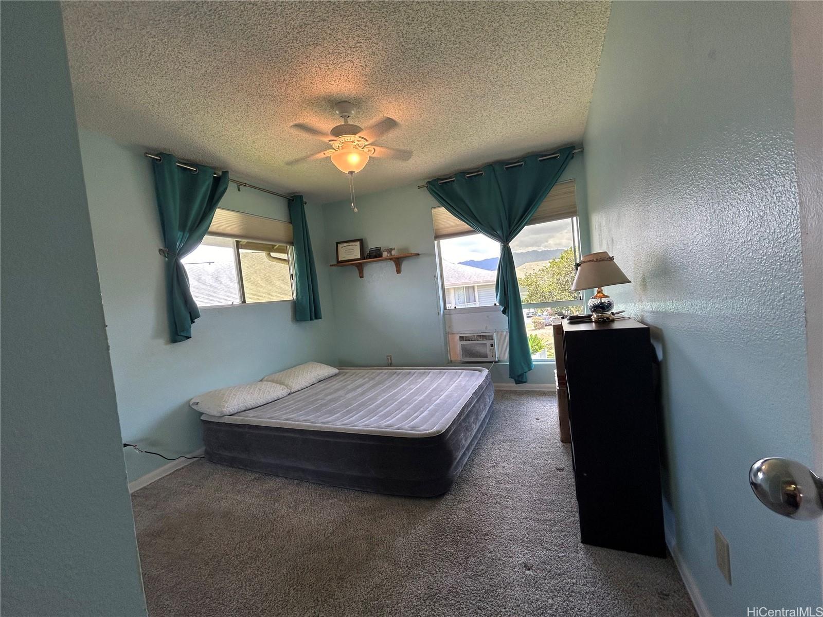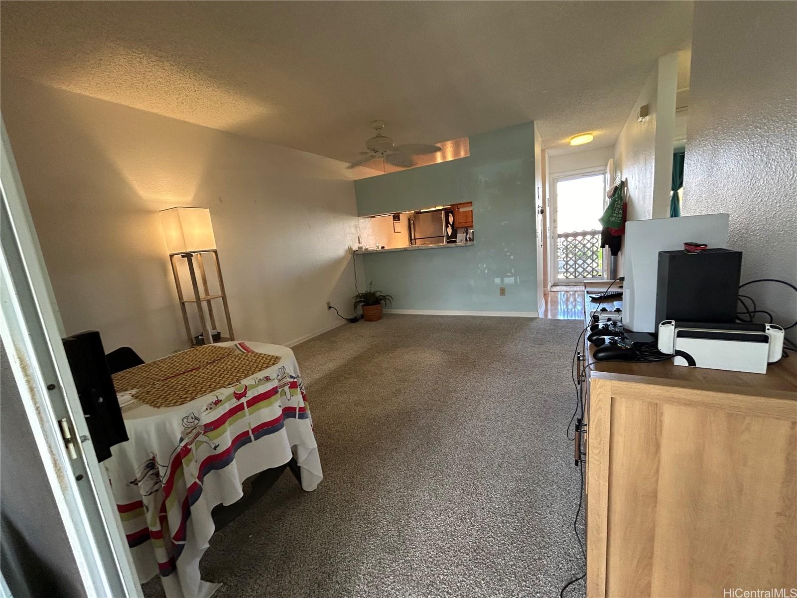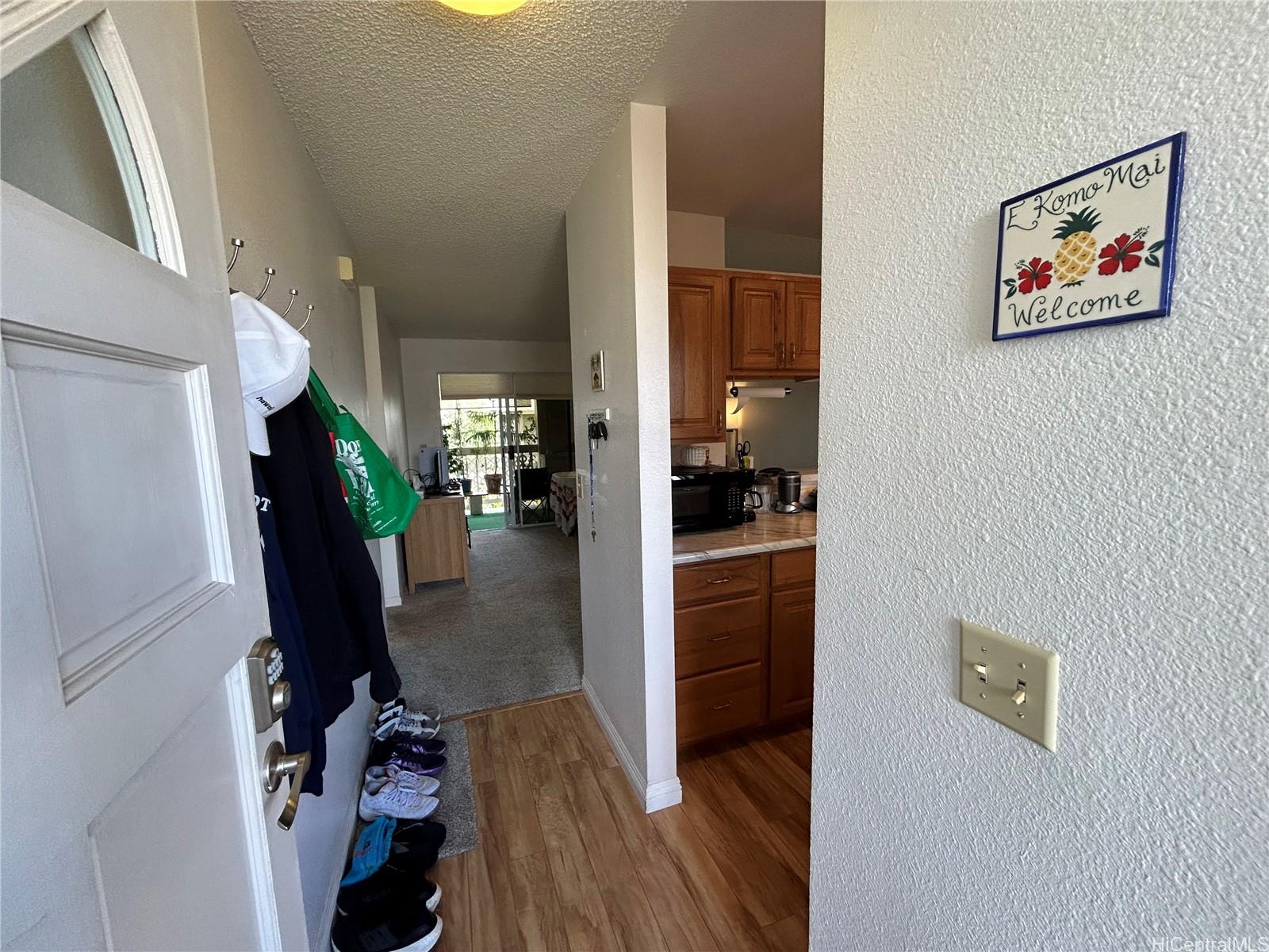 Well maintained move-in ready: Fee-simple, 2 bdrm/1ba 2nd floor end unit inquiet well maintained Ho’okumu at Waikele. The unit features plenty ofnatural light, west facing lanai for enjoyable sunset views. Bedrooms, living rmhave ceiling fans. The primary/main bedroom has a window mounted A/C, and mirroredcloset doors. New wall-to-wall carpet installed Oct. ‘24 in bdrms, hall, and livingrm. The bathroom has a tub/shower combo w/sliding glass doors, recentlyinstalled porcelain tile floor and alcove with the in-unit washer/dryer. Kitchen hasceramic top stove w/self-cleaning oven, garbage disposal, and refrigerator. Allcabinets are solid wood, a pass-through bar, and custom countertops. Kitchen andentryway has laminated wood flooring. Other features; EcoNet water heater lessthan 3 yrs old, RING doorbell system, electronic programmable front door lock,tinted windows with honeycomb style light filtering blinds, Hawaiian Telcom fiber-optic internet and cable access. 1 assigned parking stall, uncovered, guest parking availwith restrictions, nearby street parking. Complex offers car wash areas.