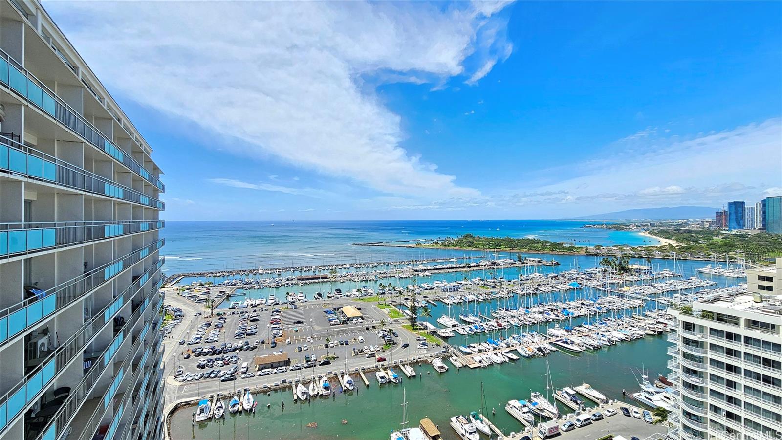 Enjoy breathtaking panoramic views of the ocean, boat harbor, and coastline from this high-floor unit in the desirable Marina wing ofthe Ilikai. This fully furnished, turn-key residence participates in the Aqua-Aston rental program, offering an appealing opportunityfor rental use. Ideal for both personal enjoyment and investment, owners have the flexibility to use the unit during their stays in Waikikiwhile benefiting from the convenience of on-site hotel management for daily rentals. Experience the perfect blend of island lifestyleand versatility in one of Waikiki’s most iconic building.