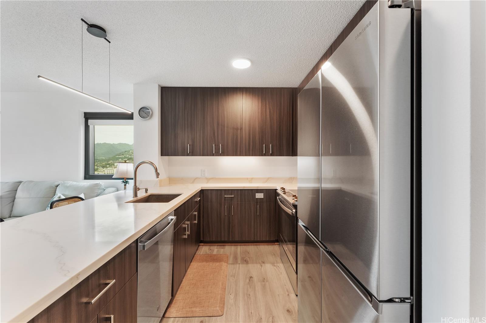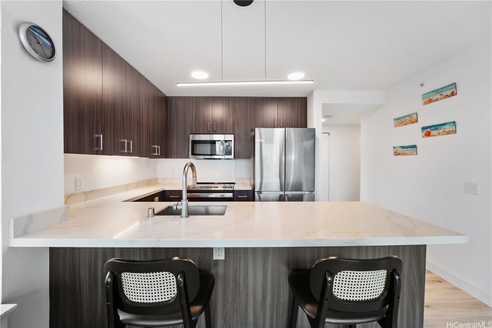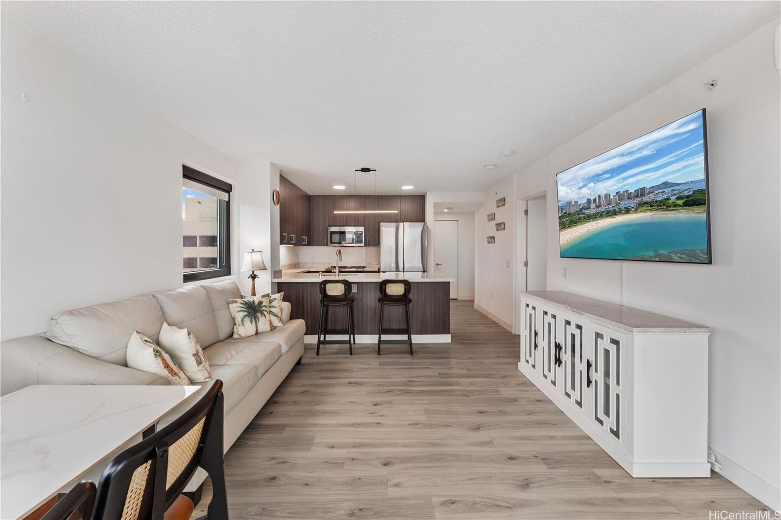 カカアコの中心部に位置する、新装済みの2ベッドルーム・2バスルームの角部屋。屋根付きタンデム式駐車場2台分付き。 この2024年に新築された住宅は、全室に新しいビニール床材、パティオにはタイル床材を採用し、ブラインド付きプランテーション窓を備え、清潔でモダンな美観を実現しています。 この好立地の角部屋からは、ダウンタウン・ホノルルの眺望、緑豊かな山々の背景、そして象徴的なアロハタワーを一望できます。 当施設では、多目的ルーム、スプラッシュプール、バーベキューエリア、コミュニティガーデン、パッティンググリーン、屋外シネマ、自転車・サーフボード工房、そして美しくデザインされたコワーキングスペースなど、リゾートスタイルのアメニティを豊富にご用意しております。 .