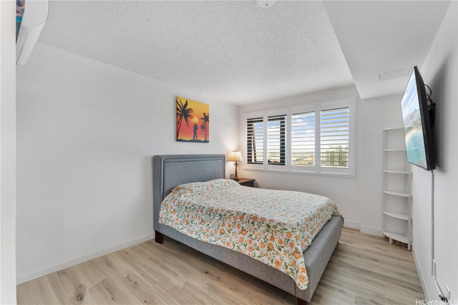 Newly renovated 2-bedroom, 2-bath corner unit with 2 covered tandem parking stalls, located in the heart of Kaka’ako. This newly completed 2024 residence features new vinyl flooring throughout, tile flooring on the patio, and plantation windows with blinds, creating a clean, modern aesthetic. Enjoy sweeping views of Downtown Honolulu, the lush mountain backdrop, and the iconic Aloha Tower from this well-positioned corner unit. The building offers an impressive array of resort-style amenities, including a multipurpose room, splash pool, BBQ areas, community garden, putting green, outdoor cinema, bicycle and surfboard workshop, and a beautifully designed co-working space.