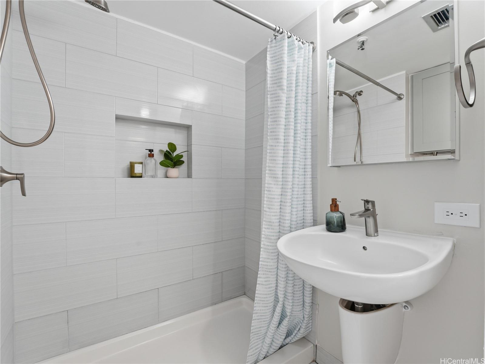 Discover the ultimate blend of chic urban living and tranquil island vibes in this well-priced + beautifully renovated studio on the 32nd floor of Iolani Court Plaza. Enjoy sweeping views of vibrant sunsets, Honolulu city lights, lush mountains, and the ocean—all framed by expansive wall-to-wall windows that flood the space with natural light. Designed with comfort and accessibility in mind, this unit features a sleek walk-in shower, in-unit stacked washer/dryer, central AC, and no stairs required to reach the parking stall. Prime location near Waikiki beaches and numerous dining, shopping, and recreation options just minutes away.This well-maintained building offers an impressive array of amenities designed for both relaxation and recreation, including a sparkling swimming pool, soothing hot tub, sauna, pickleball + tennis courts, BBQ area, and more. With low maintenance fees that cover central AC, electricity, hot water, internet, cable, plus the peace of mind of an nearly-completed re-piping project without any fee increases or assessments, this is a rare opportunity to embrace effortless living at its finest.
