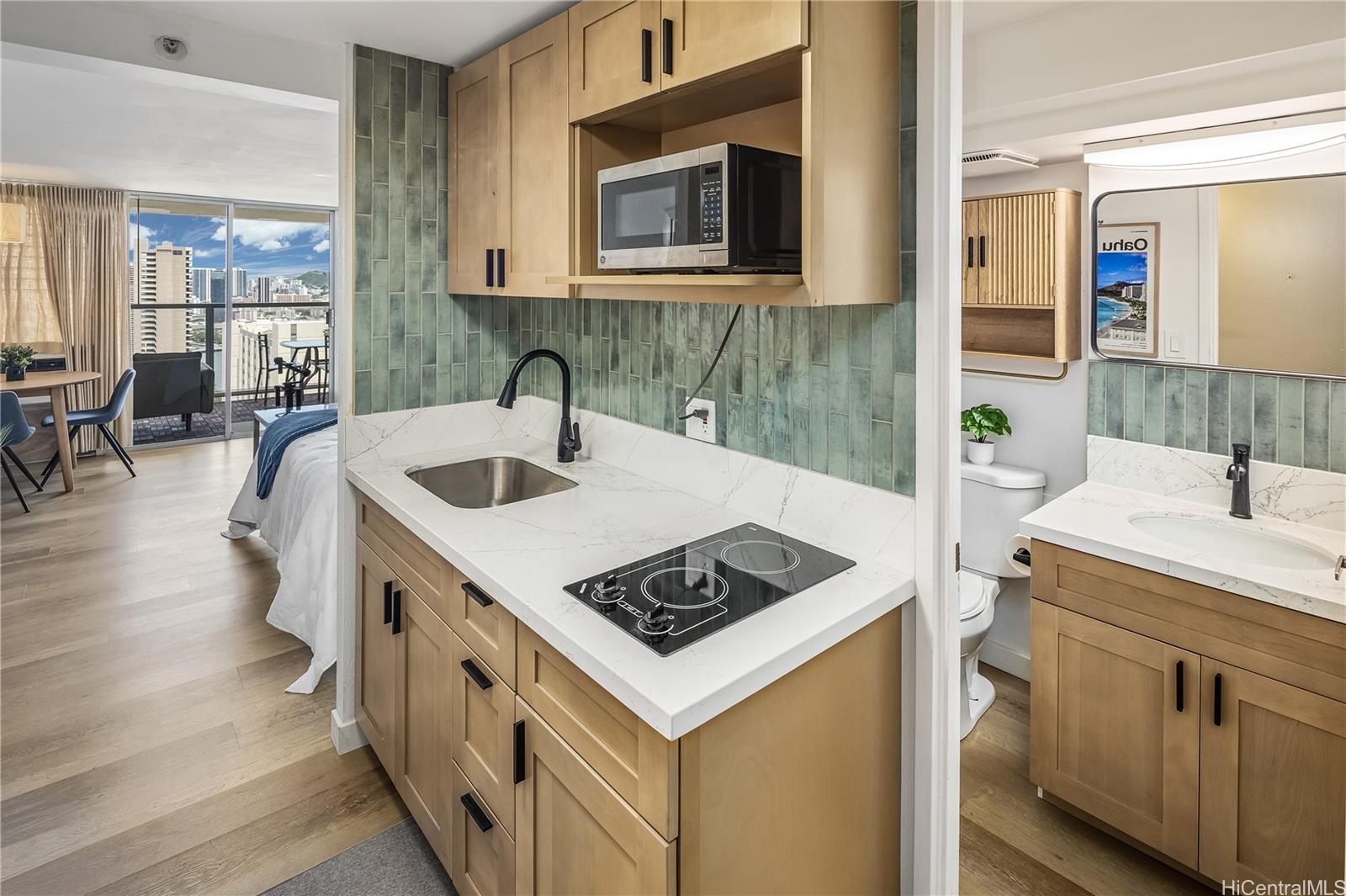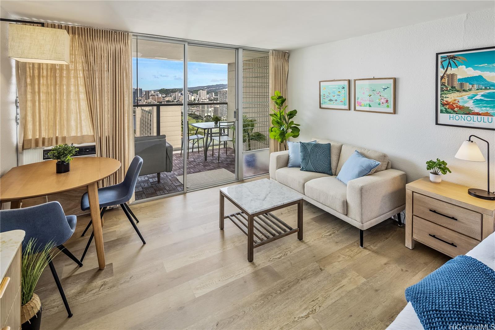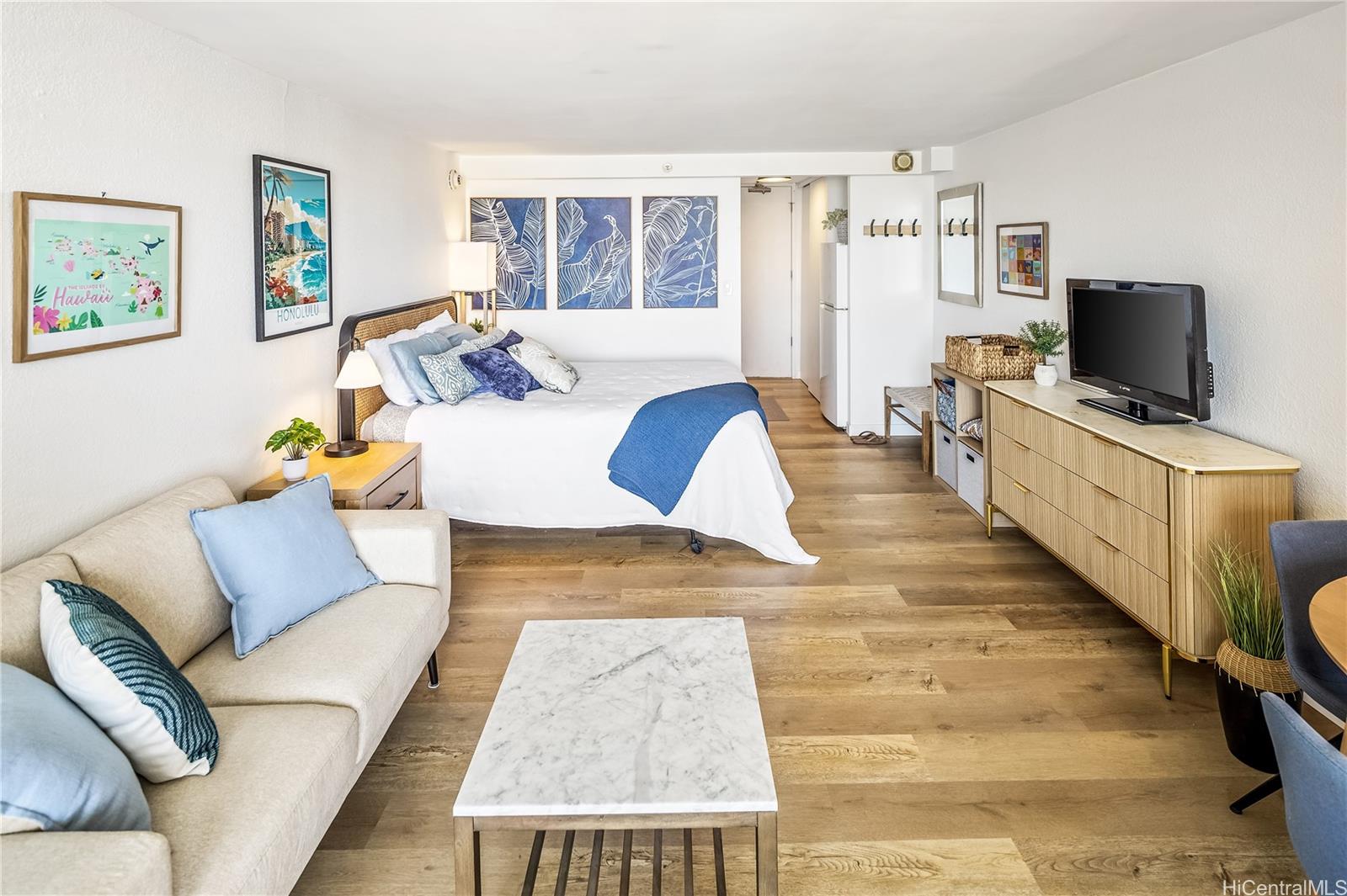 Perched on the 39th floor in the desirable Island Colony, Unit 3916 offers ocean, city and marina views and a beautifully refreshed interior. This newly renovated studio is thoughtfully designed to maximize space, light, and comfort, featuring modern finishes and a clean, contemporary aesthetic. Fully furnished and completely turnkey, this unit is ready for immediate enjoyment or rental use. The open layout flows seamlessly to a private lanai where you can take in stunning views of the Pacific Ocean and city skyline—perfect for relaxing mornings or sunset evenings. Ideal as a primary residence, vacation getaway, or investment property, Unit 3916 combines convenience, style, and breathtaking scenery in one of Waikiki’s most sought-after buildings. Island Colony is located in the center of Waikiki, just two blocks from world-famous Waikiki Beach and a stone’s throw from International Marketplace, Royal Hawaiian Shopping Center, night life, shopping and restaurants galore. Building amenities include a swimming pool, hot tub, sauna, fitness room, barbecue area, community laundry, sundry store and 24-hour security desk. Check out the virtual tour!