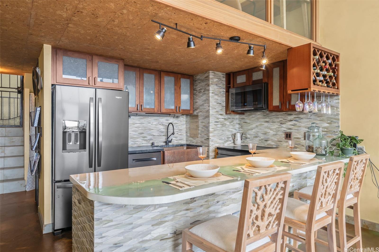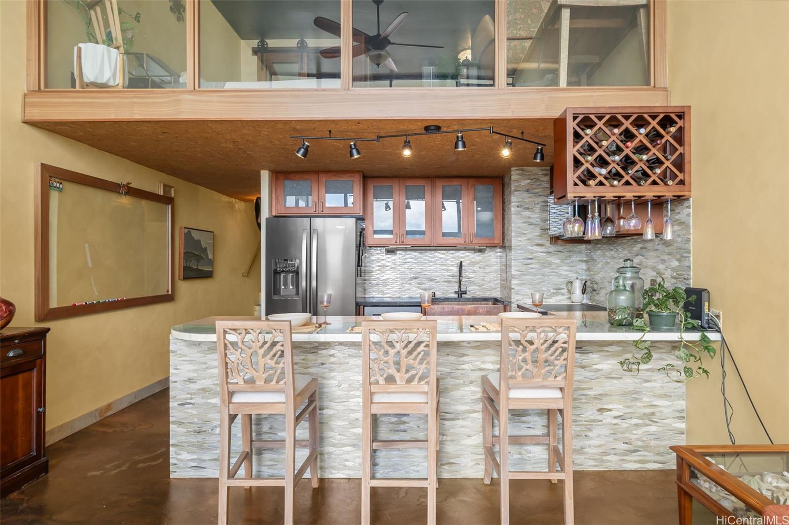 Welcome to one of the most luxurious apartments in Ka Hale Moi. Unit 502 has been meticulously renovated with custom touches throughout; this unit is a rare gem, come see it with your own eyes.15-feet floor-to-ceiling windows provide maximum natural light and viewing pleasure of the unbeatable, unobstructed ocean views, sunset and nighttime city lights. Its generously sized lanai makes for added space to entertain & enjoy morning coffee and/or sunset cocktails. Over 120k tasteful renovations include custom, high quality Sapele Wood glass space railing in the primary bedroom overlooks the living area and takes full advantage of the view; acid stain concrete floor brings another unique character to this home; fully updated plumbing system of this unit, brand-new stainless-steel appliances and more. Conveniently located minutes from Queens and Straub Hospitals, Blaisdell Center, Kaka’ako restaurants, Honolulu Art Museum and convenient H-1 access going East and West. A recreation deck and swimming pool are provided for the exclusive use of residents and their guests. Great 2.25% VA Assumable Loan to VA buyers with entitlement, 461K balance. 100% insured building, pet friendly also.