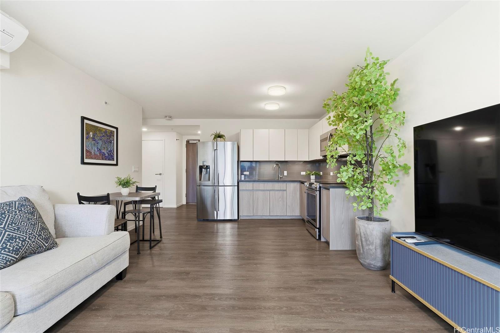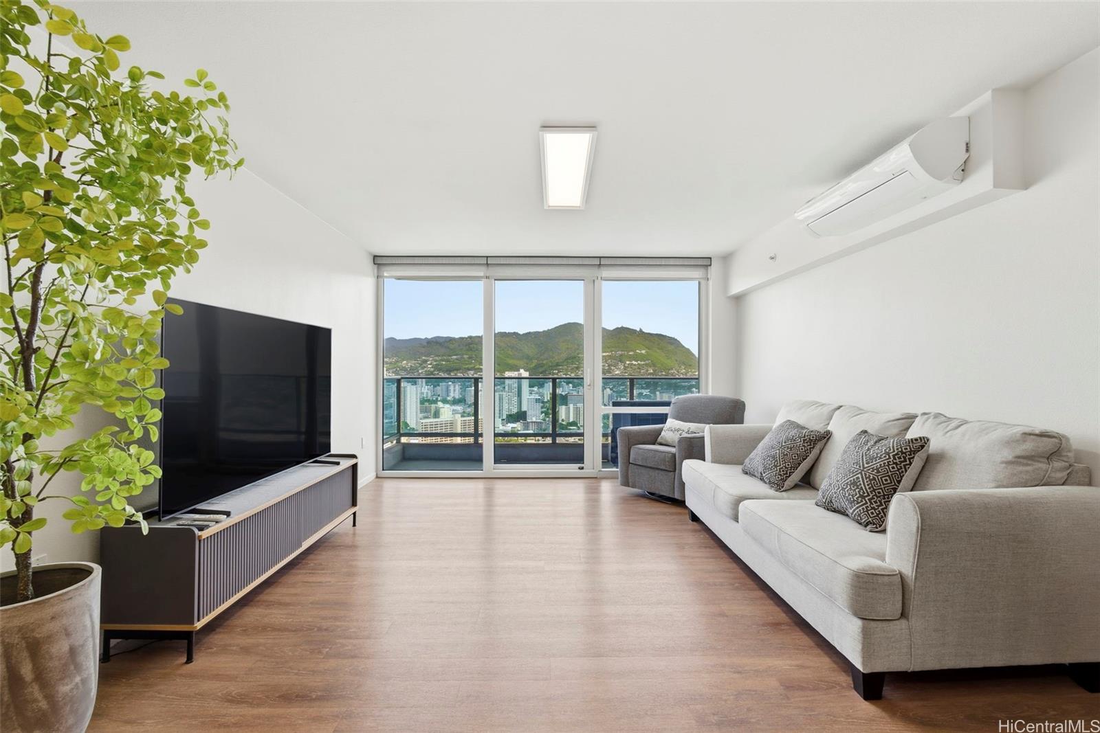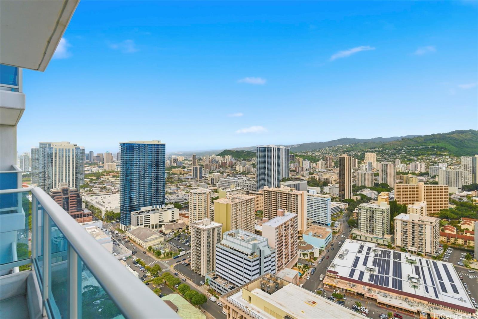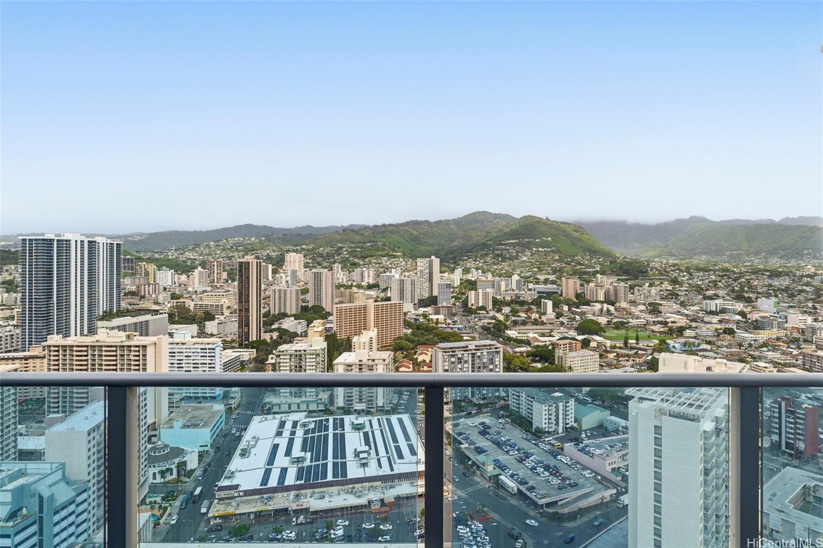 Elevated living awaits on the 40th floor of Kapiolani Residence. This like-new, fully furnished 1-bed, 1-bath condo offers a refined urban retreat w/panoramic mountain & city views. The unit features a private lanai extending the living space & captures Honolulu’s dynamic skyline.The interior is impeccably maintained & move-in ready, w/ laminate flooring throughout the main living areas & a well-appointed kitchen w/ stainless steel appliances & motion-sensored under-cabinet lighting. Remote-controlled blackout blinds in both the living room & bedroom provide privacy,while split ac units in each space ensure year-round climate control. The bedroom offers plush carpeting & picturesque views.Private in-unit laundry room w/ a stackable front-load washer and dryer, along with two separate storage closets. The secure building offers resort-style amenities including a barbecue area, recreation deck, meeting room, EV charging station, & one assigned parking stall. Located near the Hawaii Convention Center, Ala Moana, & world-renowned beaches, this turnkey residence presents a rare opportunity to enjoy luxury, convenience, & elevated island living.