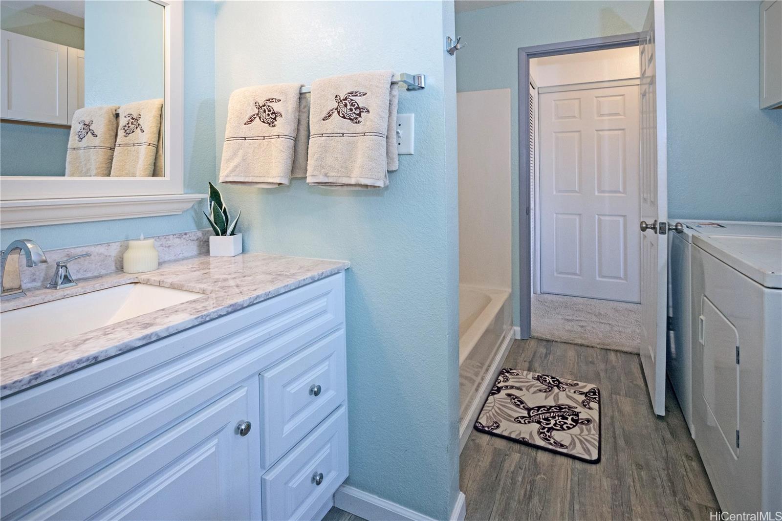 Affordable, VA Approved, Pet-Friendly Living in Highly Desirable Waipio Gentry. Discover the best of Central Oahu living in this smart ownership alternative to renting in this pet-friendly upstairs corner unit at Kauhale – Rainbow Series offering exceptional natural light, refreshing cross-winds, and added privacy with no neighbors above. A move-in ready 2 bedroom, 1 bath, 750 sf of interior space unit with a cozy lanai. Enjoy an updated kitchen with wood cabinets, granite-style counters, laminate flooring, and an open living room layout. Conveniently located near Costco, Waipio Shopping Center, Foodland, Central Oahu Regional Park, Waikele Shopping Centers, and easy access to H-1/H-2 facilitating quick commuting access to Schofield and Pearl Harbor, making this location one of Central Oahu’s most desirable. One assigned parking stall (#46) plus ample guest (13) stalls & street parking. Low HOA fee includes water & sewer. Don’t miss this opportunity to own in a well-maintained, lower-fee complex known for strong demand, convenient access to neighborhood schools, and community pride. Well-suited for owner-occupants seeking comfort, value, and location in one package. Move-in ready.