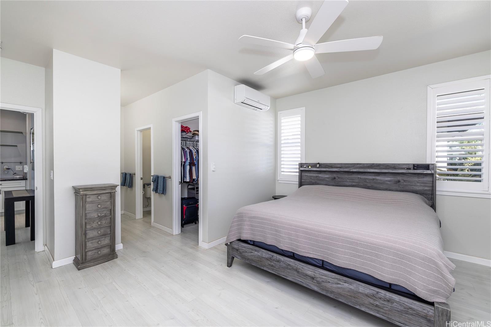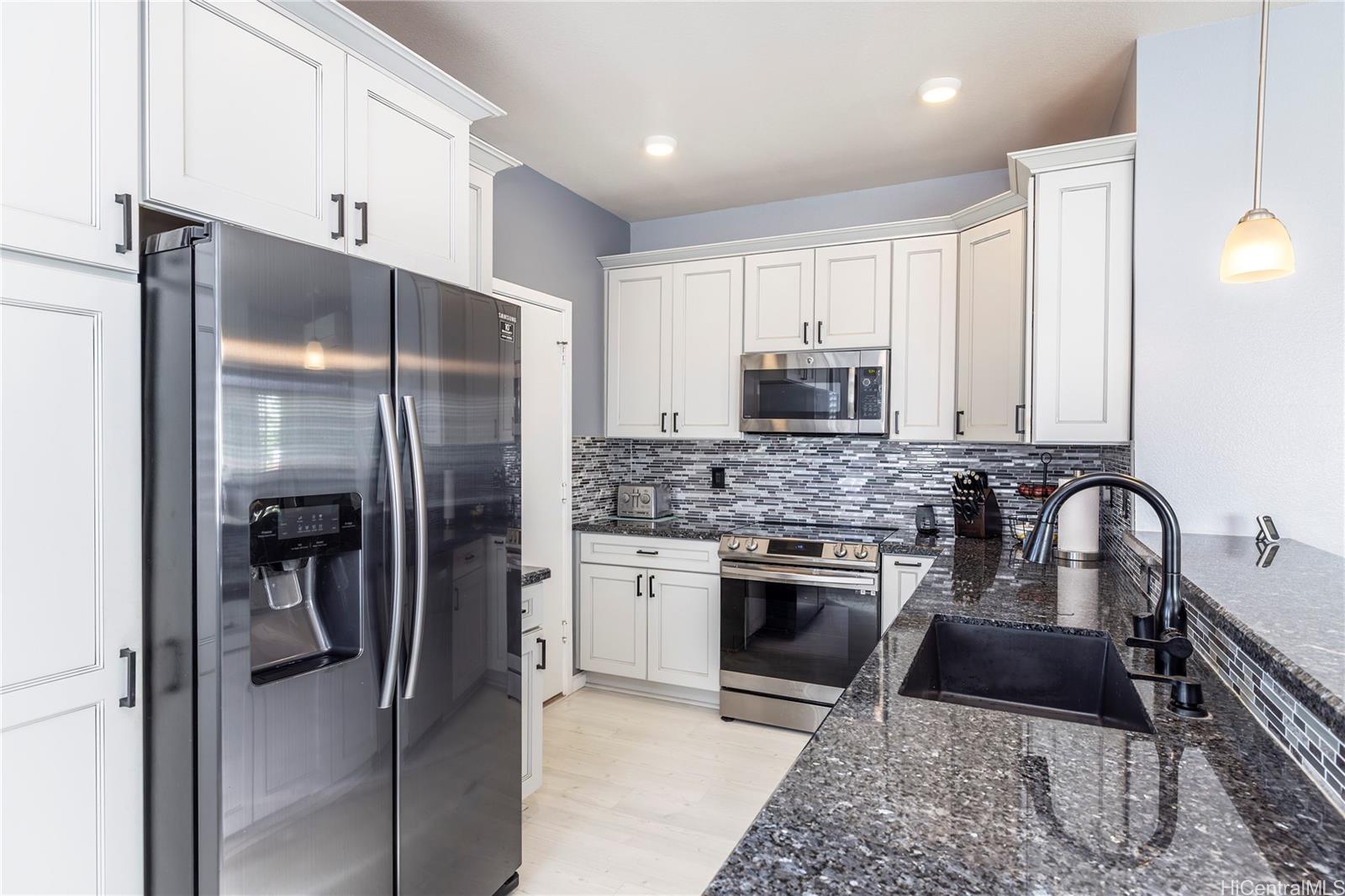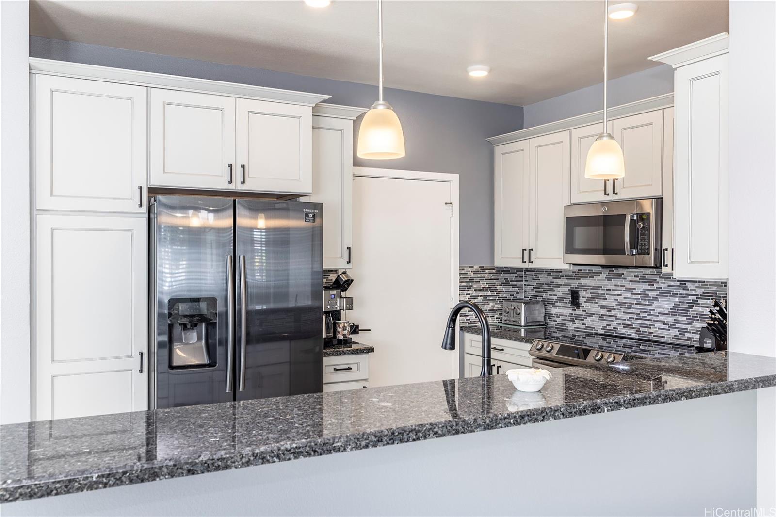 This beautifully upgraded single-level home is located in the desirable Kawena at Mehana community in Kapolei. The property features a fully remodeled kitchen with granite countertops, modern cabinetry with soft-close doors, built-in pullouts, and stainless-steel appliances. The open-concept floor plan provides seamless flow between the living, dining, and kitchen areas, making it ideal for everyday living and entertaining. Thoughtful upgrades throughout include new vinyl plank flooring, polyresin shutters, newly installed gutters, and a Mitsubishi split system AC for enhanced comfort. Additional energy-efficient improvements include leased solar panels and a solar water heater. The home also offers a Vivint alarm system, three spacious bedrooms, two bathrooms, and freshly painted interior and exterior finishes. Residents of Mehana enjoy access to community amenities including a pool, basketball courts, dog park, bike paths, restaurants, shops, and nearby medical facilities. Conveniently situated, this home is just minutes from Ka Makana Ali‘i Shopping Center, the Kroc Center, freeway access, rail transit, and the Ko Olina Resort area.