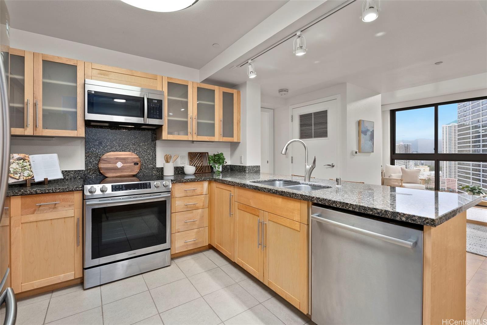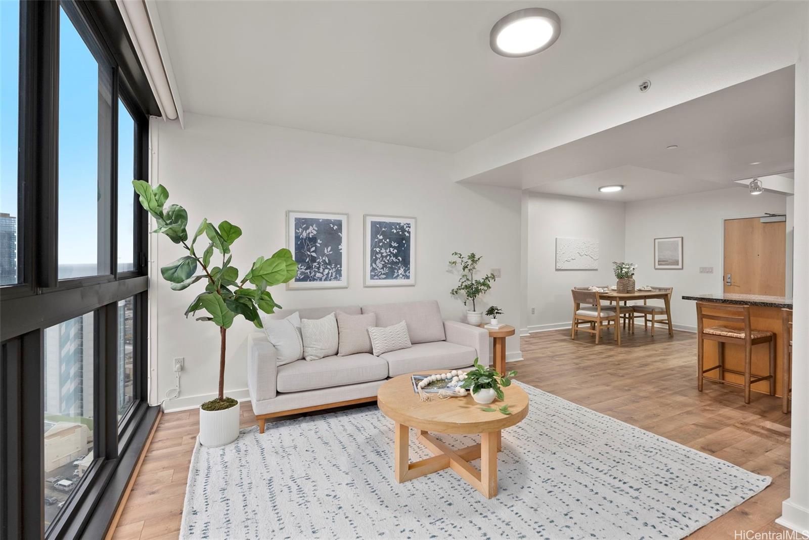 NEW LISTING!! Welcome home to this beautifully maintained 2 bdrm/2 bath/2 parking residence in Keola Lai, where comfort meets convenience in the heart of Kakaako. Featuring laminate flooring and a desirable open-concept floor plan, this home offers a seamless flow perfect for everyday living and entertaining. Expansive floor-to-ceiling windows in the living room flood the space with natural light while showcasing stunning mountain, city and ocean views, creating a bright and inviting atmosphere throughout. Keola Lai offers resort-style amenities including a sparkling pool & whirlpool spa, fitness center, BBQ areas, and 24-hour security, all within minutes of SALT, Ward Village, dining, shopping, and Ala Moana Beach Park. Don’t miss this fantastic opportunity!