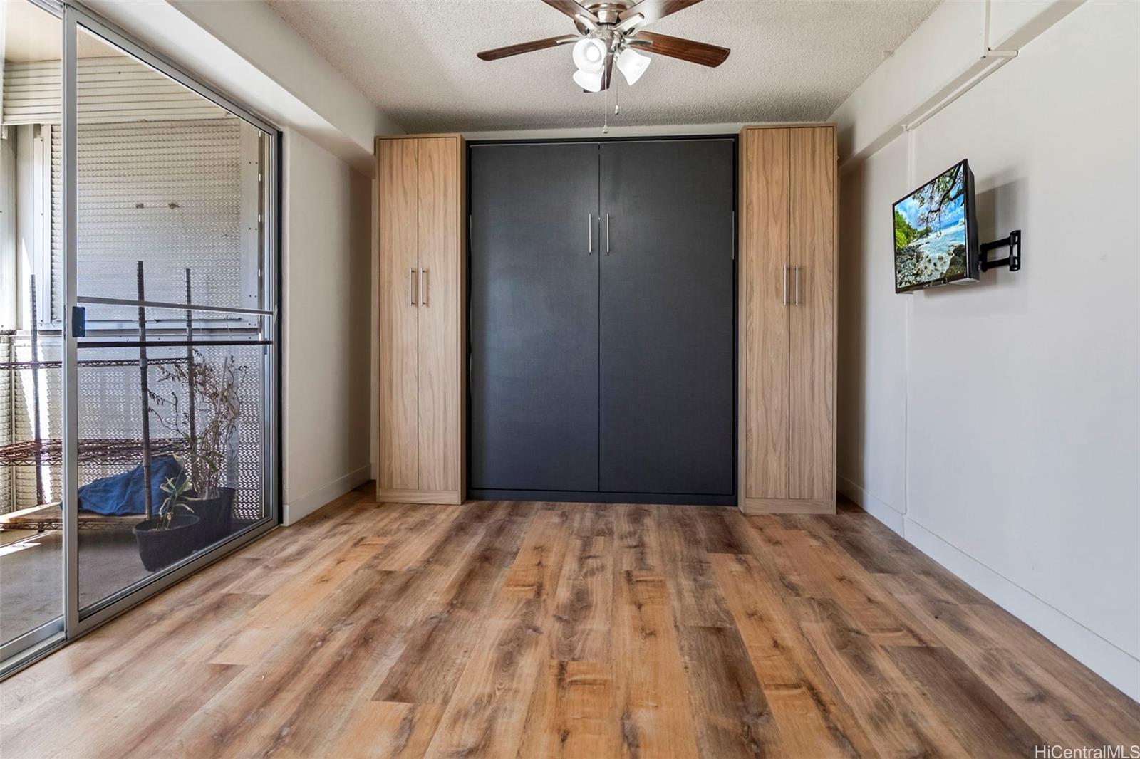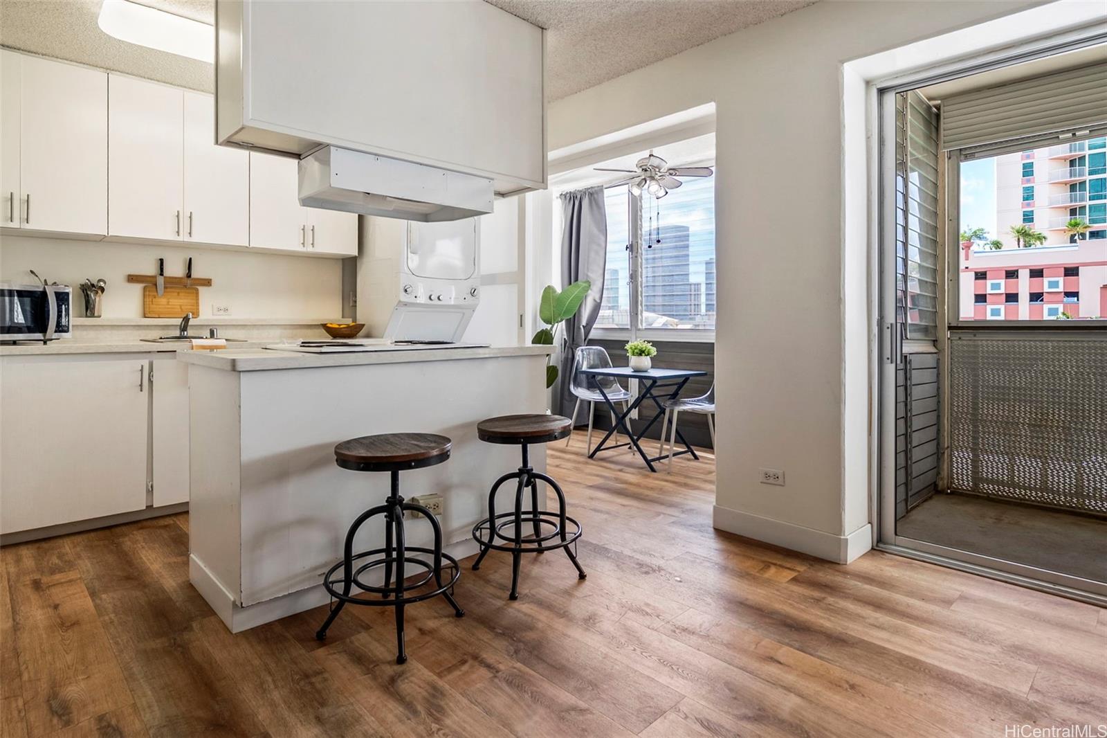 Have you been searching for a centrally located studio that checks all the boxes? Welcome to King Manor, where convenience and comfort meet in the heart of Honolulu! This bright and thoughtfully updated studio condo features luxury vinyl plank flooring throughout, an open floor plan with custom privacy panels and a Murphy bed, offering flexible living options. The kitchen has been refreshed with quartz countertops, modern fixtures, and freshly painted cabinets, while the bathroom includes a new vanity and reglazed tile for a clean, modern feel. Enjoy the rare convenience of a new in-unit washer and dryer, covered parking, and low maintenance fees. Relax and enjoy cool breezes on your private lanai overlooking the city, or take advantage of building amenities including a pool, sauna, and recreation deck. Perfectly situated near downtown, Ala Moana, hospitals, and freeway access, this home is ideal for first-time buyers, investors, or anyone seeking an urban lifestyle in paradise. Experience the best of city living at 818 S. King St. #704—a stylish, move-in-ready condo offering unbeatable value and location.