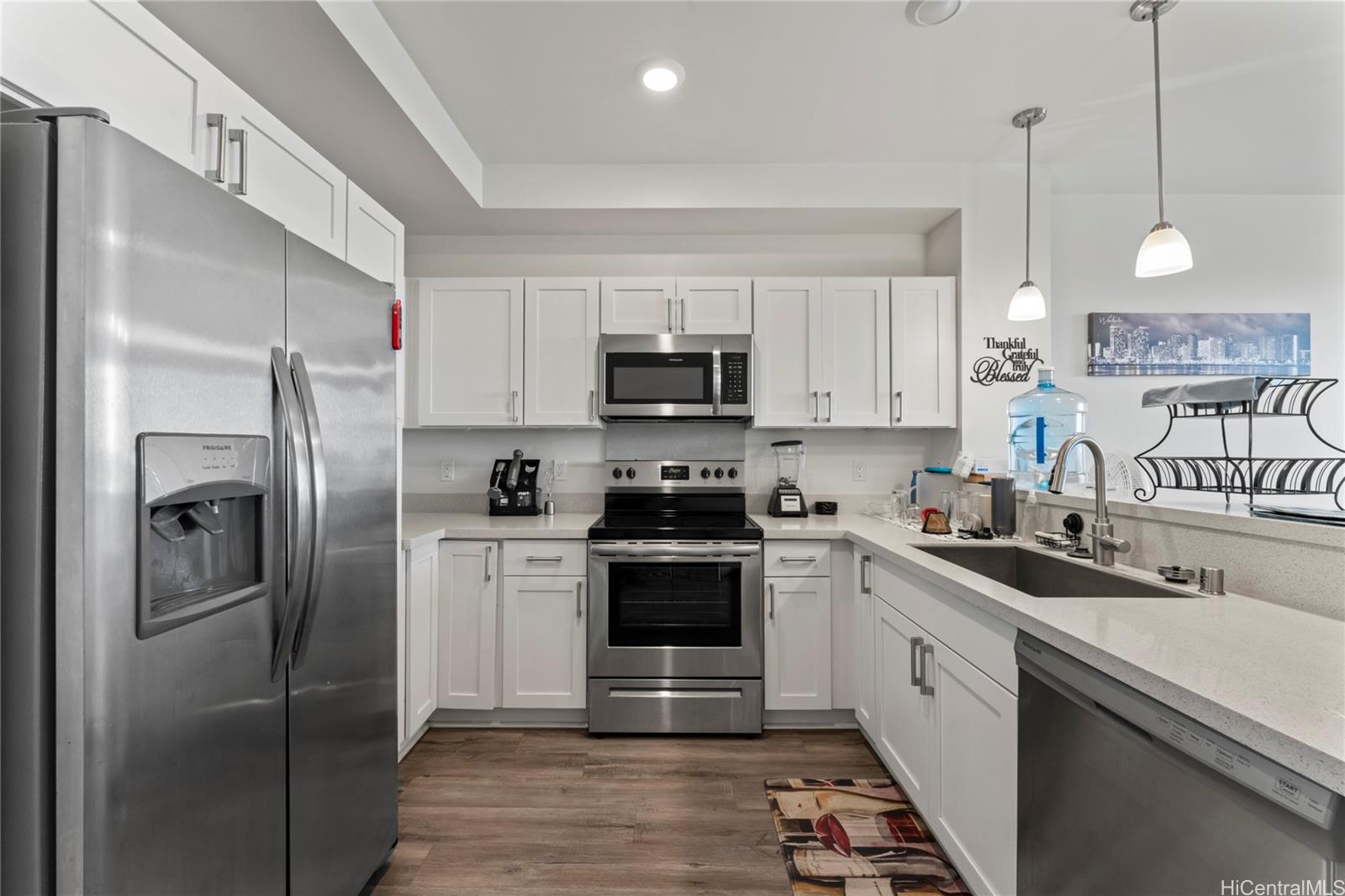 Corner 2-Bed, 2-Bath Condo – Kohina at Ho‘opiliRare corner unit with wraparound layout, abundant natural light, and sunset views from both bedrooms and the lanai. Near Ho‘opili’s Festival Street, offering shopping, dining, and community events.VA-approved, single-level condo on the second floor of a secure building. Features include in-unit washer/dryer, split ACs in every room, quartz countertops, white shaker cabinets, and stainless steel appliances.Two uncovered parking stalls plus guest parking. Low maintenance fees. Convenient to UH West O‘ahu, highways, and the Skyline Light Rail.Disclaimer: Photos were taken before the property was rented. All photos have been digitally enhanced or digitally staged.