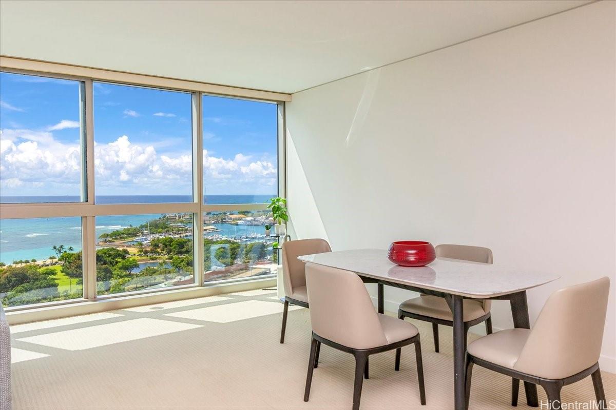 Perched high above the city, this exquisite and well-maintained 2-bedroom, 2-bath residence offers 1,518 sq. ft. of refined living space. The expansive, rectangular living room is framed by floor-to-ceiling windows that fill the home with natural light and capture stunning partial ocean views. The thoughtfully designed layout provides both comfort and privacy. Each room is generously sized, while the primary suite features a luxurious en-suite bath with a double vanity and breathtaking Diamond Head views. The gourmet kitchen is both stylish and functional, equipped with high-end Viking appliances, a gas stove, and granite countertops. This well-maintained residence also includes two standard parking stalls. Enjoy resort-style living with an array of exceptional amenities: a recreation deck, two tennis courts, a heated pool, spas, a walking path, fitness center, billiard room, movie theater, media and conference rooms, concierge-like services, and 24-hour security. Perfectly located near Ala Moana Shopping Center, Beach Park, and Ward Village, this home offers the best of Honolulu’s vibrant urban lifestyle, world-class dining, shopping, and entertainment all just moments away.