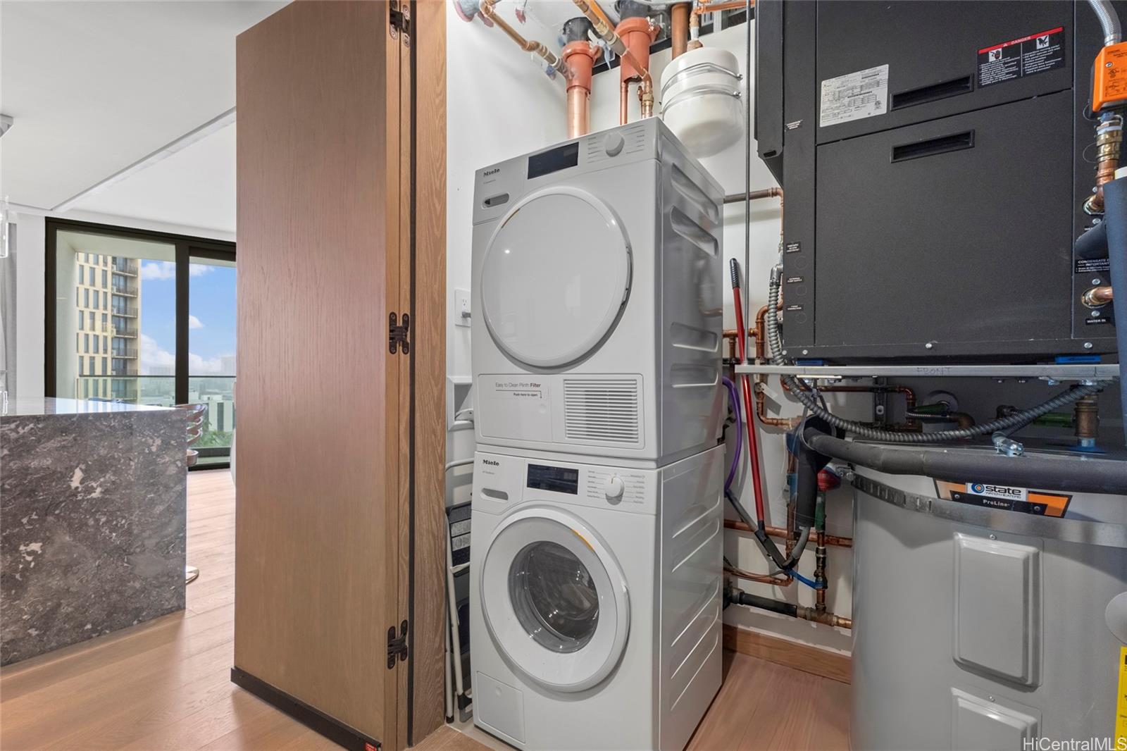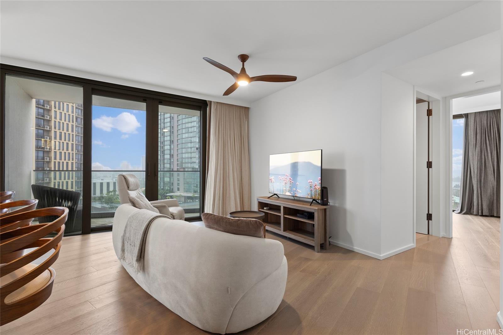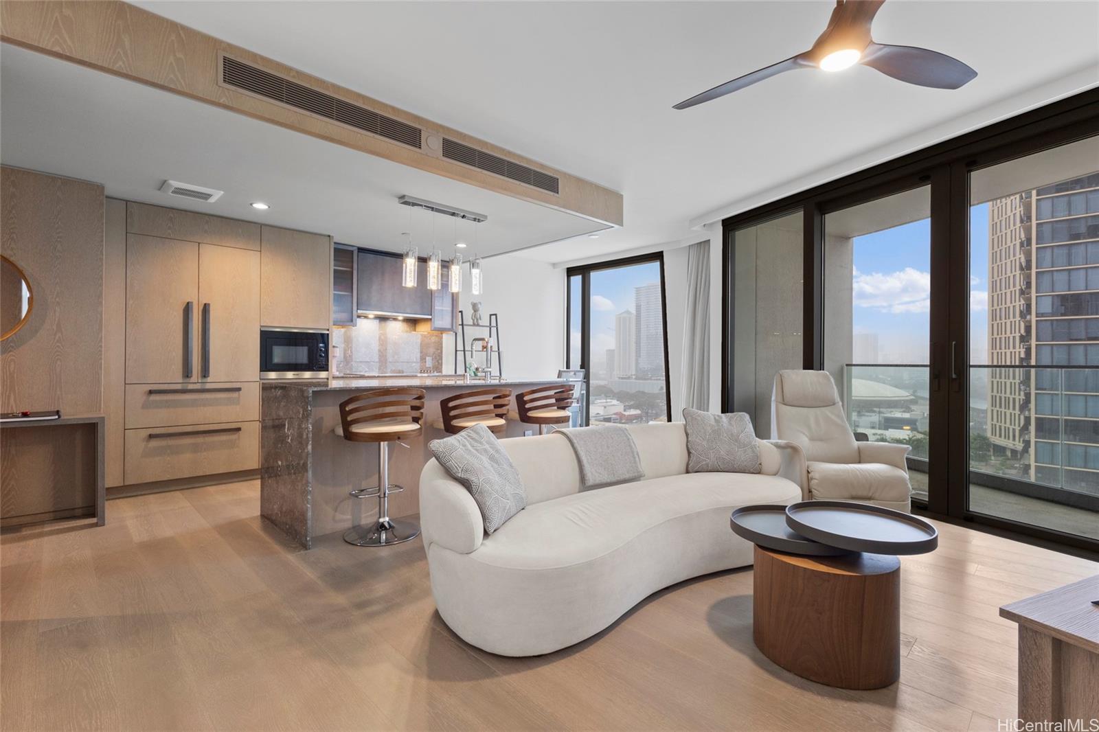 Experience the heights of urban sophistication in the heart of Ward Village. This 2-bedroom, 2-bathroom residence blends organic forms with modern luxury. Elegant 9-foot+ ceilings and floor-to-ceiling windows create a sense of dramatic volume, framing cinematic views of Victoria Ward Park and the Pacific horizon. The interior features warm hardwood flooring and a gourmet chef’s kitchen outfitted with a premium suite of Miele appliances, custom cabinetry, and sleek stone countertops. The open-concept layout flows seamlessly onto a private lanai, acting as a bridge between your serene sanctuary and the vibrant energy of Kakaako. Residents enjoy world-class, resort-style amenities, including a lap pool, two whirlpools, a state-of-the-art fitness pavilion, and a grand social lounge. Perfectly positioned in Honolulu’s most walkable neighborhood, you are steps from the flagship Whole Foods, elite dining, and Ala Moana Beach Park. Koula demonstrates the perfect blend of architectural brilliance and island ease. Book a private showing today!