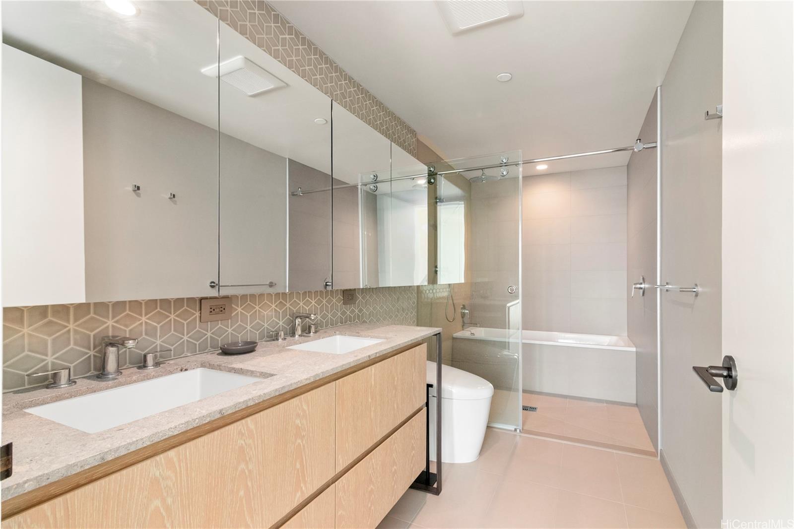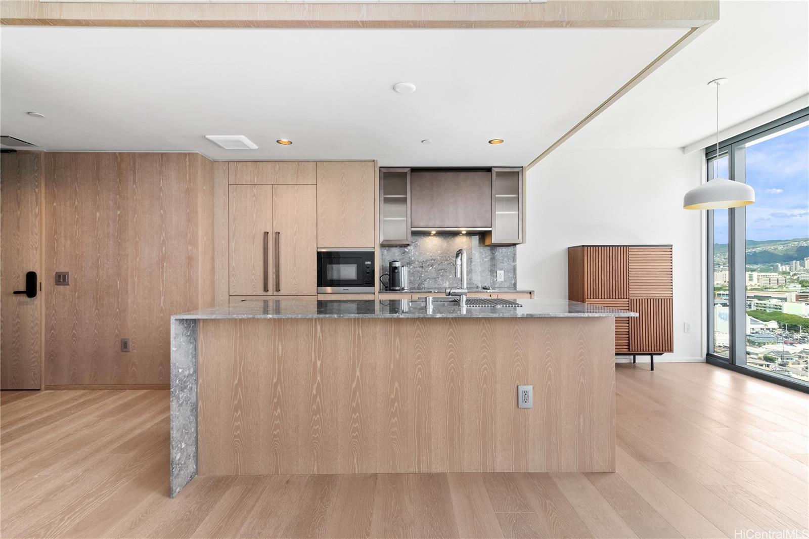 A great new price !! Built in 2021, this modern corner unit has sweeping views of the city, mountain and ocean. Two bedrooms, 2 bath, 1 parking with not one but two lanais. Motorized shades in all the rooms. Toto washlet in primary bedroom. Electric vehicle charger installed in parking spot. Enjoy in the building amenities with swimming pool, jacuzzis, sauna, exercise room, bbq areas, entertainment rooms and more. Great location close to Whole Foods, Ala Moana shopping center, movie theater, dining and entertainment.