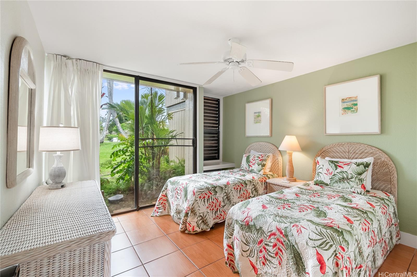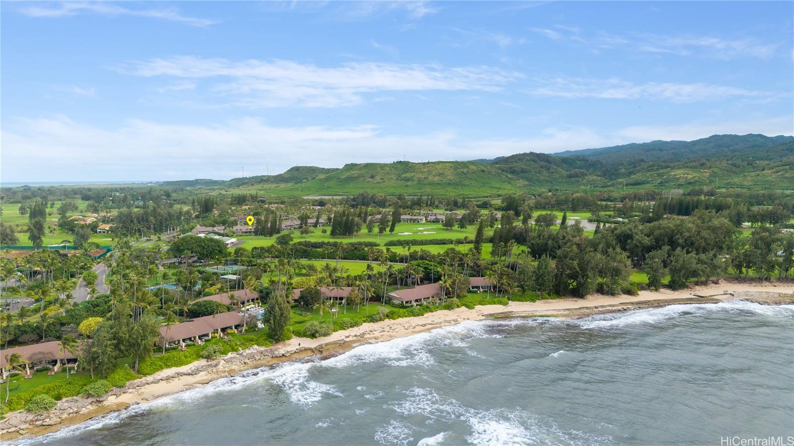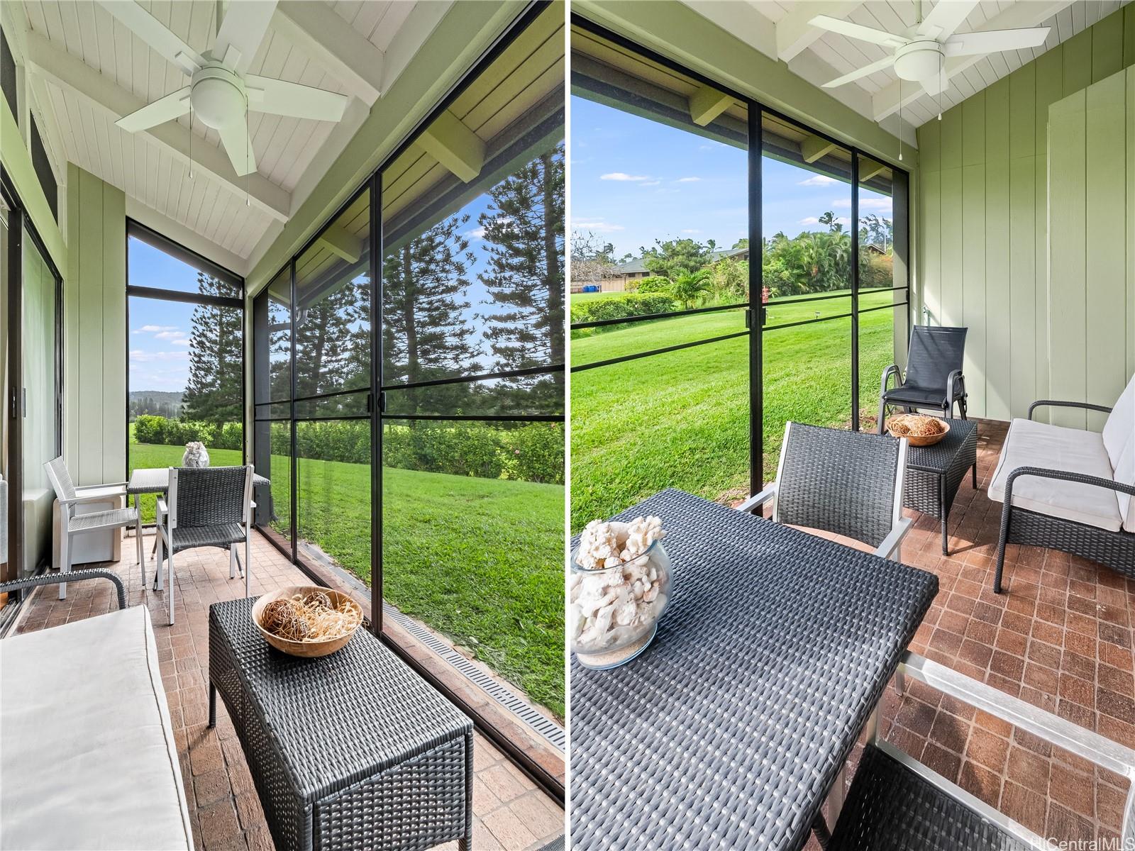 Highly desired ground floor unit and legal short-term rental in Kuilima Estates West at Turtle Bay on O?ahu’s North Shore. Ideally positioned on the 1st tee of the Fazio Course and just steps from the clubhouse, this 2-bedroom, 2-bath + loft home offers premier golf course frontage with beautiful views. The screened lanai enhances the indoor-outdoor island living. The well-maintained interior features tile flooring throughout, granite countertops, updated appliances, window A/C units in both bedrooms, ceiling fans, and a full-size washer and dryer. The flexible floor plan accommodates up to six guests with one king bed and four twin beds, offering versatility for personal use or short-term rental occupancy.Enjoy access to multiple swimming pools, BBQ areas, tennis, pickleball, and basketball courts, championship golf courses, and nearby beach access within the world-renowned Turtle Bay resort community. Whether used as a vacation retreat, second home, or legal short-term rental, this property offers the opportunity to experience the best of North Shore living.